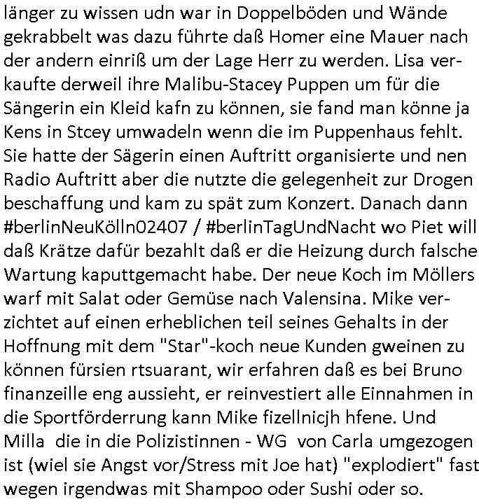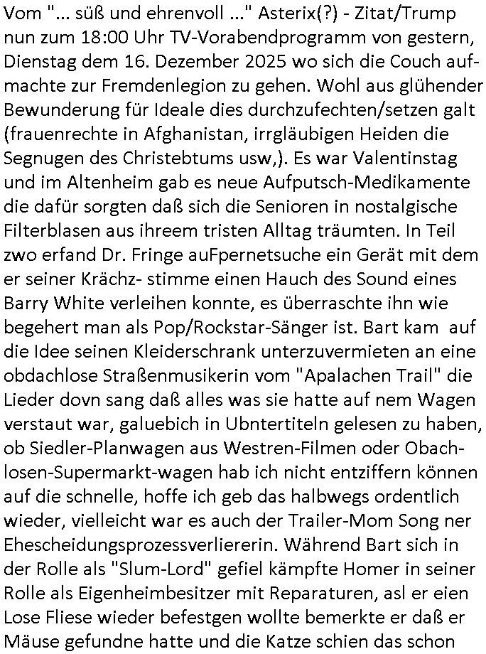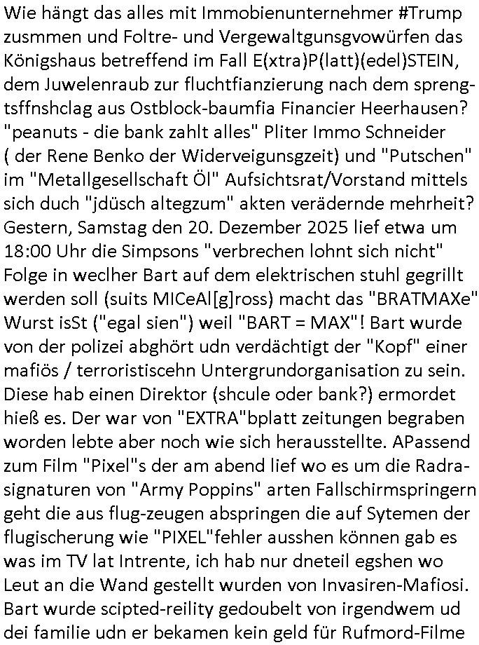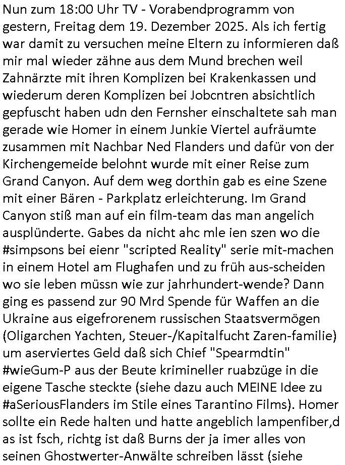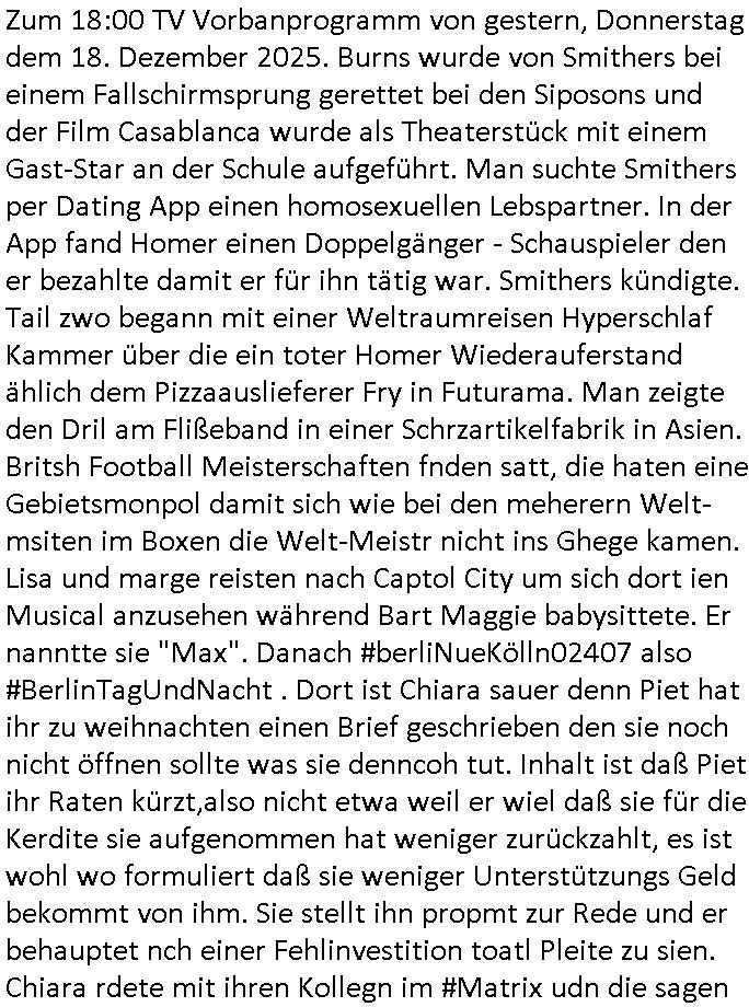 | Nun zum 18:00 Uhr TV - Vorabendprogramm von gestern, Montag dem 29. Dezember 2025 wo ich mir glücklicher-weise mal kein #berliNueKölln02407/ #berlinTagUndNacht und mir auch keinerlei 3sat #Kulturzeit ansehen musste, lediglch die #Simpsons. Anders als sonst erzählte eine "Stime aus dem Off" von Jazz und über Bluttransfusionen und "Whisper of Times" Polar-Eiswürfel die imprtert werdneosllten von Smithers. Burns erinnerte sich an Zeiten zurück in denen er noch große rauschende Fest gefeiert hatte. Ählich der "richie rich" fider wo er auf den "dopplets Lottchen" Bart trifft und diesem einredet seine neue, reiche Halbgeschwister Familie wolle ihn (Waise?) ermorden um an sein Geld, das Familienvmögen zu kommen. Es ist diese Folge wo Lenny urplötzlich zu viel Geld kommt und jedem, einem Vorwerk Vertretr gleich, einen Staubsagerrober besorgt. Aufder otilette eisn Luxushotels trifft er dann zufällig auf jemanden der genau aussieht wir er und tauscht mit ihm wie im "Erich Kästner" Roman "die Rollen". Das erinnert michienweng an dei [(Reklamations-)Weihnachts-]Film und TV Crews vonde Promihochzeute im Kindergarten in der Bad Homburg Ober-Erlenbacher Weingartenstraße und das in "Tic-Tac-Toe" Musik für die nchwelt fest-gehaten miese Verhalten von Bruckmaier, Hohmann udn andern asu der shcüleztung bei einem Pressmeeting mit großen Zteungen (Welt) und Fernsehen (darunter 3sat). Wo irgendeiene Ostbclok udnmarinsosldten Verbrecher-