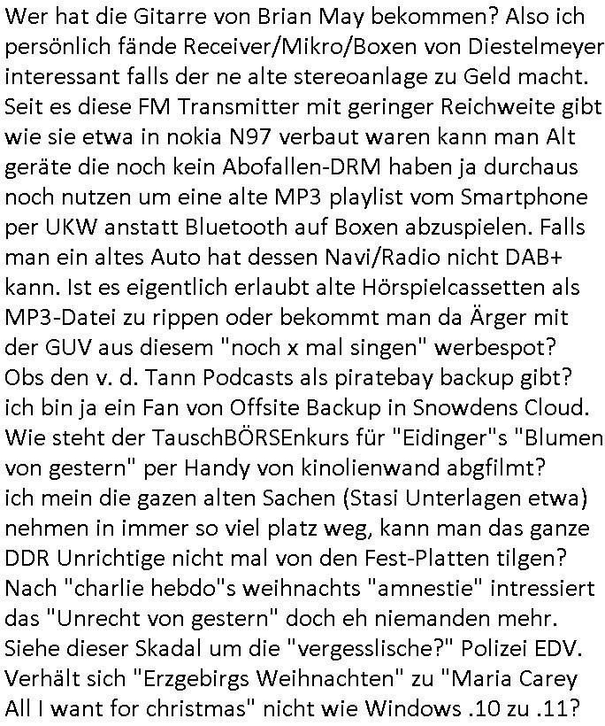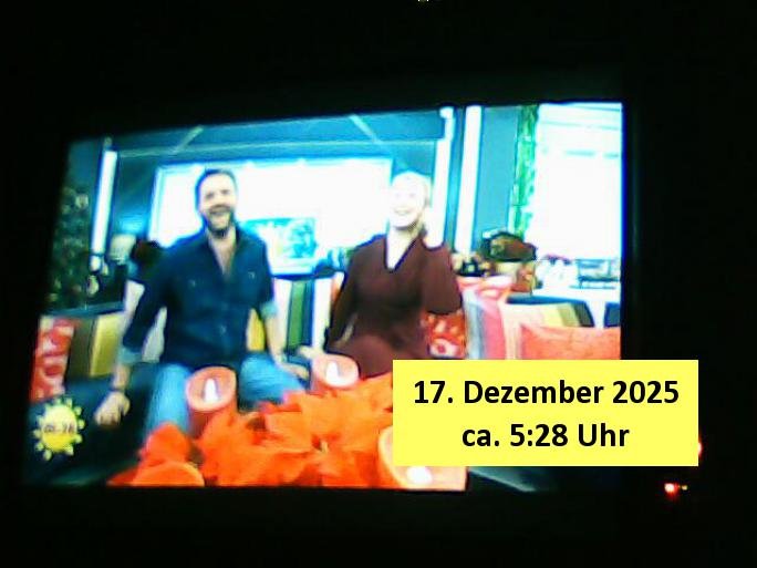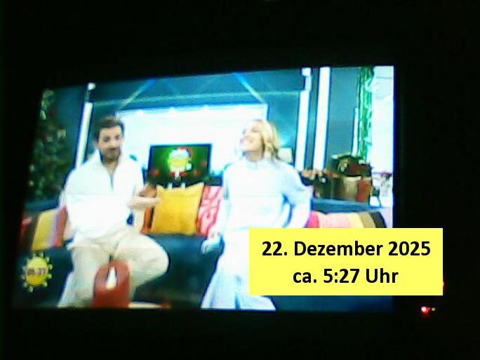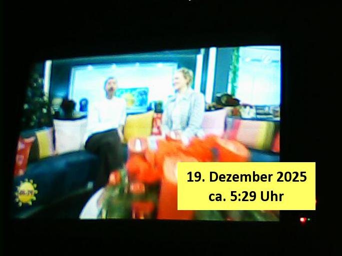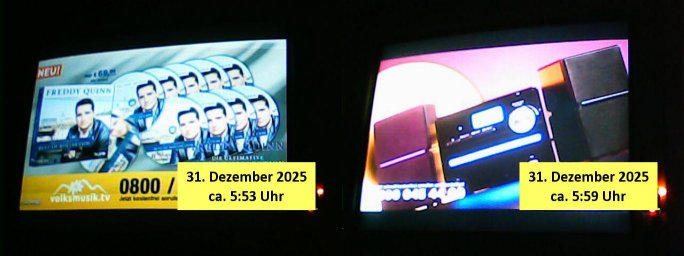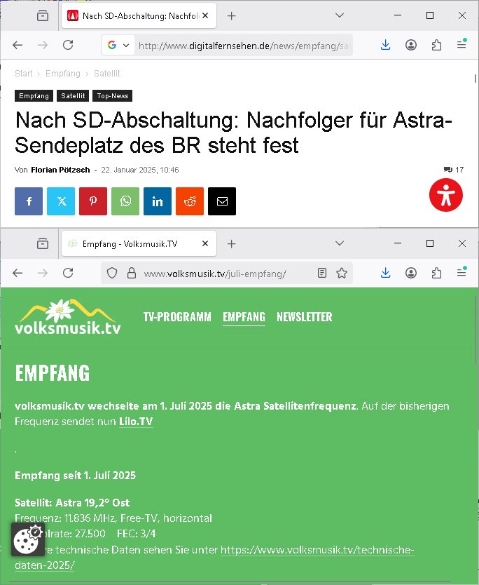 Um mich auf die neue Zeit umzugewöhen hab ich dann schon-mal umgeschaltet auf diesen Programmplatz wo früher das drite Programm vom BR in SD gesendet wurde Volksmusik und sowas.Dort bewirbt Freddy Quinn gerde in einer 0800er Cal-in-Show seine Weihnachtalbum - CDs (Wie bekomme ich die in meinen MP3 player USB-Port?) Wow,die dkenanalsesman kan sogar die passende Stereo Anlage zu dendtaräger mit dazukaufen fehlt nur noch ein Steramingtarif mit bewachtem Ökstrom-Rechenzentrum! Für den Fall das unsere Stasi auf piratebay/eMule meine Playlist mit Protestmusik mit subsvrsiven Texten abhört. Was nützt einem der beste (Modell #Lockerbie) Ghetto Balster wenns nirgendwo mehr Batterien zu kaufen gibt? Anyway: ich fin des ziemlch subtil den füheren Sendeplatz vom BR einen kommerzeilen volksmusik Sender zu geben. https://www.tvinfo.de/fernsehprogramm/2256733483-christoph-sieber-weitermachen https://www.tvinfo.de/fernsehprogramm/2281037465-mtv-in-the-mix http://www.digitalfernsehen.de/news/empfang/satellit/nach-sd-abschaltung-nachfolger-fuer-astra-sendeplatz-des-br-steht-fest-1132452/ https://www.volksmusik.tv/juli-empfang/ | |
