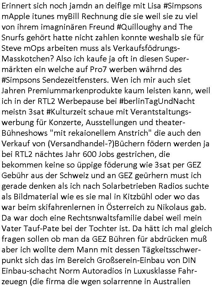 | Was denn nun ? schaltet irgendwer zu Sylvster um nach draußen auf die straße zu gehn und zu böllern vorüber-gehend sein TV-Gerät ab auf dem MTV läuft oder haben die #Simpsons Anwälte vor Gericht gewonnen daß nicht mehr gezeigt werden darf wie Marge Homer bei dieser Fremdgeh - Detektive Reality Show angemeldet hatte? Oder darf jetzt mal eine anderes als "ULIs ausWAHL" ("wa_l ulis schaut fern") diese Magneta-TV-Streaming Playlist im "lineares TV" Popaganda/Bespaßung fürs Volk asuwählen? "Joko Und Klass" vielleicht (Klage ./. Pro7)? Neu einstellen? Was sagt das die Personalabteilung zu? Muß der Campus wo das #Sat1Frühstsücksfernsehn dreht Nachbarn #berlinNueKölln02407/#berliTagUndNacht mehr platz einräumen? ISt mri ch gel, hauptsache dieser volksmusik Kanal der auf der führen SD-Frequenz des BR sendte beleibt (mit den Schallplattenkaufempfehlungen). Als ich das gelesen hab: Oh My God*ess, I was shocked! P.S.: Hat noch jemand gelesn daß Donald Trumps Presse-sprecherin schwanger ist? Was schenkt man so jemand als aufmerksamer Abeitgeber? Welche IGEL Lestung würde Simposn Mr Burns kaufen? Ein Abtreibungspille Lieferabo von der Online-Versadapotheke? Oder lieber eine praktische Muttermilchpumpe? Als Arbeitgeber sollte man ja stes darf bdcht daß die Mitarbeitenden nicht allzu lange aus "medizsichen Grüden" ausfallen. Harry/Meghan suche auch schon wieder "social media Fachkraft". Fals jemand nen Lückenbüsser McJob sucht.