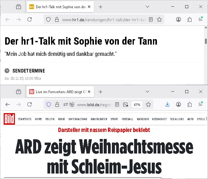https://www.digitalfernsehen.de/news/inhalte/fernsehen/achtung-fake-news-warum-mtv-nicht-eingestellt-wird-1168921/ https://www.derstandard.at/story/3000000302243/streaming-killed-the-video-star-mtv-stellt-musikkanaele-ein https://www.bild.de/unterhaltung/tv-fernsehformate/das-ende-eines-kultsenders-mtv-wird-zum-jahresende-abgeschaltet-695227a2f6fc544dba9b61f5 https://www.bild.de/politik/ausland-und-internationales/weihnachtswunder-im-weissen-haus-trump-sprecherin-ist-wieder-schwanger-694eebd2ba368aa0126a3fd0 https://www.bild.de/unterhaltung/stars-und-leute/meghan-und-harry-verlieren-elften-pr-profi-in-nur-fuenf-jahren-69500f29ba368aa0126a49e0 Wasn los? Keine "Negermusik" mehr im freeTV? Das gibt Krieg! https://www.telekom.com/de/medien/medieninformationen/detail/magentatv-begeistert-mit-netflix-hit-stranger-things-1099512 | |