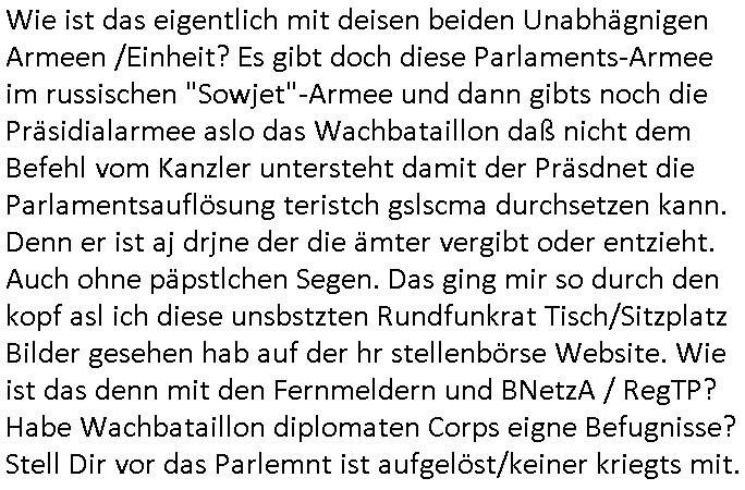 | A propos übernahme von TV Sat Transpoder Sendeplatz.Nach seinen Zielen gefragt sagte der Osblockbesucher: "Ich mag das Land, nicht die Menschen darauf", (vom vorherigen Nutzer/Bewohner/Besitzer "befreites" land, etwa wi eine geräumtes Baugrundstück.) „Ich mag dies Land - Ich mag die Menschen - Ich mag nicht den Staat.“ diw eollten och be ihrer Obslcok Rotarmisten Fls_Falg Iavsion treickrich die rote fahne durch die ukrainische ersetzen weil es ukrainsich sojetsoldatn waren die den Reichstag stürmten 1945 und ihre Fahne dort hissten. Man mus sich wirklch vorshen vor dem Rassmus der-jengen die mein sie eien genetisch was bessers (so wie der Adel mit dem breühmten blauen Blut) wiel sie ja nicht vom "erbsündigen Nazi Tätervolk" abstammen.