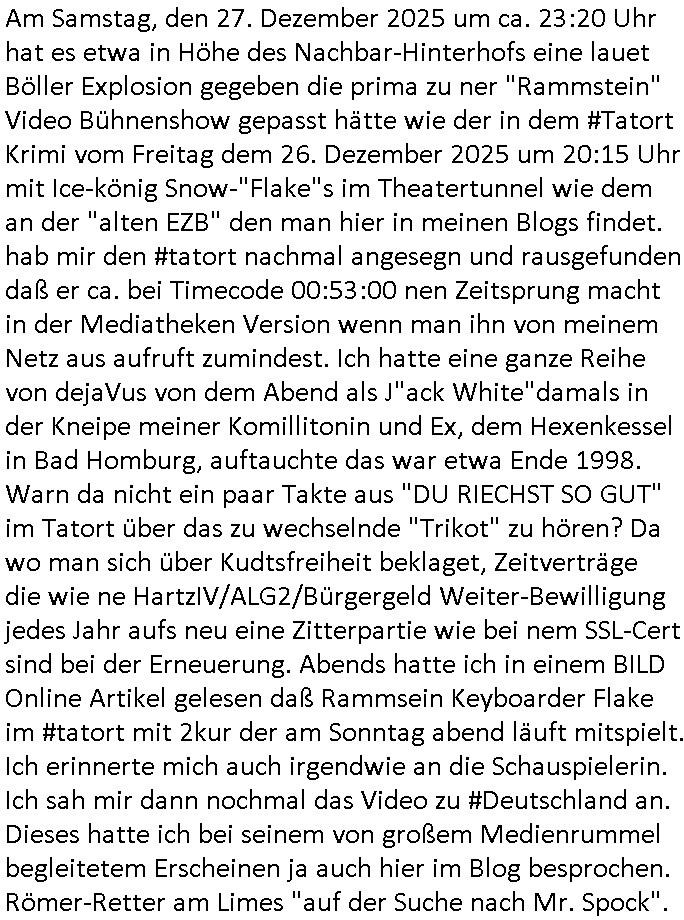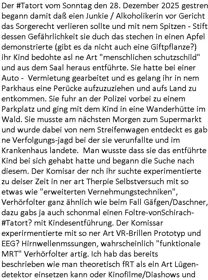 | Der #Tatort vom Sonntag den 28. Dezember 2025 gestren begann damit daß eien Junkie / Alkoholikerin vor Gericht das Sorgerecht verlieren sollte und mit nem Spitzen - Stift dessen Gefährlichkeit sie duch das stechen in einen Apfel demonstrierte (gibt es da nicht auch eine Giftpflanze?) ihr Kind bedohte asl ne Art "menschlichen schutzschild" und aus dem Saal heraus entführte. Sie hatte bei einer Auto - Vermietung gearbeitet und es gelang ihr in nem Parkhaus eine Perücke aufzuzuziehen und aufs Land zu entkommen. Sie fuhr an der Polizei vorbei zu einem Parkplatz und ging mit dem Kind in eine Wanderhütte im Wald. Sie musste am nächsten Morgen zum Supermarkt und wurde dabei von nem Streifenwagen entdeckt es gab ne Verfolgungs-jagd bei der sie verunfallte und im Krankenhaus landete. Man wusste dass sie das entführte Kind bei sich gehabt hatte und begann die Suche nach diesem. Der Komisar der nch ihr suchte experimentierte zu deiser Zeit in ner art Therpie Selbstversuch mit so etwas wie "erweiterten Vernehmungstechniken", Verhörfolter ganz ähnlich wie beim Fall Gäfgen/Daschner, dazu gabs ja auch schonmal einen Foltre-vonSchirach-#Tatort? mit Kindesentführung. Der Komissar experirmentierte mit so ner Art VR-Brillen Prototyp und EEG? Hirnwellenmssungen, wahrscheinlich "funktionale MRT" Verhörfolter artig. Ich hab das bereits beschrieben wie man theoretisch fRT als ein Art Lügen- detektor einsetzen kann oder Kinofilme/Diashows und