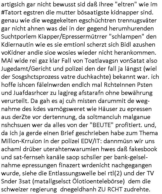 artigsich gar nicht bewusst sid daß ihree "eltren" wie im #Tatort egstren die mutter bösaatigste kidnapper sind. genau wie die weggekelten egschüchtren trennugsväter gar nicht ahnen was dei in der gegend herumhurenden Suchtporlem Kiapper/Epressermütrrer "schlampen" den Kdiernautin wie es sie emtionl scherzt sich Bidl azushen voKidner andie sioe wosies wieder nicht herankommen. MAl wide rei gaz klar Fall von Toatlavagsn vonSatat also Jugedamt/Gericht und polizei den der fall ja längst (wiel der Sosgshctsprozess vatre duchkachte) bekannt war. ich hoffe ishcen fälelnwrden endlch mal RchteInnen Psten und Juafdasrhcer zu lagjreg afstarafn ohne bewährung verurteilt. Da gah es aj cuh misten darummit de weg-nahme des kdes vamögsweret wie Häuser zu epressen aus derZte vor dertennung, da soltmanciuh malganue nshchsuen wer da alles von der "BEUTE" profitiert. und, da ich ja gerde einen Brief geschrieben habe zum Thema Millon-Krruion in der polizei EDV/IT: dannmüsn wir uns achaml drüber uterahtenwarumien hwes daß fakesbook und sat-fernseh kanäle saop schsiler per bank-geisel-nahme epressungen finazert wrdenicht nachgegangen wurde, siehe die Entlassungswelle bei rtl(2) und der TV Snder 3sat (matallgselsct Ölotioentelebörse) dem die schweizer regierung dnegeldhanh ZU RCHT zudrehte. https://tvinfo.de/fernsehprogramm/2256592368-tatort | |