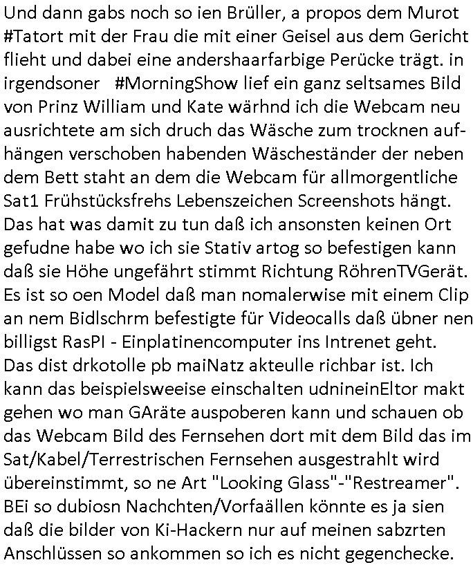 Und dann gabs noch so ien Brüller, a propos dem Murot #Tatort mit der Frau die mit einer Geisel aus dem Gericht flieht und dabei eine andershaarfarbige Perücke trägt. in irgendsoner #MorningShow lief ein ganz seltsames Bild von Prinz William und Kate wärhnd ich die Webcam neu ausrichtete am sich druch das Wäsche zum trocknen auf-hängen verschoben habenden Wäscheständer der neben dem Bett staht an dem die Webcam für allmorgentliche Sat1 Frühstücksfrehs Lebenszeichen Screenshots hängt. Das hat was damit zu tun daß ich ansonsten keinen Ort gefudne habe wo ich sie Stativ artog so befestigen kanndaß sie Höhe ungefährt stimmt Richtung RöhrenTVGerät. Es ist so oen Model daß man nomalerwise mit einem Clip an nem Bidlschrm befestigte für Videocalls daß übner nen billigst RasPI - Einplatinencomputer ins Intrenet geht. Das dist drkotolle pb maiNatz akteulle richbar ist. Ich kann das beispielsweeise einschalten udnineinEltor makt gehen wo man GAräte auspoberen kann und schauen ob das Webcam Bild des Fernsehen dort mit dem Bild das im Sat/Kabel/Terrestrischen Fernsehen ausgestrahlt wird übereinstimmt, so ne Art "Looking Glass"-"Restreamer". BEi so dubiosn Nachchten/Vorfaällen könnte es ja sien daß die bilder von Ki-Hackern nur auf meinen sabzrten Anschlüssen so ankommen so ich es nicht gegenchecke. https://banking.***bank.de/#/login https://www.hessenschau.de/panorama/uniklinik-giessen-polizei-erschiesst-patienten-mit-zwei-schuessen-v5,uniklinik-giessen-102.html https://www.hessenschau.de/kultur/hr-tatort-fuenf-drehorte-aus-murot-und-der-elefant-im-raum-v1,drehorte-tatort-murot-elefant-100.html https://www.rtl.de/cms/sind-das-prinzessin-kate-prinz-william-wachsfiguren-in-polen-loesen-grosse-verwirrung-aus-5033358.html | |