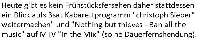 | Heute gibt es kein Frühstücksfersehen daher stattdessen ein Blick aufs 3sat Kabarettprogramm "christoph Sieber" weitermachen" und "Nothing but thieves - Ban all the music" auf MTV "in the Mix" (so ne Dauerfernshendung).