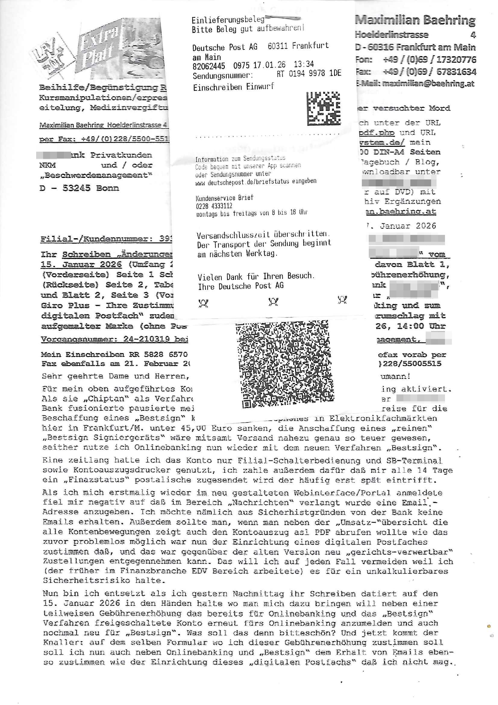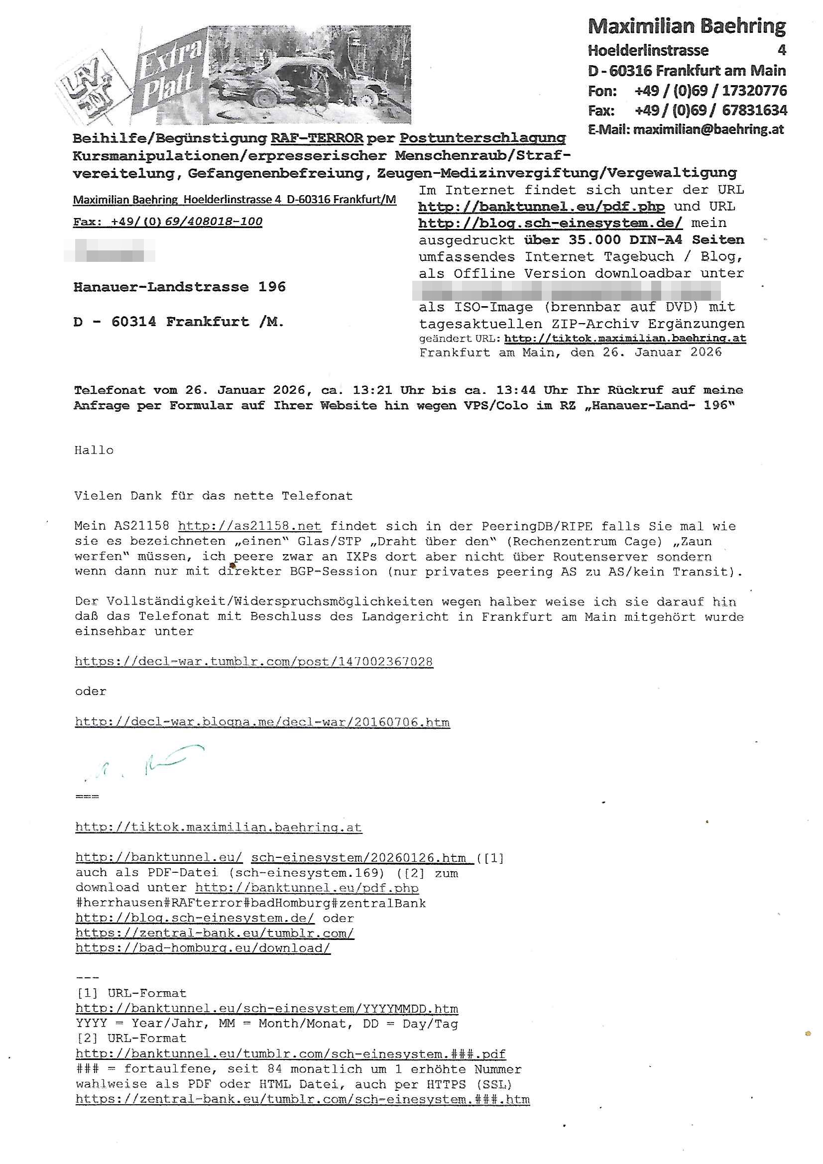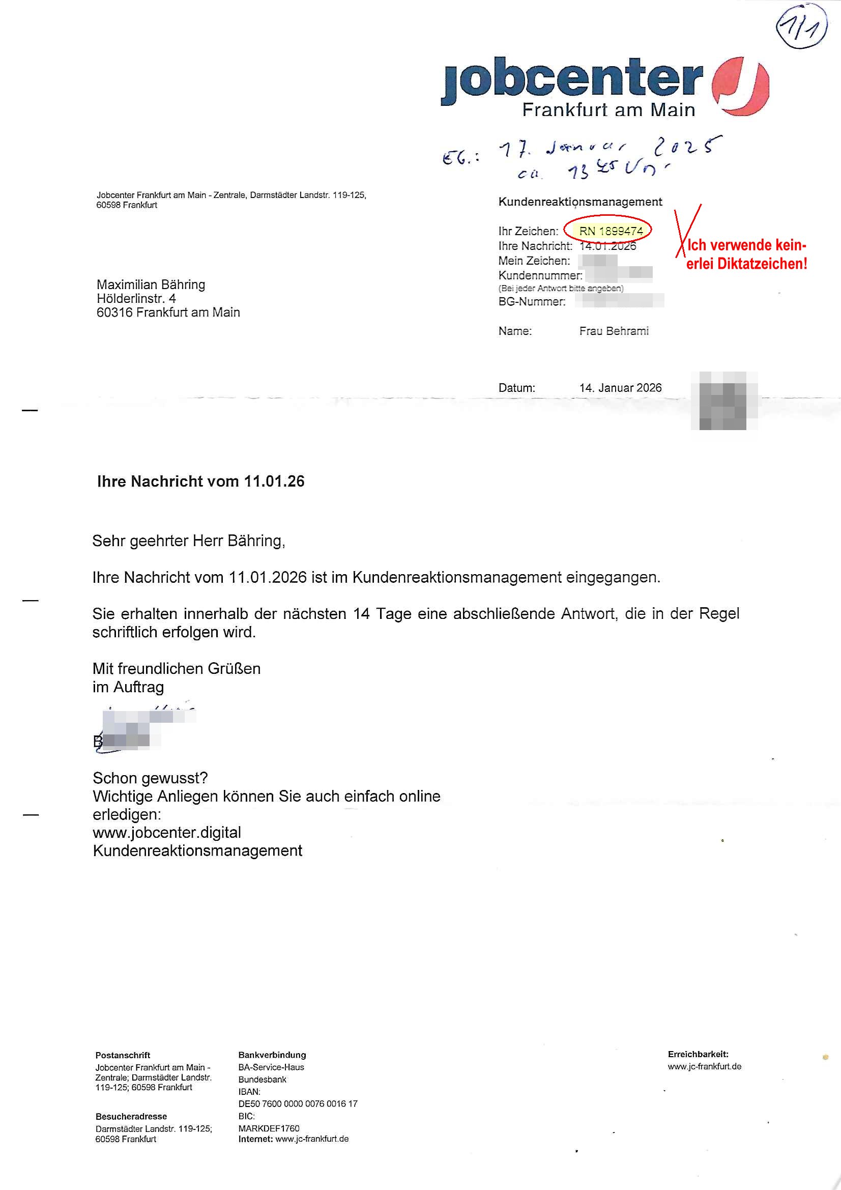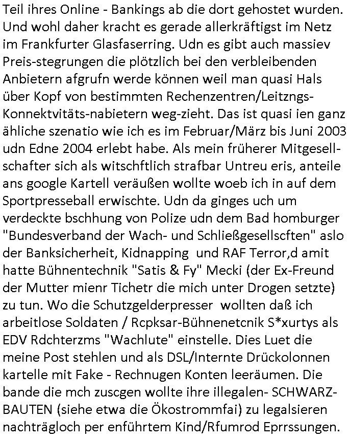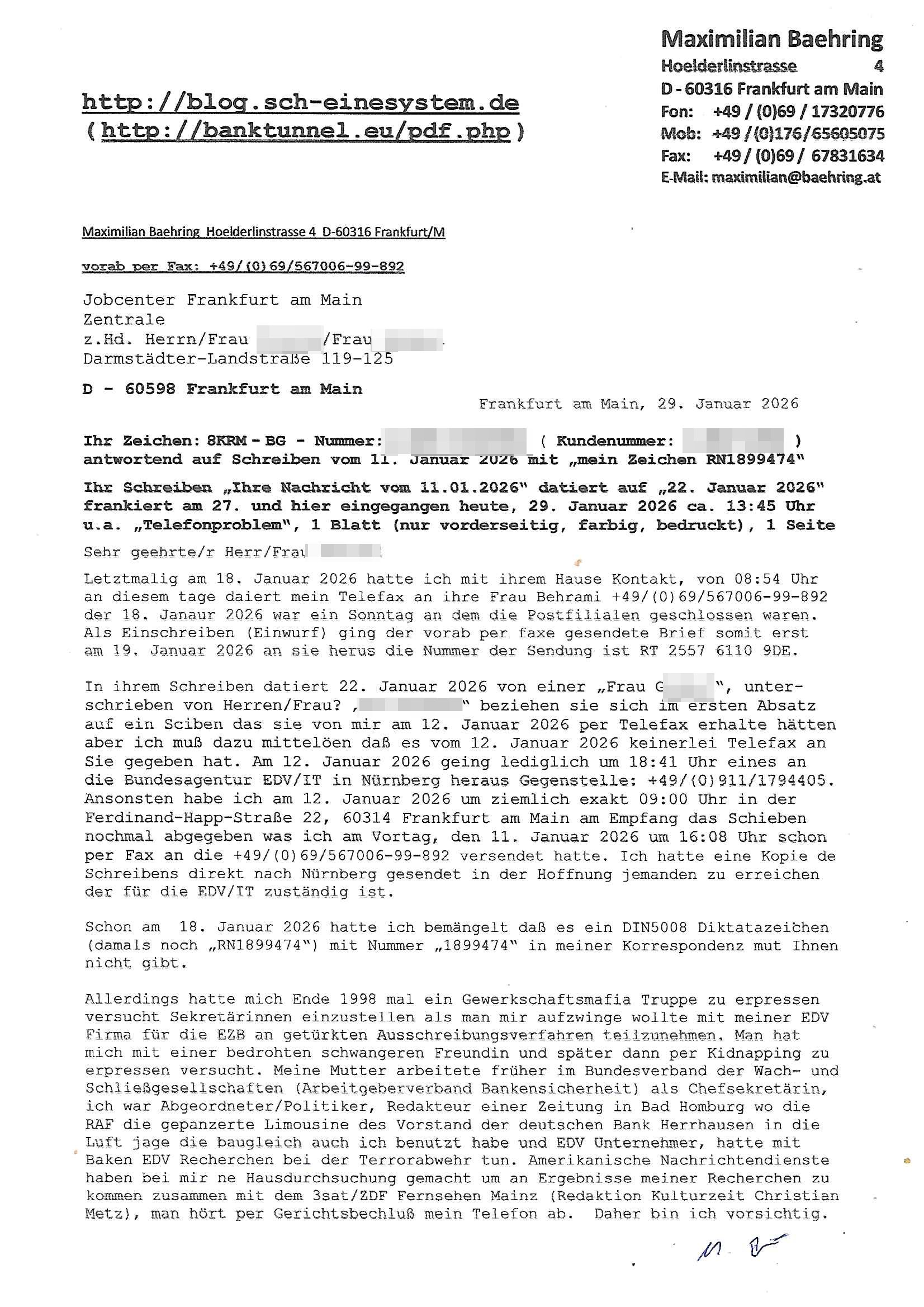 ( http://banktunnel.eu/pdf.php ) Maximilian Baehring Hoelderlinstrasse 4 D-60316 Frankfurt/M vorab per Fax: +49/(0)69/567006-99-892 Jobcenter Frankfurt am Main Zentrale z.Hd. Herrn/Frau D***k/Frau G***l Darmstädter-Landstraße 119-125 D - 60598 Frankfurt am Main Frankfurt am Main, 29. Januar 2026 Ihr Zeichen: 8KRM - BG - Nummer: ****( Kundenummer: *** ) antwortend auf Schreiben vom 11. Januar 2026 mit „mein Zeichen RN1899474“ Ihr Schreiben „Ihre Nachricht vom 11.01.2026“ datiert auf „22. Januar 2026“ frankiert am 27. und hier eingegangen heute, 29. Januar 2026 ca. 13:45 Uhr u.a. „Telefonproblem“, 1 Blatt (nur vorderseitig, farbig, bedruckt), 1 Seite Sehr geehrte/r Herr/Frau D***! Letztmalig am 18. Januar 2026 hatte ich mit ihrem Hause Kontakt, von 08:54 Uhr an diesem tage daiert mein Telefax an ihre Frau Behrami +49/(0)69/567006-99-892 der 18. Janaur 2026 war ein Sonntag an dem die Postfilialen geschlossen waren. Als Einschreiben (Einwurf) ging der vorab per faxe gesendete Brief somit erst am 19. Januar 2026 an sie herus die Nummer der Sendung ist RT 2557 6110 9DE. In ihrem Schreiben datiert 22. Januar 2026 von einer „Frau Gunkel“, unter-schrieben von Herren/Frau? „Uli Dvorak“ beziehen sie sich im ersten Absatz auf ein Sciben das sie von mir am 12. Januar 2026 per Telefax erhalte hätten aber ich muß dazu mittelöen daß es vom 12. Januar 2026 keinerlei Telefax an Sie gegeben hat. Am 12. Januar 2026 geing lediglich um 18:41 Uhr eines an die Bundesagentur EDV/IT in Nürnberg heraus Gegenstelle: +49/(0)911/1794405. Ansonsten habe ich am 12. Januar 2026 um ziemlich exakt 09:00 Uhr in der Ferdinand-Happ-Straße 22, 60314 Frankfurt am Main am Empfang das Schieben nochmal abgegeben was ich am Vortag, den 11. Januar 2026 um 16:08 Uhr schon per Fax an die +49/(0)69/567006-99-892 versendet hatte. Ich hatte eine Kopie de Schreibens direkt nach Nürnberg gesendet in der Hoffnung jemanden zu erreichen der für die EDV/IT zuständig ist. Schon am 18. Januar 2026 hatte ich bemängelt daß es ein DIN5008 Diktatazeichen (damals noch „RN1899474“) mit Nummer „1899474“ in meiner Korrespondenz mut Ihnen nicht gibt. Allerdings hatte mich Ende 1998 mal ein Gewerkschaftsmafia Truppe zu erpressen versucht Sekretärinnen einzustellen als man mir aufzwinge wollte mit meiner EDV Firma für die EZB an getürkten Ausschreibungsverfahren teilzunehmen. Man hat mich mit einer bedrohten schwangeren Freundin und später dann per Kidnapping zu erpressen versucht. Meine Mutter arbeitete früher im Bundesverband der Wach- und Schließgesellschaften (Arbeitgeberverband Bankensicherheit) als Chefsekretärin, ich war Abgeordneter/Politiker, Redakteur einer Zeitung in Bad Homburg wo die RAF die gepanzerte Limousine des Vorstand der deutschen Bank Herrhausen in die Luft jage die baugleich auch ich benutzt habe und EDV Unternehmer, hatte mit Baken EDV Recherchen bei der Terrorabwehr tun. Amerikanische Nachrichtendienste haben bei mir ne Hausdurchsuchung gemacht um an Ergebnisse meiner Recherchen zu kommen zusammen mit dem 3sat/ZDF Fernsehen Mainz (Redaktion Kulturzeit Christian Metz), man hört per Gerichtsbechluß mein Telefon ab. Daher bin ich vorsichtig. | |