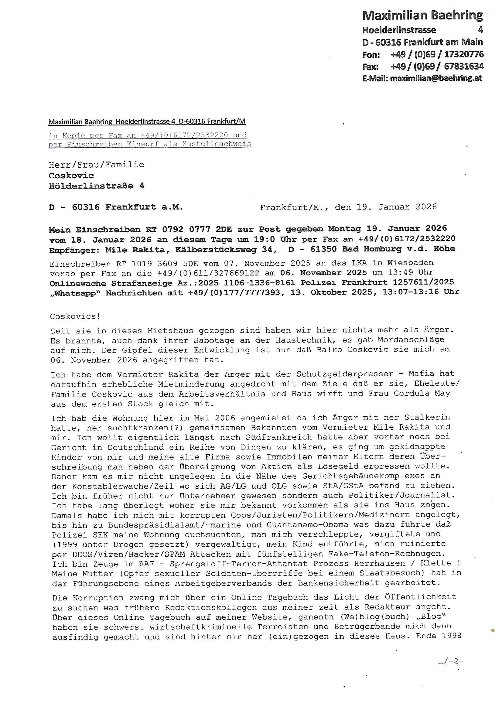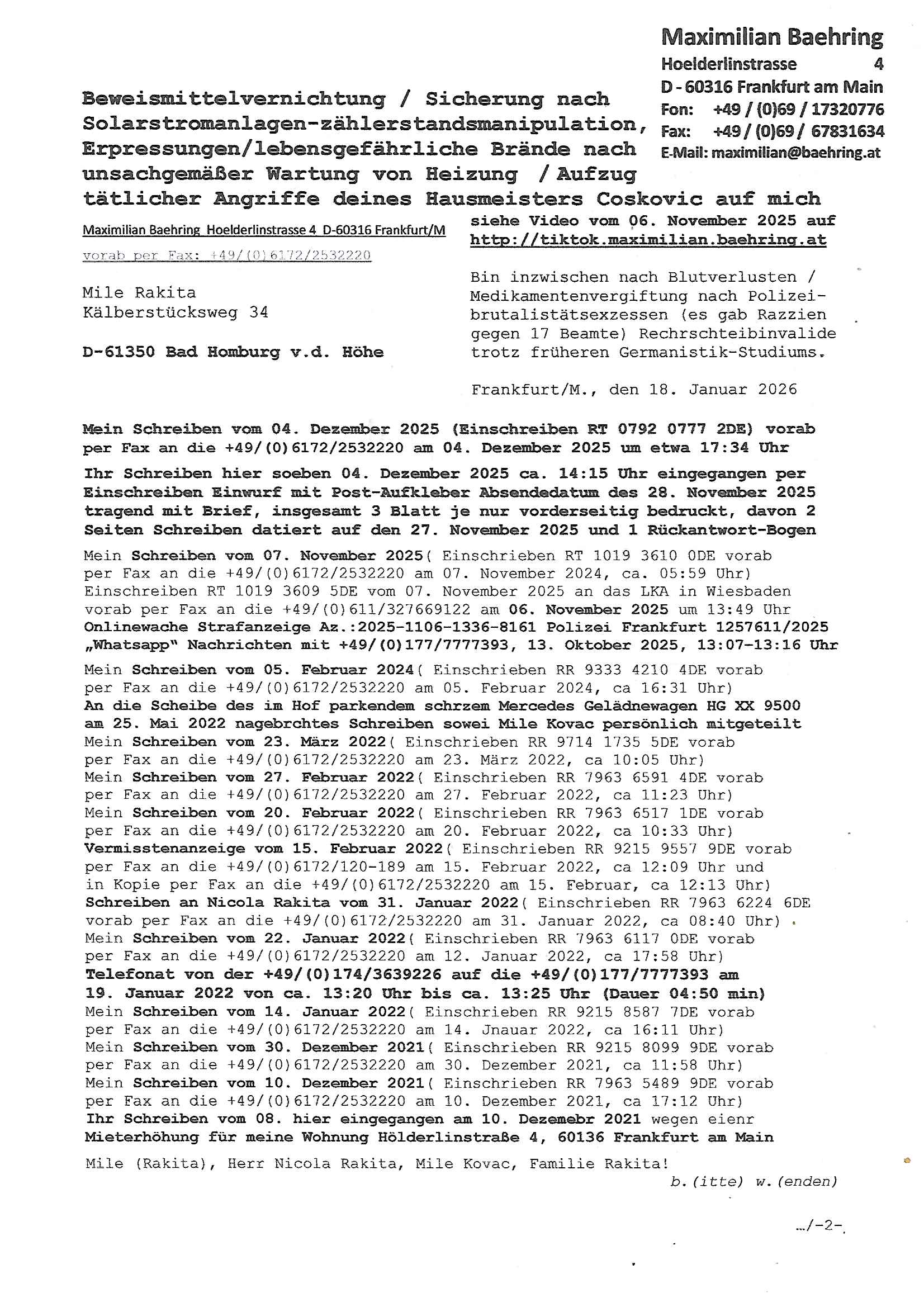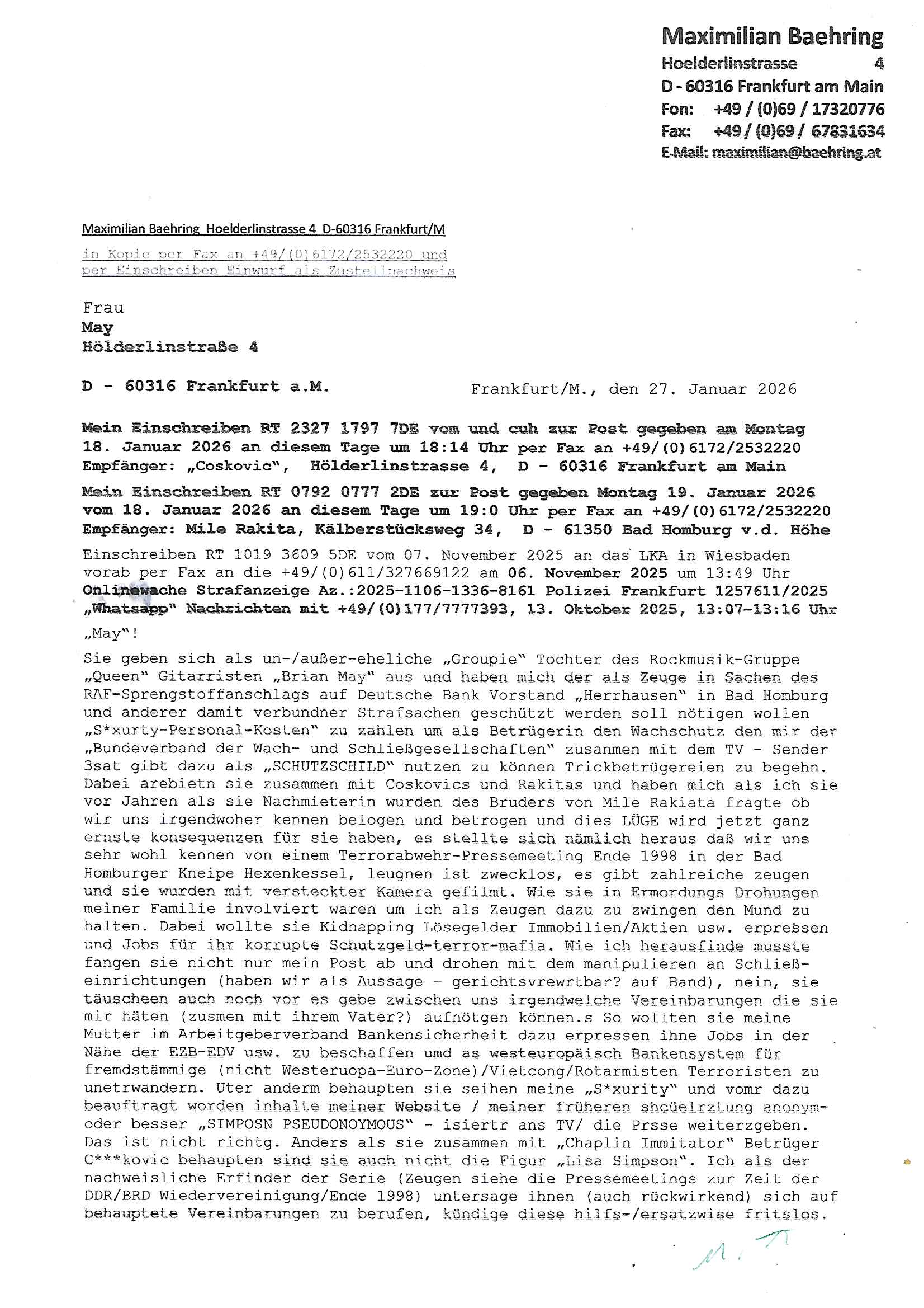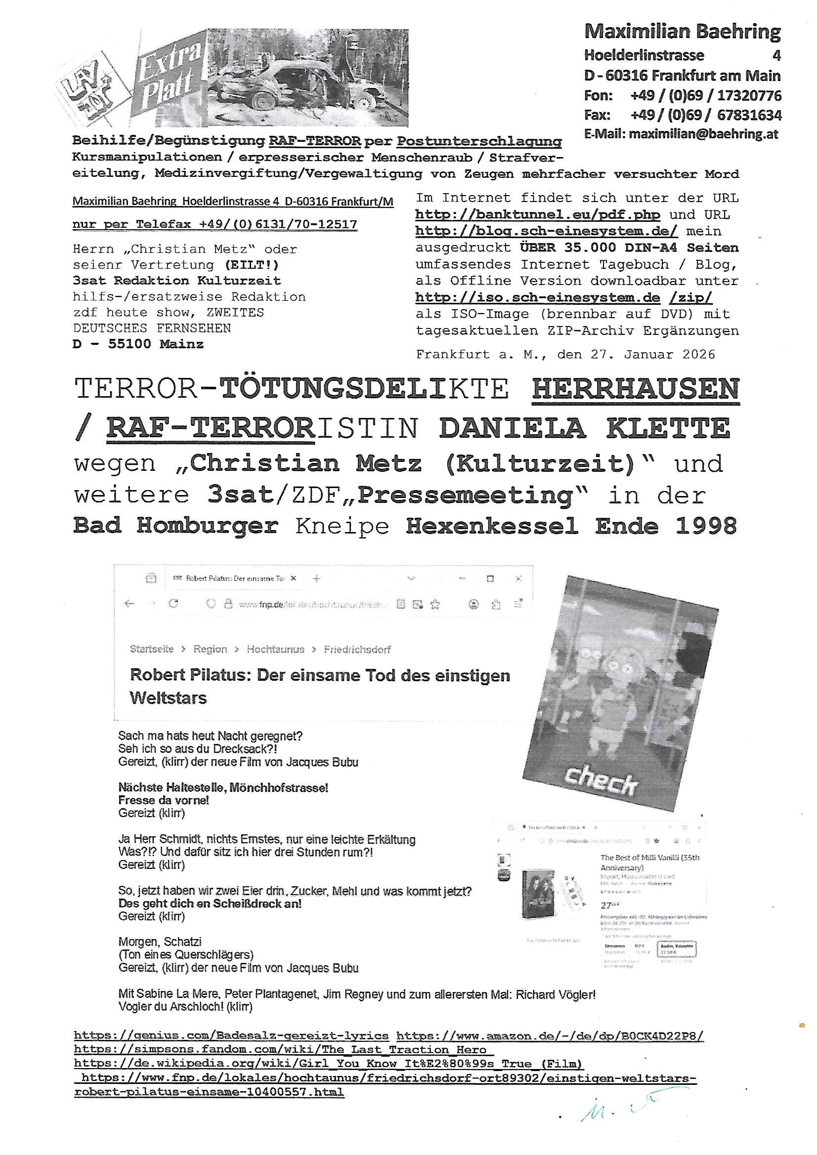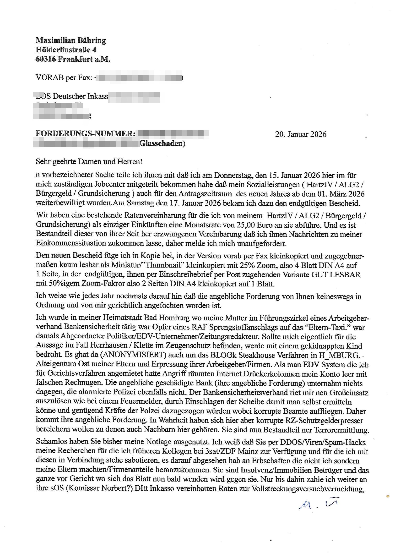 ( http://banktunnel.eu/pdf.php ) Maximilian Baehring Hoelderlinstrasse 4 D-60316 Frankfurt/M vorab per Fax: +49/(0)69/567006-99-892 Jobcenter Frankfurt am Main Zentrale z.Hd. Herrn/Frau D***k/Frau G***l Darmstädter-Landstraße 119-125 D - 60598 Frankfurt am Main Frankfurt am Main, 29. Januar 2026 Ihr Zeichen: 8KRM - BG - Nummer: ****( Kundenummer: *** ) antwortend auf Schreiben vom 11. Januar 2026 mit „mein Zeichen RN1899474“ Ihr Schreiben „Ihre Nachricht vom 11.01.2026“ datiert auf „22. Januar 2026“ frankiert am 27. und hier eingegangen heute, 29. Januar 2026 ca. 13:45 Uhr u.a. „Telefonproblem“, 1 Blatt (nur vorderseitig, farbig, bedruckt), 1 Seite Sehr geehrte/r Herr/Frau D***! Letztmalig am 18. Januar 2026 hatte ich mit ihrem Hause Kontakt, von 08:54 Uhr an diesem tage daiert mein Telefax an ihre Frau Behrami +49/(0)69/567006-99-892 der 18. Janaur 2026 war ein Sonntag an dem die Postfilialen geschlossen waren. Als Einschreiben (Einwurf) ging der vorab per faxe gesendete Brief somit erst am 19. Januar 2026 an sie herus die Nummer der Sendung ist RT 2557 6110 9DE. In ihrem Schreiben datiert 22. Januar 2026 von einer „Frau Gunkel“, unter-schrieben von Herren/Frau? „Uli Dvorak“ beziehen sie sich im ersten Absatz auf ein Sciben das sie von mir am 12. Januar 2026 per Telefax erhalte hätten aber ich muß dazu mittelöen daß es vom 12. Januar 2026 keinerlei Telefax an Sie gegeben hat. Am 12. Januar 2026 geing lediglich um 18:41 Uhr eines an die Bundesagentur EDV/IT in Nürnberg heraus Gegenstelle: +49/(0)911/1794405. Ansonsten habe ich am 12. Januar 2026 um ziemlich exakt 09:00 Uhr in der Ferdinand-Happ-Straße 22, 60314 Frankfurt am Main am Empfang das Schieben nochmal abgegeben was ich am Vortag, den 11. Januar 2026 um 16:08 Uhr schon per Fax an die +49/(0)69/567006-99-892 versendet hatte. Ich hatte eine Kopie de Schreibens direkt nach Nürnberg gesendet in der Hoffnung jemanden zu erreichen der für die EDV/IT zuständig ist. Schon am 18. Januar 2026 hatte ich bemängelt daß es ein DIN5008 Diktatazeichen (damals noch „RN1899474“) mit Nummer „1899474“ in meiner Korrespondenz mut Ihnen nicht gibt. Allerdings hatte mich Ende 1998 mal ein Gewerkschaftsmafia Truppe zu erpressen versucht Sekretärinnen einzustellen als man mir aufzwinge wollte mit meiner EDV Firma für die EZB an getürkten Ausschreibungsverfahren teilzunehmen. Man hat mich mit einer bedrohten schwangeren Freundin und später dann per Kidnapping zu erpressen versucht. Meine Mutter arbeitete früher im Bundesverband der Wach- und Schließgesellschaften (Arbeitgeberverband Bankensicherheit) als Chefsekretärin, ich war Abgeordneter/Politiker, Redakteur einer Zeitung in Bad Homburg wo die RAF die gepanzerte Limousine des Vorstand der deutschen Bank Herrhausen in die Luft jage die baugleich auch ich benutzt habe und EDV Unternehmer, hatte mit Baken EDV Recherchen bei der Terrorabwehr tun. Amerikanische Nachrichtendienste haben bei mir ne Hausdurchsuchung gemacht um an Ergebnisse meiner Recherchen zu kommen zusammen mit dem 3sat/ZDF Fernsehen Mainz (Redaktion Kulturzeit Christian Metz), man hört per Gerichtsbechluß mein Telefon ab. Daher bin ich vorsichtig. | |
