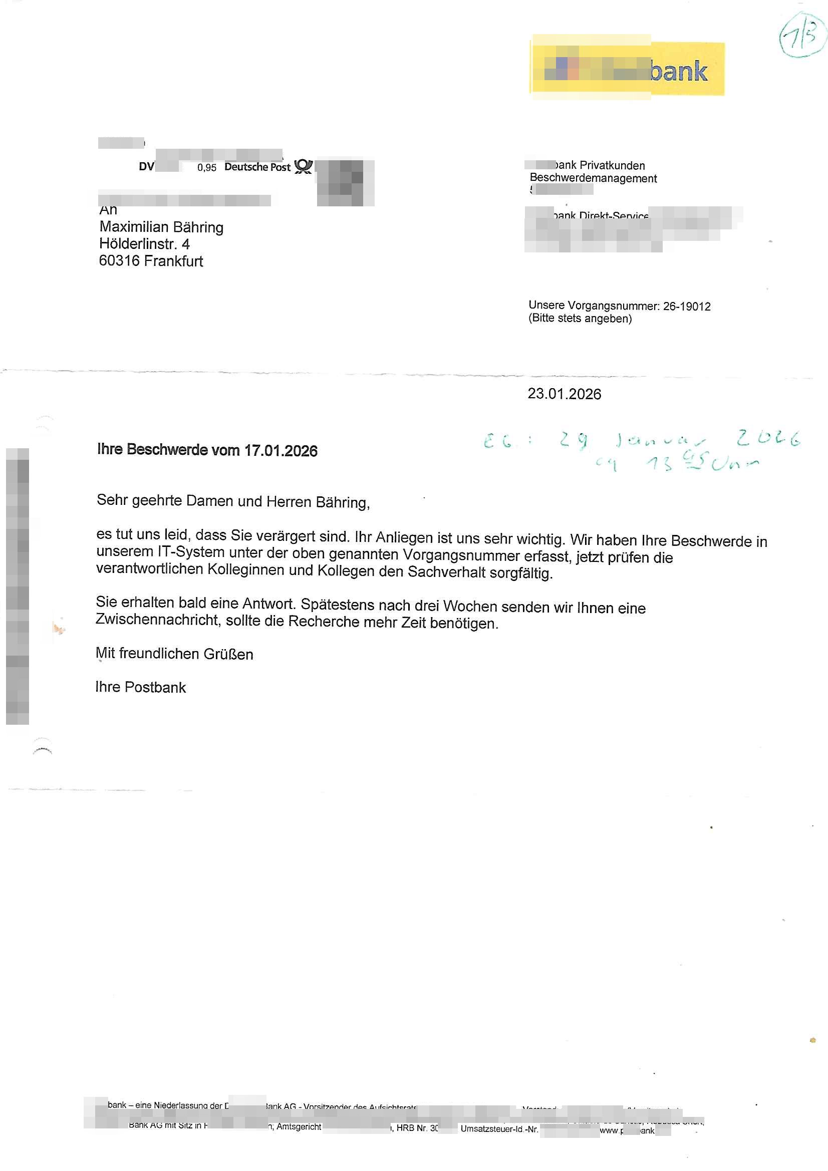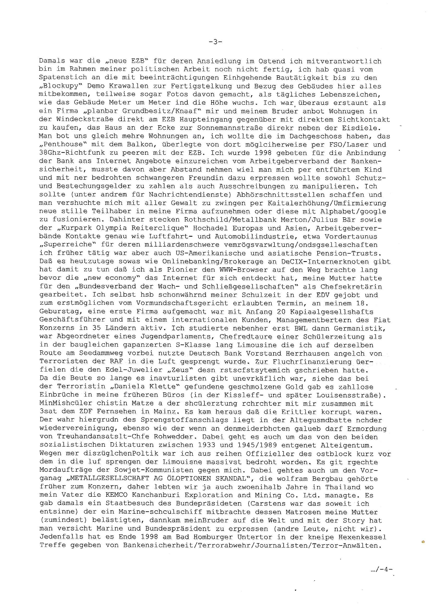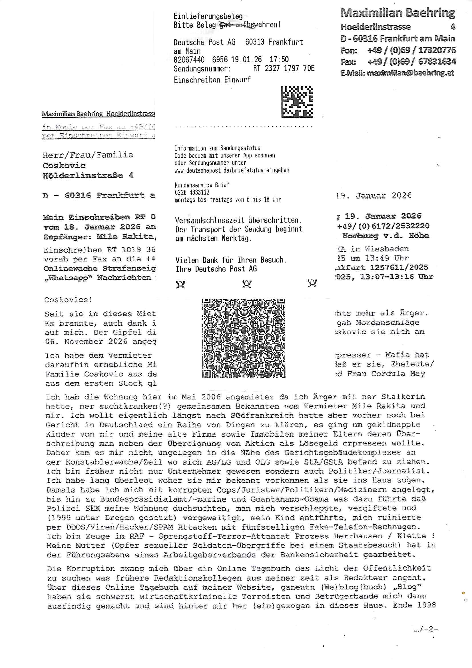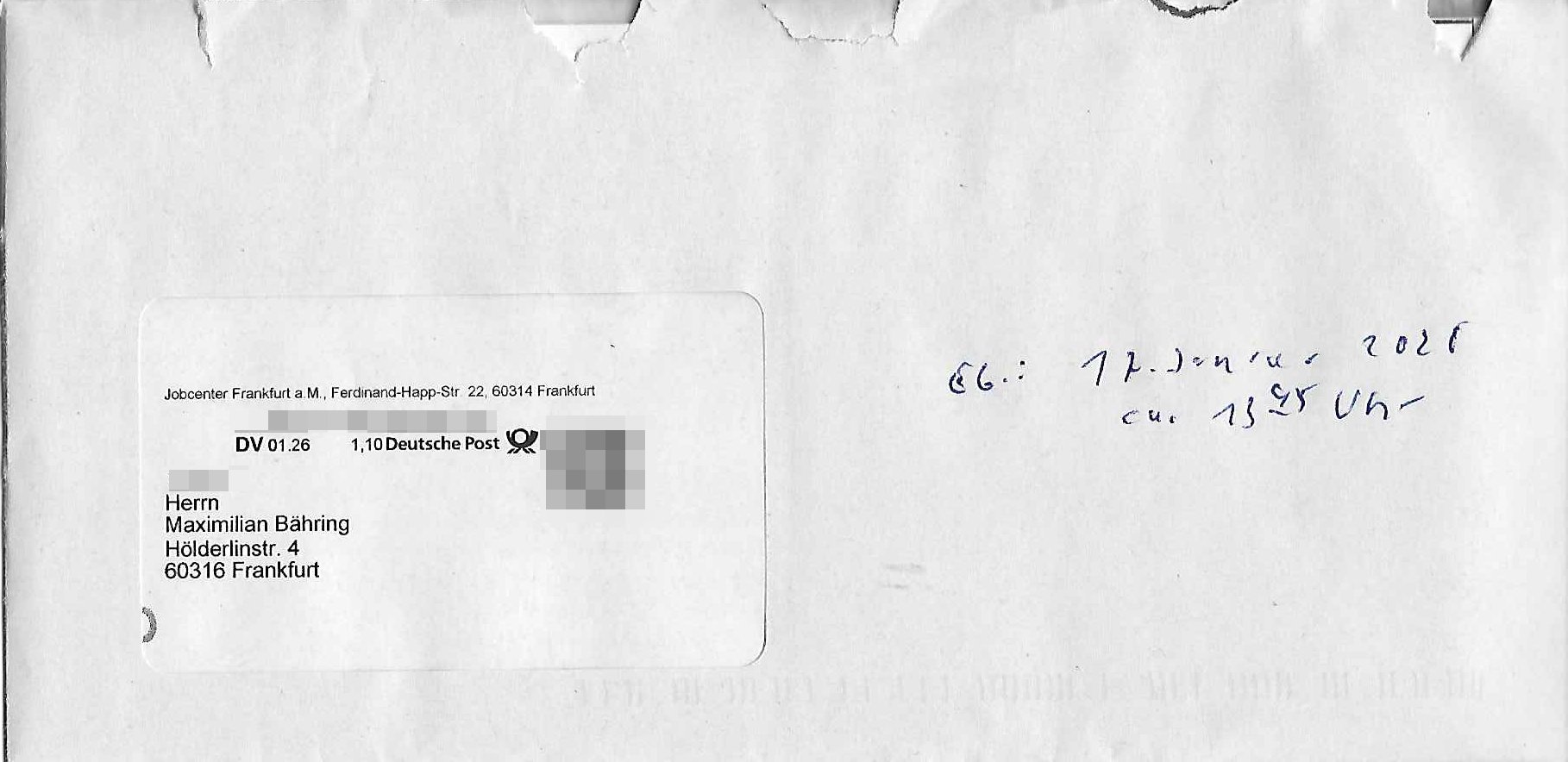 ( http://banktunnel.eu/pdf.php ) Maximilian Baehring Hoelderlinstrasse 4 D-60316 Frankfurt/M vorab per Fax: +49/(0)69/567006-99-892 Jobcenter Frankfurt am Main Zentrale z.Hd. Herrn/Frau D***k/Frau G***l Darmstädter-Landstraße 119-125 D - 60598 Frankfurt am Main Frankfurt am Main, 29. Januar 2026 Ihr Zeichen: 8KRM - BG - Nummer: ****( Kundenummer: *** ) antwortend auf Schreiben vom 11. Januar 2026 mit „mein Zeichen RN1899474“ Ihr Schreiben „Ihre Nachricht vom 11.01.2026“ datiert auf „22. Januar 2026“ frankiert am 27. und hier eingegangen heute, 29. Januar 2026 ca. 13:45 Uhr u.a. „Telefonproblem“, 1 Blatt (nur vorderseitig, farbig, bedruckt), 1 Seite Sehr geehrte/r Herr/Frau D***! Letztmalig am 18. Januar 2026 hatte ich mit ihrem Hause Kontakt, von 08:54 Uhr an diesem tage daiert mein Telefax an ihre Frau Behrami +49/(0)69/567006-99-892 der 18. Janaur 2026 war ein Sonntag an dem die Postfilialen geschlossen waren. Als Einschreiben (Einwurf) ging der vorab per faxe gesendete Brief somit erst am 19. Januar 2026 an sie herus die Nummer der Sendung ist RT 2557 6110 9DE. In ihrem Schreiben datiert 22. Januar 2026 von einer „Frau Gunkel“, unter-schrieben von Herren/Frau? „Uli Dvorak“ beziehen sie sich im ersten Absatz auf ein Sciben das sie von mir am 12. Januar 2026 per Telefax erhalte hätten aber ich muß dazu mittelöen daß es vom 12. Januar 2026 keinerlei Telefax an Sie gegeben hat. Am 12. Januar 2026 geing lediglich um 18:41 Uhr eines an die Bundesagentur EDV/IT in Nürnberg heraus Gegenstelle: +49/(0)911/1794405. Ansonsten habe ich am 12. Januar 2026 um ziemlich exakt 09:00 Uhr in der Ferdinand-Happ-Straße 22, 60314 Frankfurt am Main am Empfang das Schieben nochmal abgegeben was ich am Vortag, den 11. Januar 2026 um 16:08 Uhr schon per Fax an die +49/(0)69/567006-99-892 versendet hatte. Ich hatte eine Kopie de Schreibens direkt nach Nürnberg gesendet in der Hoffnung jemanden zu erreichen der für die EDV/IT zuständig ist. Schon am 18. Januar 2026 hatte ich bemängelt daß es ein DIN5008 Diktatazeichen (damals noch „RN1899474“) mit Nummer „1899474“ in meiner Korrespondenz mut Ihnen nicht gibt. Allerdings hatte mich Ende 1998 mal ein Gewerkschaftsmafia Truppe zu erpressen versucht Sekretärinnen einzustellen als man mir aufzwinge wollte mit meiner EDV Firma für die EZB an getürkten Ausschreibungsverfahren teilzunehmen. Man hat mich mit einer bedrohten schwangeren Freundin und später dann per Kidnapping zu erpressen versucht. Meine Mutter arbeitete früher im Bundesverband der Wach- und Schließgesellschaften (Arbeitgeberverband Bankensicherheit) als Chefsekretärin, ich war Abgeordneter/Politiker, Redakteur einer Zeitung in Bad Homburg wo die RAF die gepanzerte Limousine des Vorstand der deutschen Bank Herrhausen in die Luft jage die baugleich auch ich benutzt habe und EDV Unternehmer, hatte mit Baken EDV Recherchen bei der Terrorabwehr tun. Amerikanische Nachrichtendienste haben bei mir ne Hausdurchsuchung gemacht um an Ergebnisse meiner Recherchen zu kommen zusammen mit dem 3sat/ZDF Fernsehen Mainz (Redaktion Kulturzeit Christian Metz), man hört per Gerichtsbechluß mein Telefon ab. Daher bin ich vorsichtig. | |