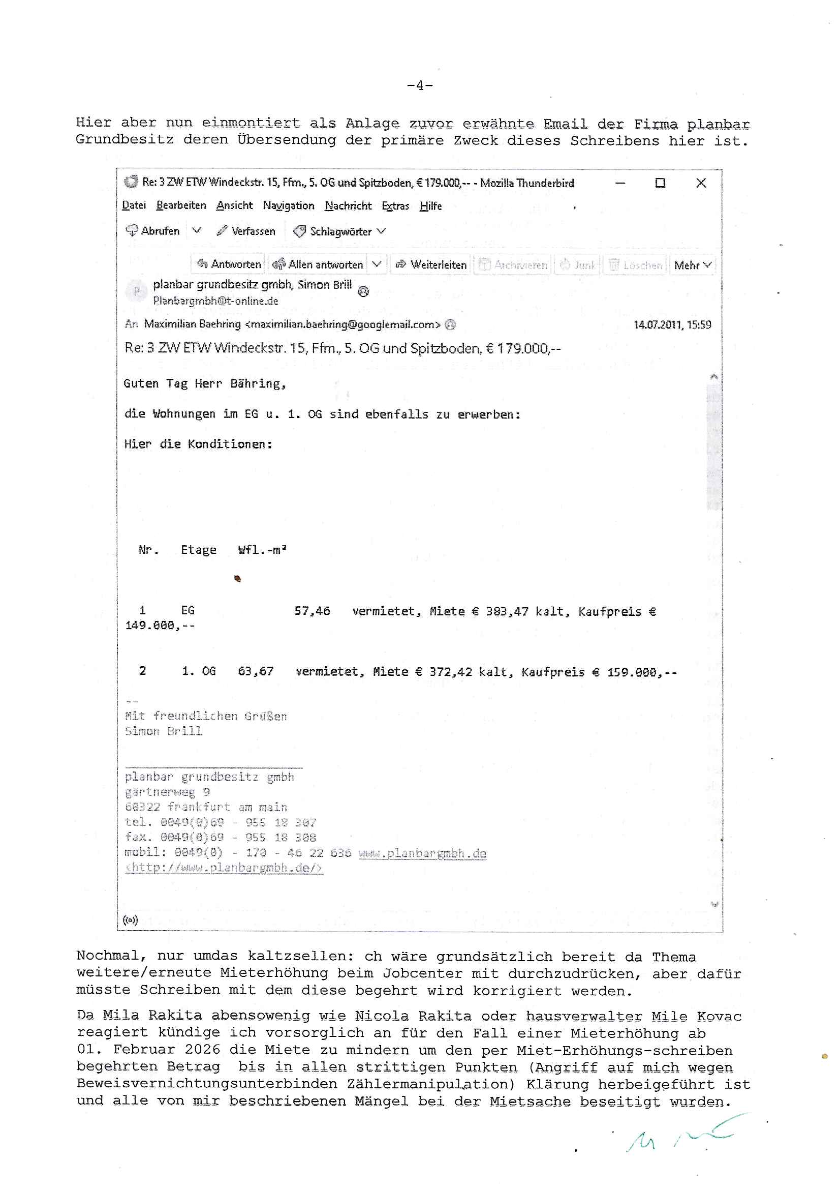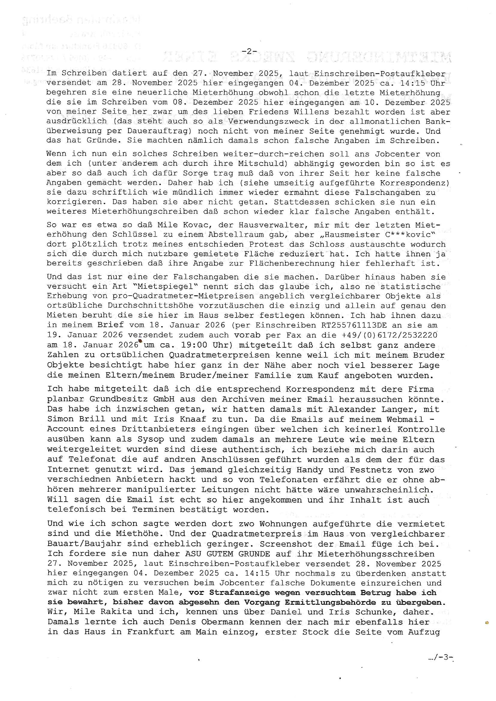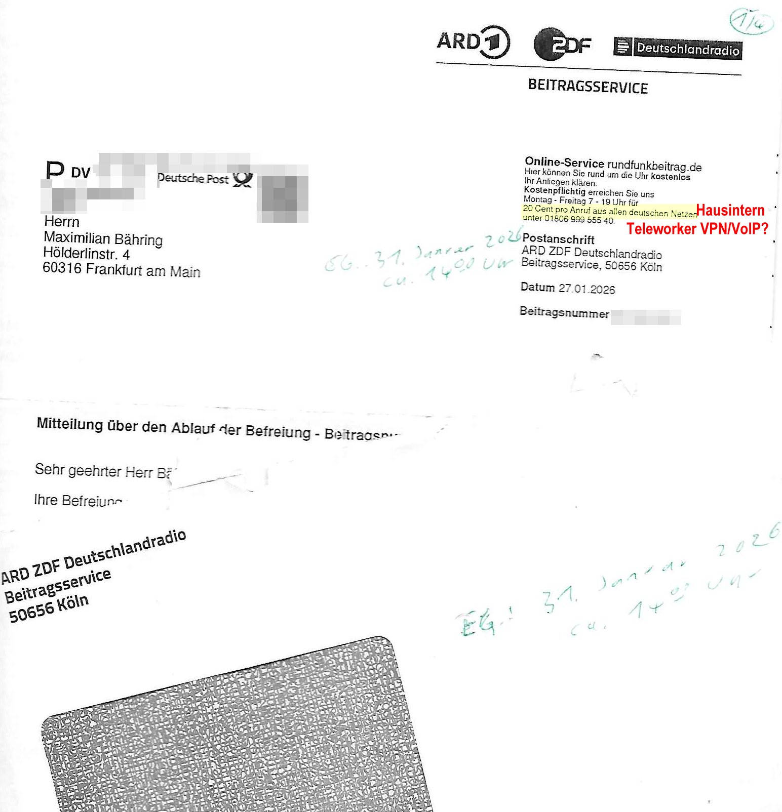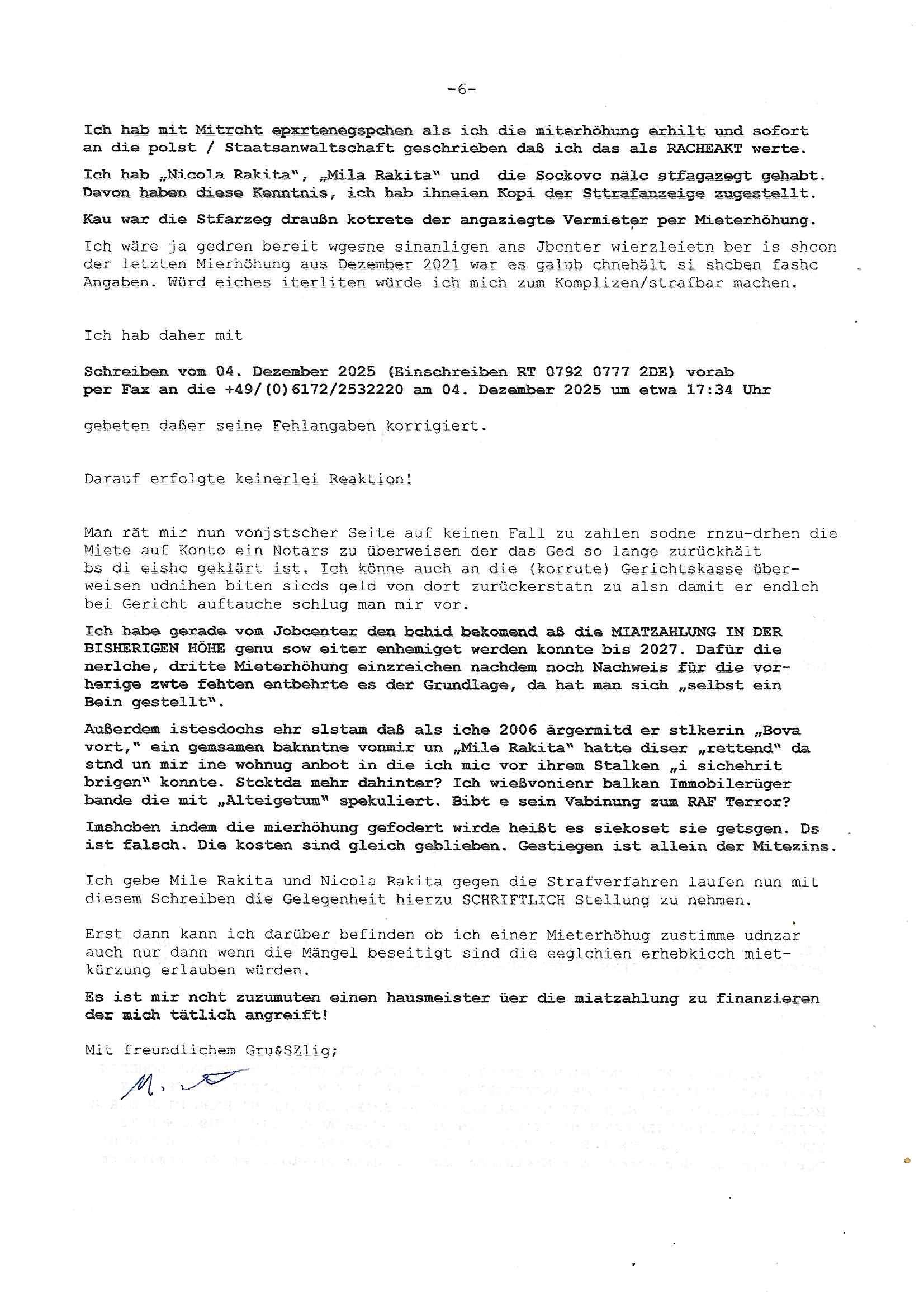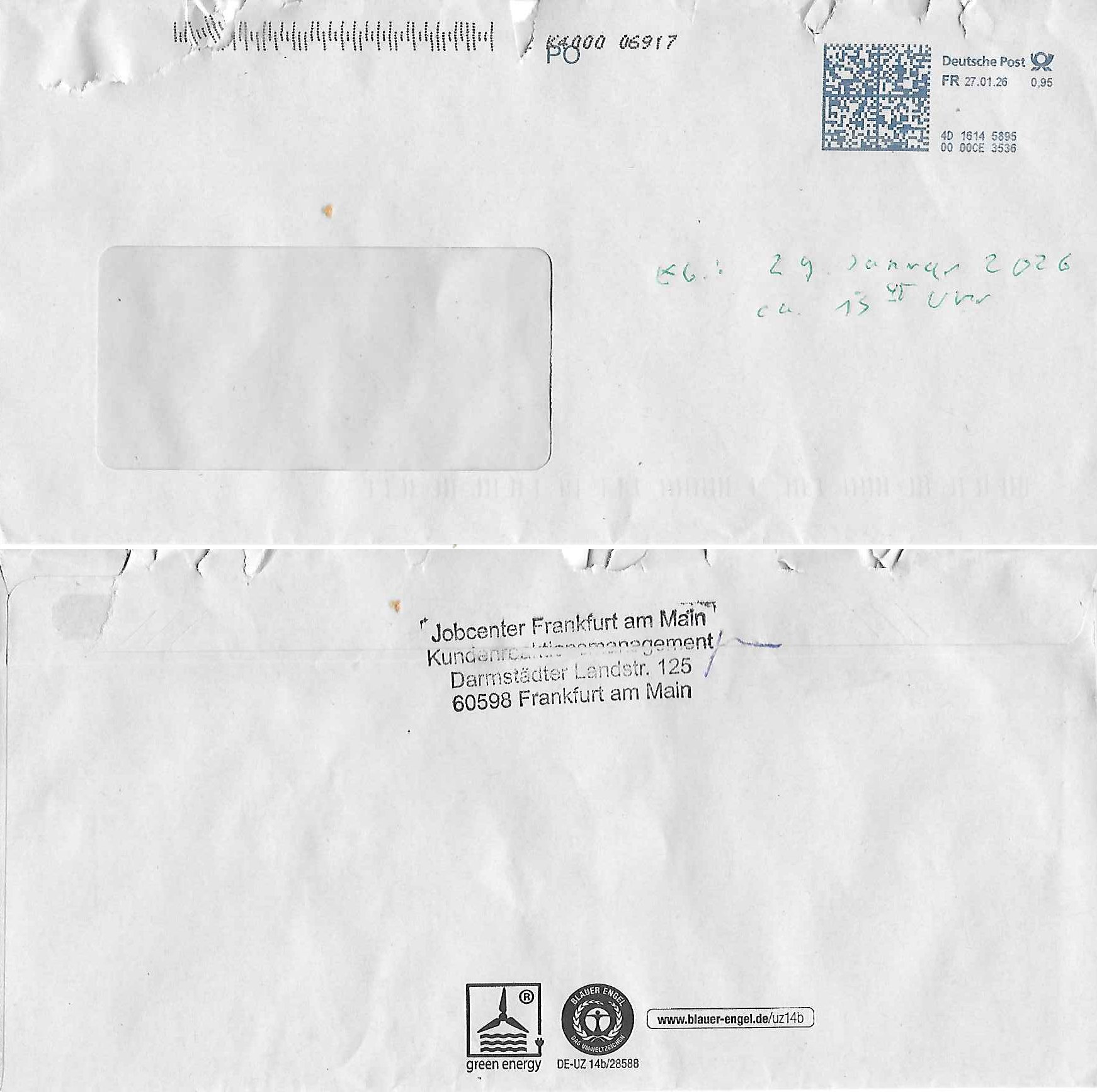( http://banktunnel.eu/pdf.php ) Maximilian Baehring Hoelderlinstrasse 4 D-60316 Frankfurt/M vorab per Fax: +49/(0)69/567006-99-892 Jobcenter Frankfurt am Main Zentrale z.Hd. Herrn/Frau D***k/Frau G***l Darmstädter-Landstraße 119-125 D - 60598 Frankfurt am Main Frankfurt am Main, 29. Januar 2026 Ihr Zeichen: 8KRM - BG - Nummer: ****( Kundenummer: *** ) antwortend auf Schreiben vom 11. Januar 2026 mit „mein Zeichen RN1899474“ Ihr Schreiben „Ihre Nachricht vom 11.01.2026“ datiert auf „22. Januar 2026“ frankiert am 27. und hier eingegangen heute, 29. Januar 2026 ca. 13:45 Uhr u.a. „Telefonproblem“, 1 Blatt (nur vorderseitig, farbig, bedruckt), 1 Seite Sehr geehrte/r Herr/Frau D***! Letztmalig am 18. Januar 2026 hatte ich mit ihrem Hause Kontakt, von 08:54 Uhr an diesem tage daiert mein Telefax an ihre Frau Behrami +49/(0)69/567006-99-892 der 18. Janaur 2026 war ein Sonntag an dem die Postfilialen geschlossen waren. Als Einschreiben (Einwurf) ging der vorab per faxe gesendete Brief somit erst am 19. Januar 2026 an sie herus die Nummer der Sendung ist RT 2557 6110 9DE. In ihrem Schreiben datiert 22. Januar 2026 von einer „Frau Gunkel“, unter-schrieben von Herren/Frau? „Uli Dvorak“ beziehen sie sich im ersten Absatz auf ein Sciben das sie von mir am 12. Januar 2026 per Telefax erhalte hätten aber ich muß dazu mittelöen daß es vom 12. Januar 2026 keinerlei Telefax an Sie gegeben hat. Am 12. Januar 2026 geing lediglich um 18:41 Uhr eines an die Bundesagentur EDV/IT in Nürnberg heraus Gegenstelle: +49/(0)911/1794405. Ansonsten habe ich am 12. Januar 2026 um ziemlich exakt 09:00 Uhr in der Ferdinand-Happ-Straße 22, 60314 Frankfurt am Main am Empfang das Schieben nochmal abgegeben was ich am Vortag, den 11. Januar 2026 um 16:08 Uhr schon per Fax an die +49/(0)69/567006-99-892 versendet hatte. Ich hatte eine Kopie de Schreibens direkt nach Nürnberg gesendet in der Hoffnung jemanden zu erreichen der für die EDV/IT zuständig ist. Schon am 18. Januar 2026 hatte ich bemängelt daß es ein DIN5008 Diktatazeichen (damals noch „RN1899474“) mit Nummer „1899474“ in meiner Korrespondenz mut Ihnen nicht gibt. Allerdings hatte mich Ende 1998 mal ein Gewerkschaftsmafia Truppe zu erpressen versucht Sekretärinnen einzustellen als man mir aufzwinge wollte mit meiner EDV Firma für die EZB an getürkten Ausschreibungsverfahren teilzunehmen. Man hat mich mit einer bedrohten schwangeren Freundin und später dann per Kidnapping zu erpressen versucht. Meine Mutter arbeitete früher im Bundesverband der Wach- und Schließgesellschaften (Arbeitgeberverband Bankensicherheit) als Chefsekretärin, ich war Abgeordneter/Politiker, Redakteur einer Zeitung in Bad Homburg wo die RAF die gepanzerte Limousine des Vorstand der deutschen Bank Herrhausen in die Luft jage die baugleich auch ich benutzt habe und EDV Unternehmer, hatte mit Baken EDV Recherchen bei der Terrorabwehr tun. Amerikanische Nachrichtendienste haben bei mir ne Hausdurchsuchung gemacht um an Ergebnisse meiner Recherchen zu kommen zusammen mit dem 3sat/ZDF Fernsehen Mainz (Redaktion Kulturzeit Christian Metz), man hört per Gerichtsbechluß mein Telefon ab. Daher bin ich vorsichtig. | |