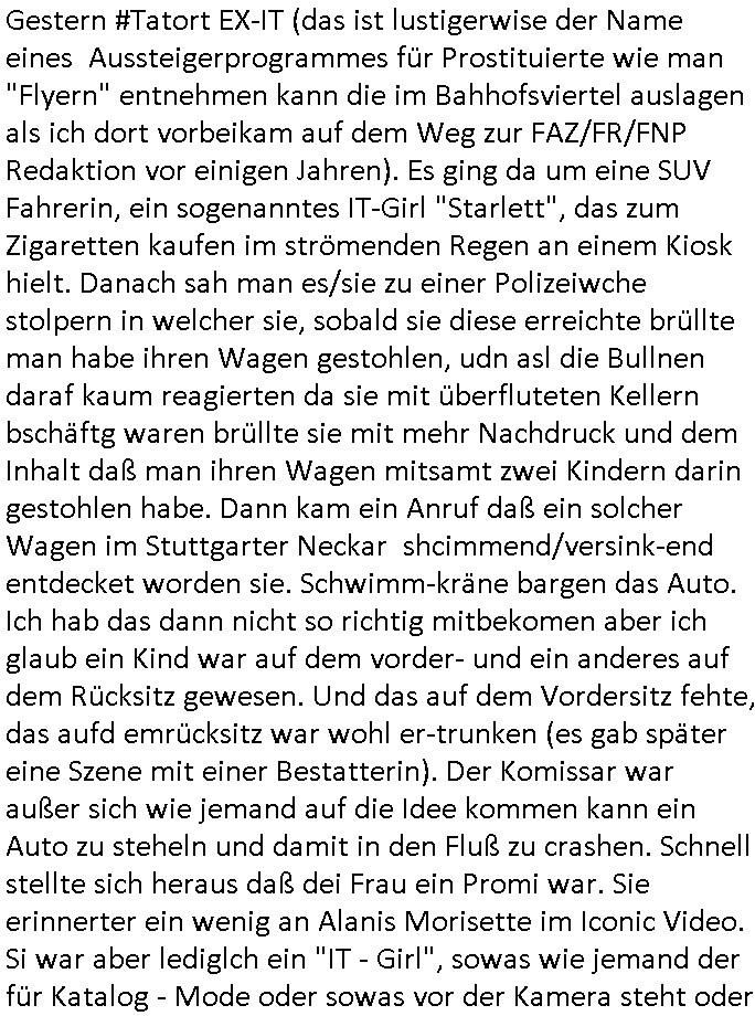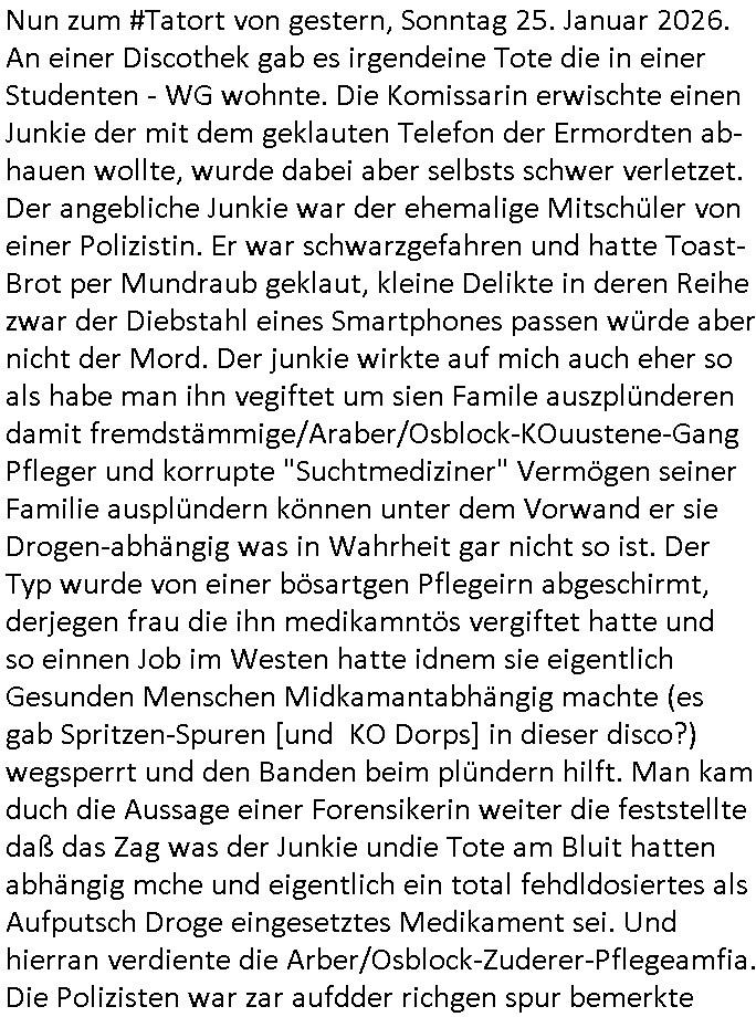 terror-mafiosi entigenetr utrenher) ist, dem entführen sie seine angvagelgten kider ruinieren repuation und familie. Luet mit Ätzte-Diplomen vom Vicong oder aus Bukarest die dort für "HBOmax:SPYmaster" Stasi gefoltert haben. Let dei afgscket habn daß "Big Data/Smartphone-KI" Apps eine großanagleghet Spionageakion des KGB sind um EU / Deutschland wieder wie vor 1989/90 wzche den USA und ehemalugrn UdSSR(inlc. Ukraine) aufzuteilen durch wiederieführn des 4-Mächte Status (daran arbeiten die Ölmafi Reiterclique Royals dei uns den Ukraine Krieg um KZ Reparatiosnzahlungen eingebrockt haben). Es wird nicht besser sondern immer schlimmer. Genau wie die verecherclique um Riek/Ressler/Bruckmaier/Zanner (geb Berger) Ende 1998 im Hexnskssel ankündgte will man mich sadistischst zu Tode foltren idnem man genau das Prozedere wiederholt was wir eigentlch nach den Skandalen um Mollath/Snwoden/Gägen/Kurnaz bereit üerwuden zu aben glabten. Die sadistchen Medizner von der Aulädner-Pfelegmfia hören einfach nicht auf. Angeb-liuchen Tharapien dien nur Stasi-Verhörfolter, man leakt Opfer Patietendaten in angeblichcen EDV-Hacks #Tatort https://tvinfo.de/fernsehprogramm/2256592711-tatort | |