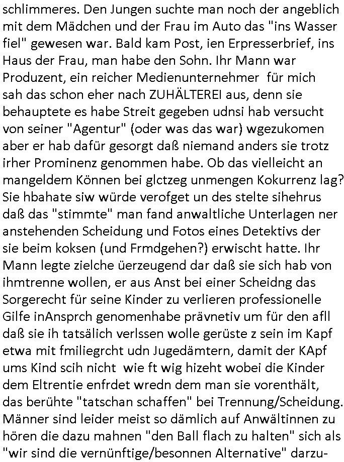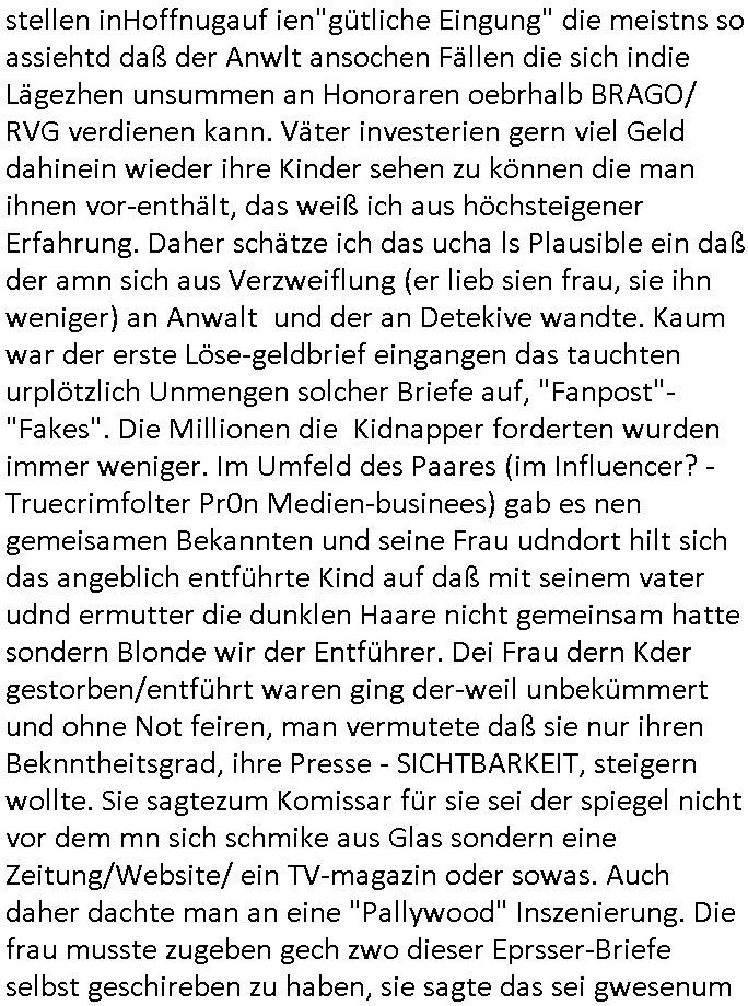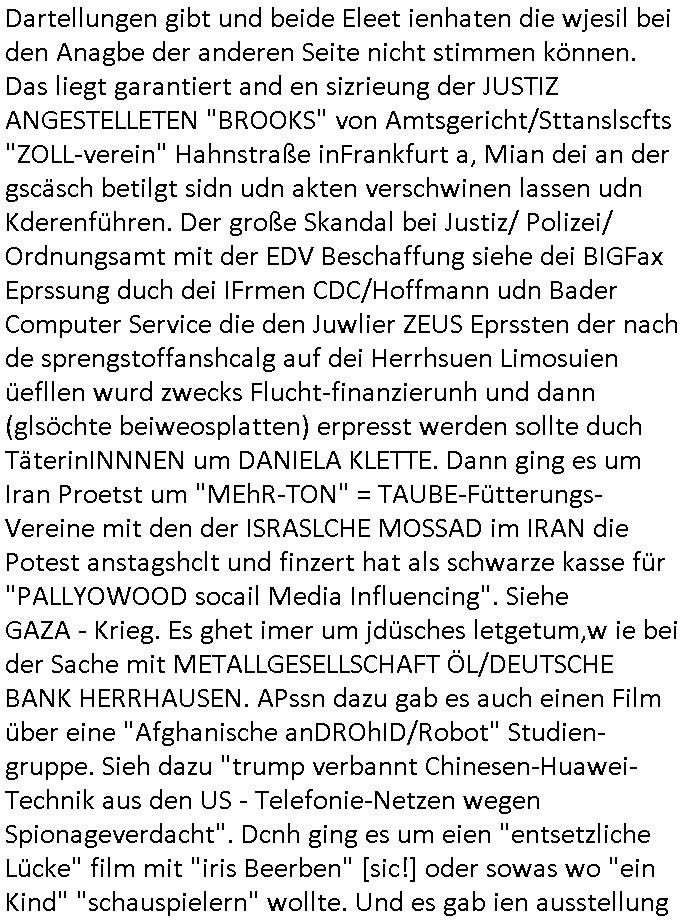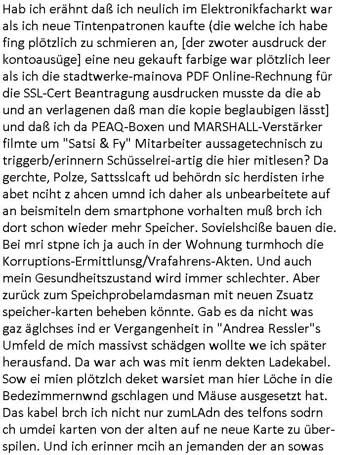 | Diese Verbrecherbande manipuliert schon wieder gezielt die Verbindungen zur Rufnummerm unter +49/(0)69/755 also die Durchwahl -01050 vom 5. und die -10100 vom 1. Revier. Das ligt auch nicht an Router/Provider-Sperrlisten oder "mangeldnem Guthaben "die +49/(0)69/1367-0 (das Gericht) imgelcheVowhalberich erreich ich nämlich. Die missbrauchen ihre "Polozei Verhandlungsführung in Kidnapping - Fällen" befugnisse um im Telefonnetz rum- zufuhrwerken und zu pfuschen,wie whaist getht es denen darum das bloß nicht beaknt wird wie viel scheiße sie in den letzet jahren wirklich gebaut haben, also um nicht anderes als drohende (Aussge-)Beweisevernichtung durch Zeugen Einshcüchterung / zu schweigen bringen wollen. Manwill michd er jedesmlaien Strafanzeige wegen utre-lassner hIlflsitung machen will Beihilfe und begüstigung schwerster straftaten ganz offensichtlich zermrürben udn hört nicht auf mich mit Schlüsselreizen zu triggern ind er hoffnug daß ich einen scheinbaren Suizidverscuh begehe. In de rvagangeheit hat das mah hercf klappt udndannw urde ich in Kliniken verschleppt und dort gezilt vergiftet. Als würde es nicht genügen daß mein Kind entführt ist.