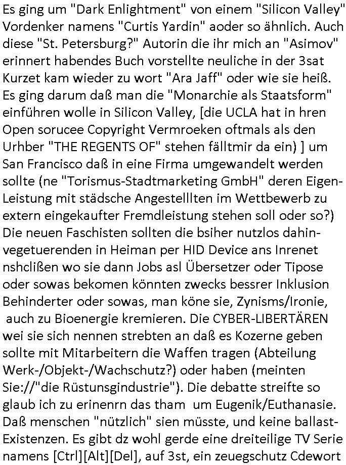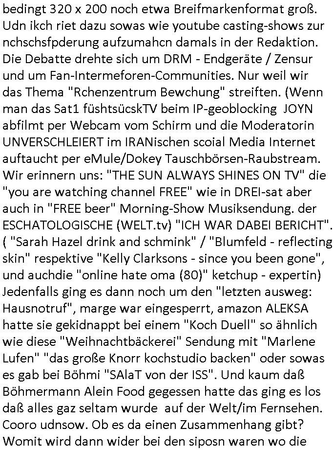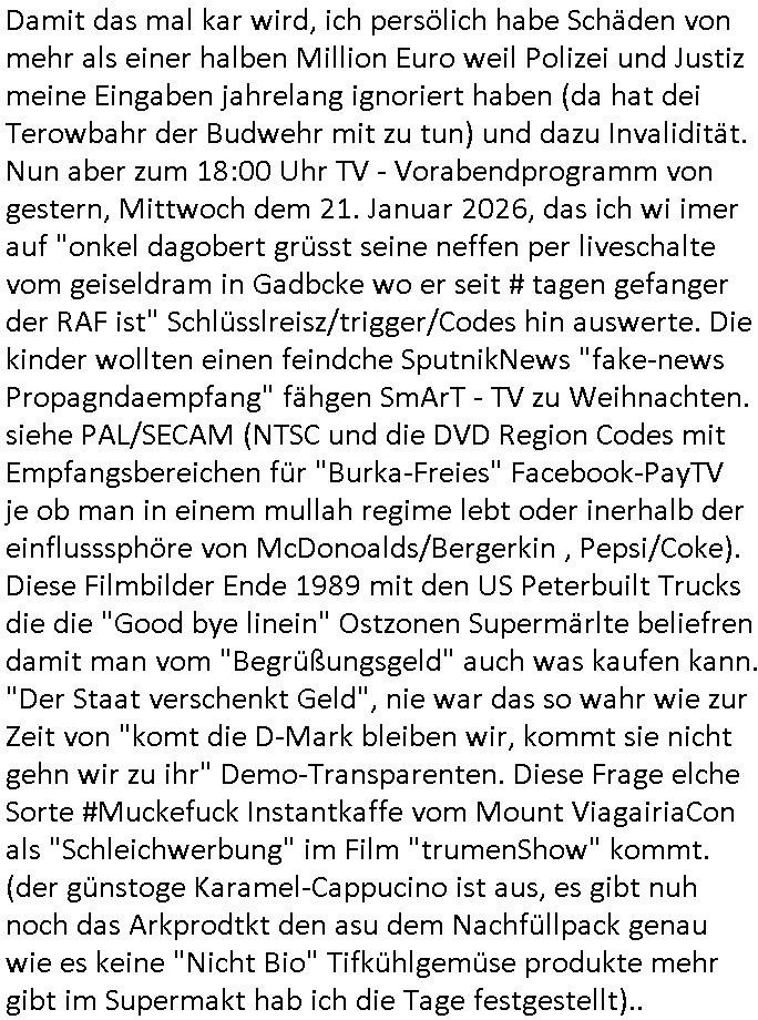 Automaten oder der Küche glaub ich oder so. Und ich sage asl klie kdie es gibt kein coke mehr nur noch Pepsi weil die den Vertrag geändert haben, da war ich dabei. Und da hat amn denkdern erkärt was Konkurenzkampf um Marktanteile ist. Ein Promi(?) Kind wollte Monopole schaffen wiel es nicht denuschide zwischen ständigem wettbewerb am amrke verstand udn so einer Art von "the winner takes iat all" Endsieg eine, Ausscheidungs-wettbwerb (Auscheidung wei Sportwettkapf-Finale nicht verchslen mit Cliparts zum ausschneiden aus Schüler-zeitungs-Layout-Schnippelbüchern ählch der Erpresser- briefe die kinder beimbsucshtierben lernen aus BILD - zeitungs bucshtaben die sie ausschnitten "scrabbelten"). Siehe "Scrabble" in "Sting and the Police" "Seven days". Udn die wollte dei frage McDoanlds versus Burger-King und "Kentucky Fried Chicken" per "Sammelbestellung"s "flash mob"s "Monopol"y klären indem sie per Telefon-kette gezilt zu Produktboykotts bstier marken aufrief. Und ich hab ihr gesagt das sei "schummeln" gehe nicht. Denn ein System wo sch am ende nur eine marke in ner art Sportwettwerb aufdemsirgterpüechen durchsetzt das nhem dem endkduendie WAHL-FREIHEIT ! Und s bagriff diencht wedie aus Asiens?-Ostblock kamen glaube ich. Sei dchte es gehe darum ein art Blidverksotung oder sowas zu machen im mcDondls TV-spot mit Stromberg. Das ist auch der Grund warum man "Moonwashed" Jeans trug inder Ostzone/DDR anders als im Westen. Siehe dazu "U. Plenzdorfs" "neue Leiden des jungen W.". Siehe "Du hast die Wahl" zwischen Hausmarke "Fanta4" und "PremiumMarke" Werbung von Supermarktketten. (Das ist der Unerschied Vollsortimenter zm Discounter: Discountr bedeutet quasi nur noch ein Eigen/Hausmarke Produkt zur Auwahl aber billiger, das ist Kommunismus). DA bsudte daß man an der Zahl dr coaSortan di es zur auswahl gibt wenn man imausldn utewges ist ablesen ann wie es umdie Marktfreiheit und Kartelle bestellt ist. Wir hab dasml extre einen Wirtschafts Porfessor geholt der denustchei zwschen Wiscftssissncaft in BRD und DDR erklärensollte woel die aus dem Ostblock das nicht kenen daß der satt für sie als vermelich unmündige und dumme konsumenten alles vorentscheidetsie Einparteiensystem. Dei wolltennicht glauben daß Überflusswirtschaft ttz der ineffizienz di in de rtehorei esthet wenn man von zwo Produkten die es zur Auswahl gibt im Regal am Ende nur eines kauft (womit sie mit dem irrglaueb alle habn den gslche geschmach annahmen daß dei andrene Pridukte adnn als unvrkäfich Ladenhüter im regsl stehenbeleiben) das wesltiche kaoitslschte Wirtschaftssystem (verteidigt gegn die tote Kommusten Gafhr duch die Nato Militärs) denncoh viel mehr wehlstnd genriert als diespereffkte die mah at wennmannur ien sorte im Regal stehen hat. Daß die kunst iMhdel darin besteht dem kuden seine Wünsche unasgspschen vonden augen abzuelsen und zu erfüllen daß kannten die drüben inder Form nicht. Srvicewüste dsuchalnd. Das ist eine "Mentalität"s-frage. Wer erfolgereich sien will muß dem andern dienlich sein. Im Westen muß man Wünsche/Bedürfnisse der anderen achten. "wer tinkegeld / f*ckn will muß freundlich sien". Dieses Trinkgeldgesicht aus "Gerhart Polt"s "Herr Ober". Daran (neben "wo waren sie am 31. Dezember 1999" / amtag als Kenned ershosn wurde ) musste ich gestren mittag denken im TV von "Abba" "Happy New Year" lief (ich glaube innme Film in dem Anke Engelke dem bürger- meister seienn Pillermenn aus der Hose holen sollte, ich weiß jetzt aber auch nicht mehr wie ich asusgschnet das von ForrestGump her darauf komme, wahrscheinlich ist das wegen "lecker Kaffetrinken mit der Beatrix" war da nicht auch irgendwas im TV Programm gestren?). --- https://en.wikipedia.org/wiki/Happy_New_Year_(song) war der song "happy new year" von "abba" irgendwo hier zu hören ? https://tvinfo.de/fernsehprogramm/2260871668-kurzschluss https://tvinfo.de/fernsehprogramm/2260871672-der-zweite-kurzschluss https://tvinfo.de/fernsehprogramm/2260871675-kurzschluss-hoch-drei | |