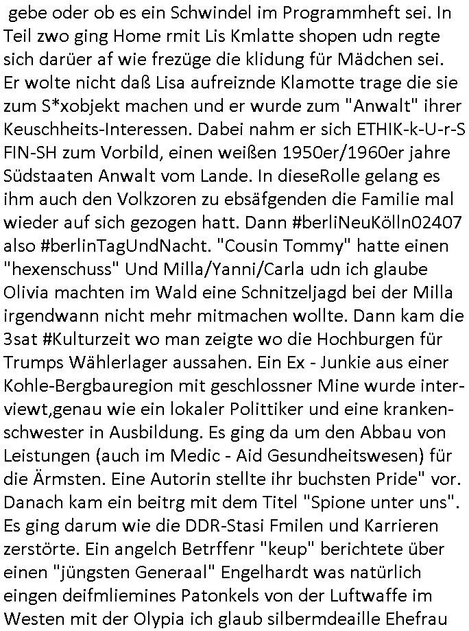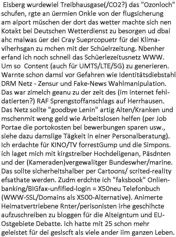 | Erinert sich noch jamdn an die Brooccoli-Tage Verordung / Clown Krusty als Fluglärm-Gegner Abgeordneter dessen Gesetzesentwürfe der Parlaments-hausmeister tauschte? Ob Dr. Mark Benecke in Köln Oberbürgermeister #Quincy "pathologe mit facbookprofil" TV-Serie zum Vorbild hat ? Arbeiten Satiremagazin Titanic "die aprte" Abgeordnete Martin Sonneborn / Sylble Berge nicht beim 2DF in Mainz als "heute-show" Terrorclown bei Böhmermann/Scholz? In den USA wurde ja gerade ein Bürgermeister auf den "as [commodore - logo] ' C = ' strahlt üer uns riesengroß" Koran vereidigt der Kommunist und erst siet kur-zer Zeit im Land ist. Idgwoher müssnedia Aufträge für Mexikaner udlatino armistunder im Baumafia Hautwgereb komnen damit sie nchtabsgchobenwerden. Was kommt wohl als nächstes? Ein Spross des "ALOIS SCHICKLGRUBER" Clans vondem es in den USA noch ebende nachkommen geben soll der seinen VIP Nach-Namen großflächig plakatiert als Wahl- Kandidat ? Robert Harris #Fatherland läßt grüßen. Ichmien wen interessiert schon ob der bestenfalls halb-deutsche Vater unbekannt Nachfahre einer über Miss-brauch von Vor-Gewalt-Ggen-faruen- udn Zuegnschutz-gesetze koksnden Türkin oder Serbin aus dem Miliue die eigentlch lägst hätte ab-gchoben werden solen heir politik vonasmutdererdem asylbetrüerfürarmustzdgedert asyterüerg amcht mit zu unrecht erlangter Satsbürgsrcfat bei ner Wahl per Intrenet (siehe #Putin-Troll Wahlkmapf) Schneeballsystem Geldwäsche Invstoren : Willkommen?