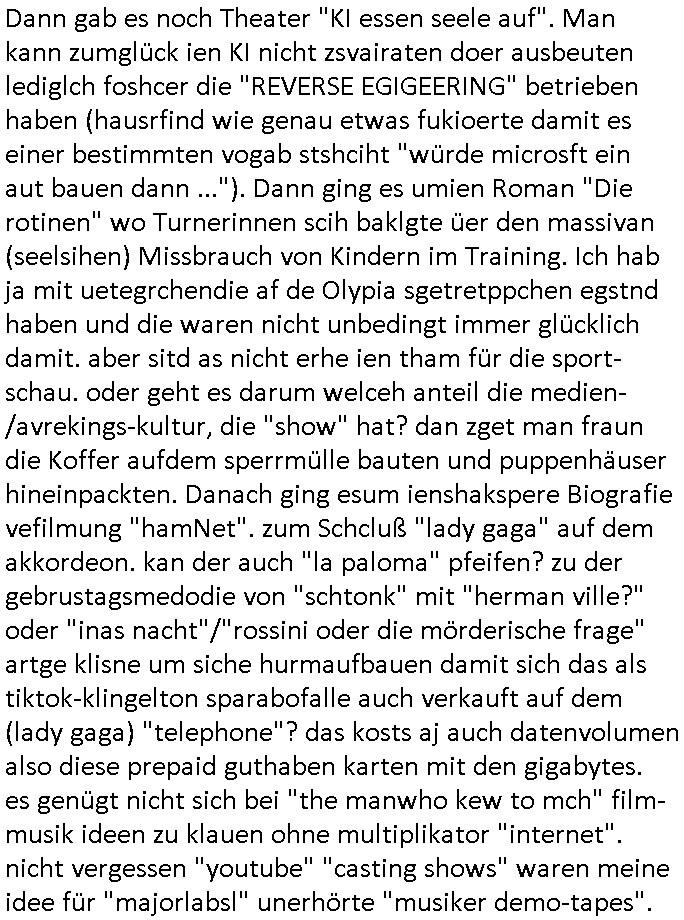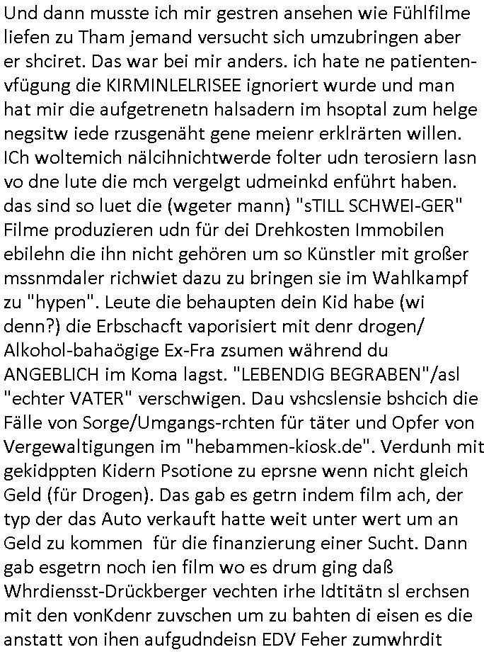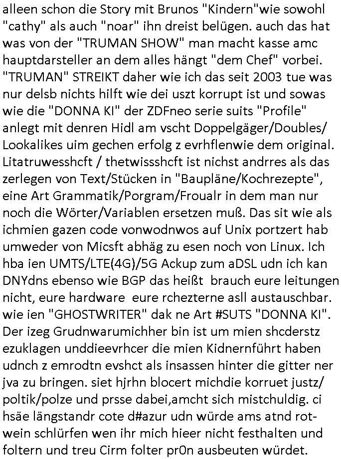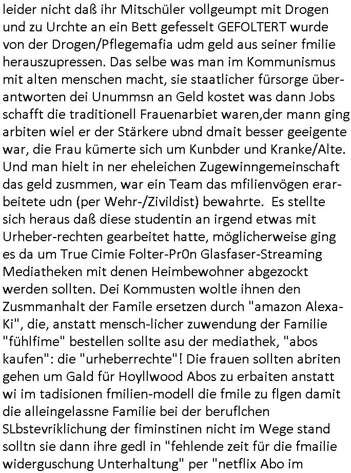 | Als ich gestern zwischen ca. 14:00 Uhr und 14:15 Uhr an der EZB war um ein "lebenszeichen" Video zu drehen für " http://tiktok.maximilian.baehring.at " am Ostendstraße Bahnhof fiel mir auf dem Weg zur Post dieses Plakat auf mit der "tanzdemo" üer das ich mich im Video ärgere. Es wird nälch so gatn als wären Vergwaltigung Kidpping usw. nur straftaten wenn Frauen Opfer sind wärnd manmit duchn Mäner mchnkanwas man will asl Wehrpflichtigen. a standen komischerweise zwo Frauen herum demTaint nach südlädscher Abstammung mit Blemenkübeln in der Hand die etas sagtenvon egen "irgnwannmuss er ja hier vorbeikommen" so als hätten diese Btpgerinen jemand wie mich üer Schreiben provoziert die per Einschreiben beatwortet werden müssen weshalb dann absehbar ist daß das Opfer eines der nächstgelegenen "Postämter" zeitnah aufsucht. Nur wenige Minten vorher war mir nur wege meter enferet ein unformeirter Sicher-heitsdienst-mitarbeiter über den Weg gelaufen den ich wegen seiner Verbindungen zur RZ-schutzgelderpressermafia in wenig guter erinnerung habe. Als ich eben um ca. 03:00 Uhr früh mien Blog updaten will muß ich wider feststelen daß man gezielt meine VPNs mit denen ich die inhalte der mehreren geografisch vneinander entfernt strehenden system abgleiche wi shconegstern nchmittag sabotieret und am Tage zuvor. Fremdstämmige die im deutschem telfonnetz herum sabotieren und an backups im ausland
