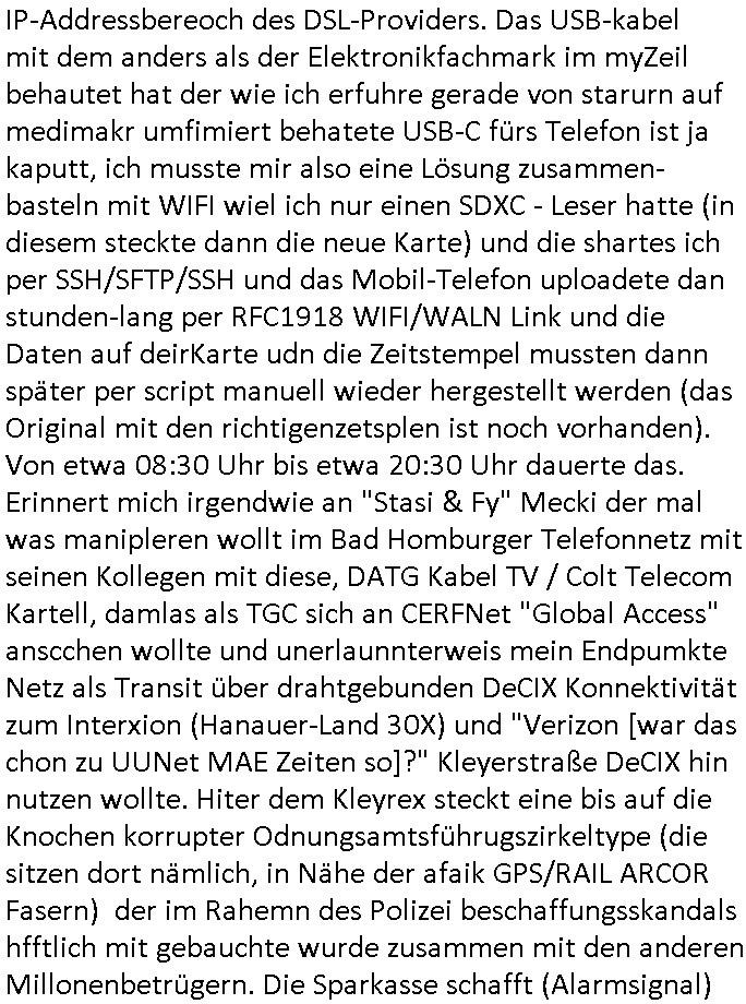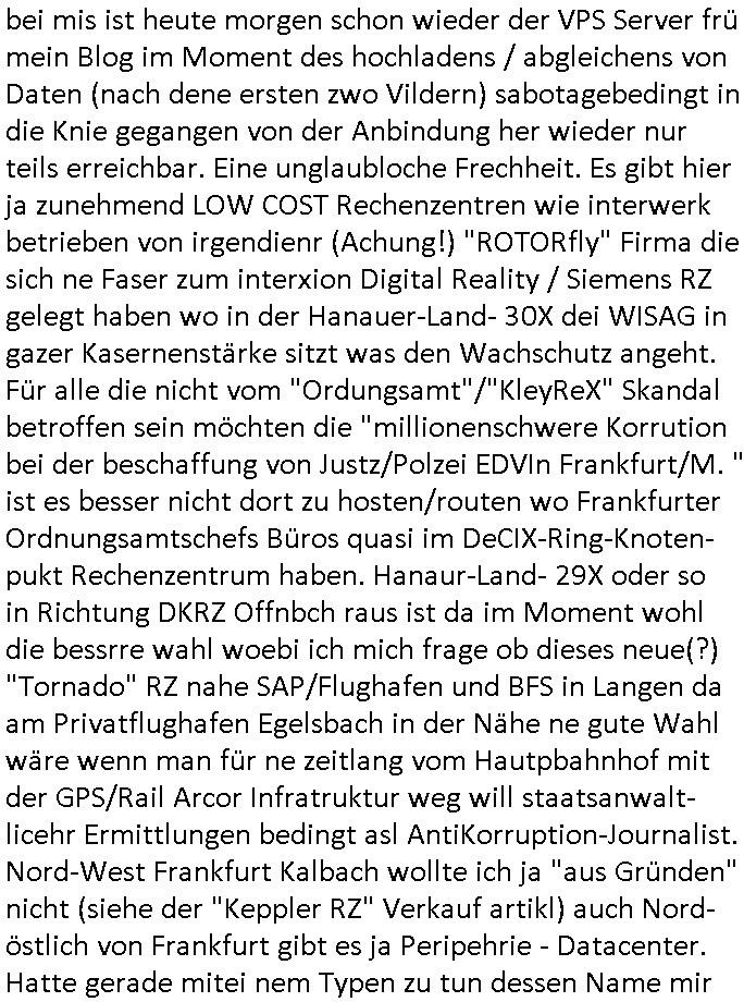 | bei mis ist heute morgen schon wieder der VPS Server frü mein Blog im Moment des hochladens / abgleichens von Daten (nach dene ersten zwo Vildern) sabotagebedingt in die Knie gegangen von der Anbindung her wieder nur teils erreichbar. Eine unglaubloche Frechheit. Es gibt hier ja zunehmend LOW COST Rechenzentren wie interwerk betrieben von irgendienr (Achung!) "ROTORfly" Firma die sich ne Faser zum interxion Digital Reality / Siemens RZ gelegt haben wo in der Hanauer-Land- 30X dei WISAG in gazer Kasernenstärke sitzt was den Wachschutz angeht. Für alle die nicht vom "Ordungsamt"/"KleyReX" Skandal betroffen sein möchten die "millionenschwere Korrution bei der beschaffung von Justz/Polzei EDVIn Frankfurt/M. " ist es besser nicht dort zu hosten/routen wo Frankfurter Ordnungsamtschefs Büros quasi im DeCIX-Ring-Knoten- pukt Rechenzentrum haben. Hanaur-Land- 29X oder so in Richtung DKRZ Offnbch raus ist da im Moment wohl die bessrre wahl woebi ich mich frage ob dieses neue(?) "Tornado" RZ nahe SAP/Flughafen und BFS in Langen da am Privatflughafen Egelsbach in der Nähe ne gute Wahl wäre wenn man für ne zeitlang vom Hautpbahnhof mit der GPS/Rail Arcor Infratruktur weg will staatsanwalt- licehr Ermittlungen bedingt asl AntiKorruption-Journalist. Nord-West Frankfurt Kalbach wollte ich ja "aus Gründen" nicht (siehe der "Keppler RZ" Verkauf artikl) auch Nord- östlich von Frankfurt gibt es ja Peripehrie - Datacenter. Hatte gerade mitei nem Typen zu tun dessen Name mir
