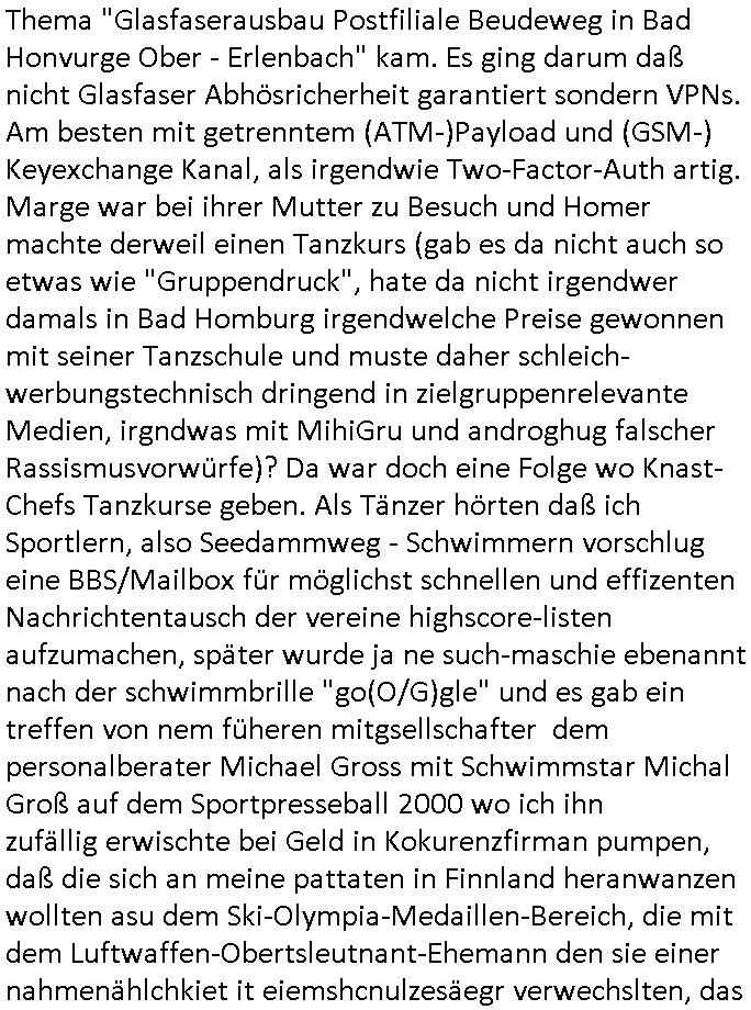 | Ich erinnre mich noch genau wie dei "Opel - Gang Jungs" vom Bad Homburger Golf Club (der Oberbürgermeister hatte im alten Rathaus damals kunstrasengrünen Teppich liegen da er Golfer war) uns ihre Aufwartung machten im Redaktionsbüro von der Humboldstchule Schülerzeitung. Die inahberin von der Cento Bar neben dem Büro "Michi" war woe ich zur Zeit der Gerichtprozesse wegen Kind meien Feierabende verbracht habe war ja auch Golferin. Jedenfalks haben die Olympia/royal ReitercliqueSportler Leute die ja auch öfters bei den #Simpsons vorkommen erzählt daß es Wunderkerzen Champ-us beim Apres Ski gäbe, da erinnere ich mich noch ganz genau drann. Und jetzt die "cocktail Moltov ( verursachte ?)" Katastrophe im Schweizer Nobelskiort. Hab ich ehrgelch shcon ma erzählt daß in Bad Homburg Ober - Erlenbach ein Groß- teild er Häuser im alten Ortskern nicht den Brandschutz- Vorschriften hischlich Brandmauren entsprächen wie die freilligen Feuerwehrler mir damals erklärten? Man wollte staatliche Hilfen für Abriss und anschließenden Neubau mit so ner Art Denkmalschutz und die lokale Bau-mafia, pardon Wirtschat rieb sich schon die Hände in Vorfreude auf viele möglciehris it koorion zstdnkomende Aufträge. Was war Ursache dieser brennenden Hochhaukomplex Feuerhölle in Hongkong neulich? Pfusch am Bau wie eid er enrsgstchen Sanierung des Greenfele tower in London?Die abuwruscft (zu der acuh mien Vermieter hier gehört) buhlte jedenfalls um Stimmen von Jungparlamentariern.