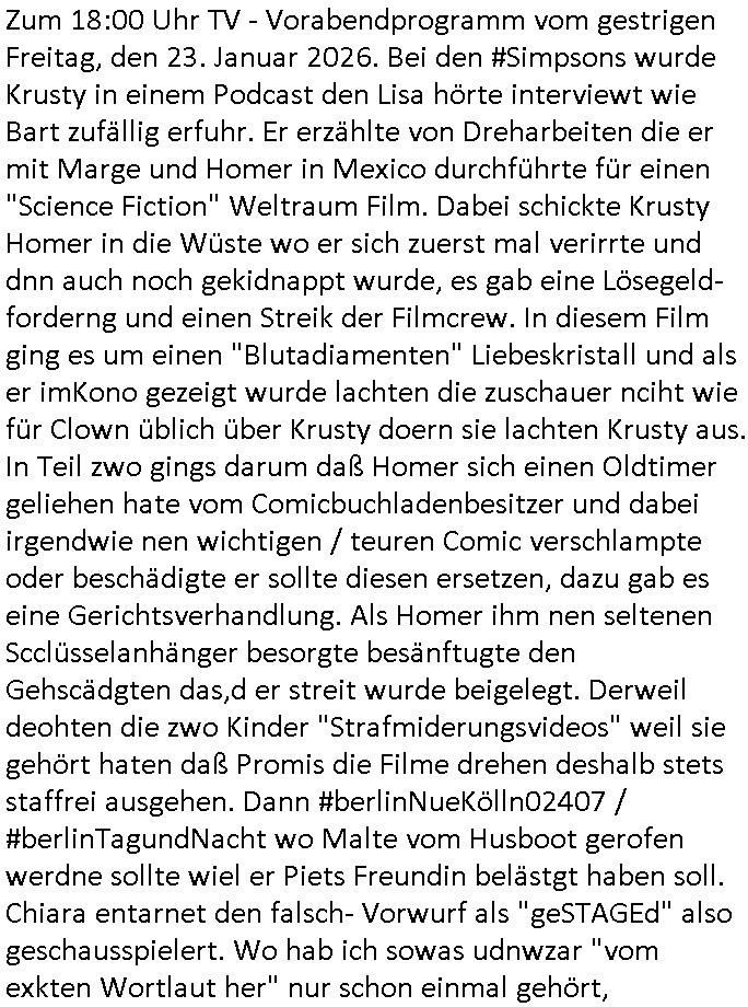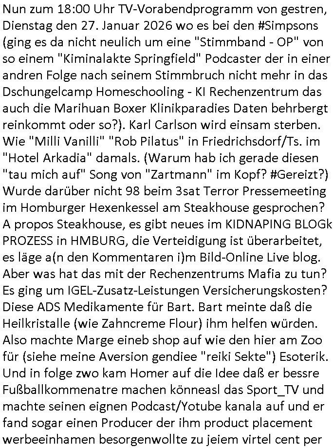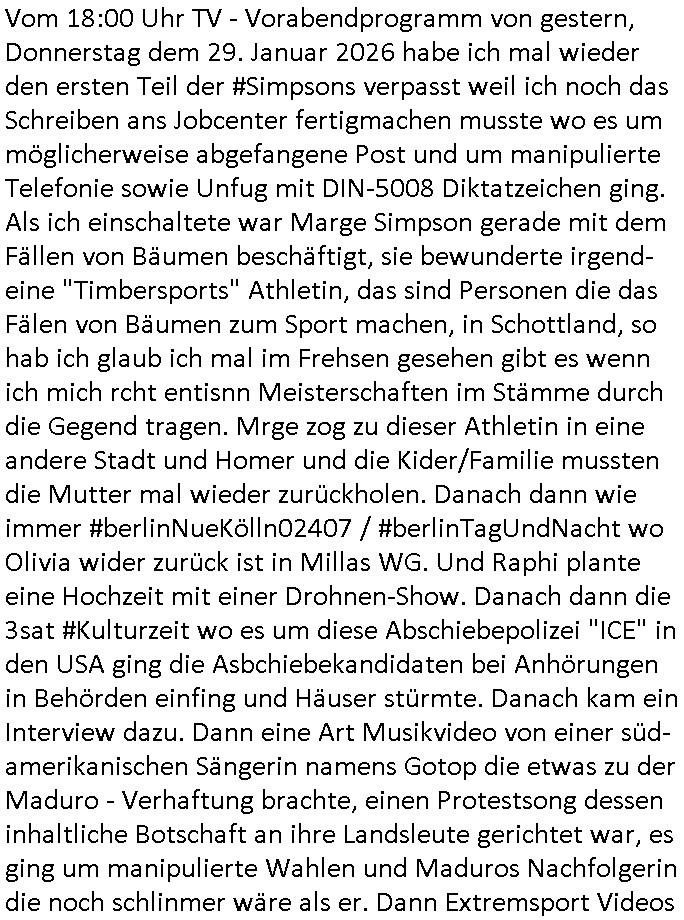 | Vom 18:00 Uhr TV - Vorabendprogramm von gestern, Donnerstag dem 29. Januar 2026 habe ich mal wieder den ersten Teil der #Simpsons verpasst weil ich noch das Schreiben ans Jobcenter fertigmachen musste wo es um möglicherweise abgefangene Post und um manipulierte Telefonie sowie Unfug mit DIN-5008 Diktatzeichen ging. Als ich einschaltete war Marge Simpson gerade mit dem Fällen von Bäumen beschäftigt, sie bewunderte irgend- eine "Timbersports" Athletin, das sind Personen die das Fälen von Bäumen zum Sport machen, in Schottland, so hab ich glaub ich mal im Frehsen gesehen gibt es wenn ich mich rcht entisnn Meisterschaften im Stämme durch die Gegend tragen. Mrge zog zu dieser Athletin in eine andere Stadt und Homer und die Kider/Familie mussten die Mutter mal wieder zurückholen. Danach dann wie immer #berlinNueKölln02407 / #berlinTagUndNacht wo Olivia wider zurück ist in Millas WG. Und Raphi plante eine Hochzeit mit einer Drohnen-Show. Danach dann die 3sat #Kulturzeit wo es um diese Abschiebepolizei "ICE" in den USA ging die Asbchiebekandidaten bei Anhörungen in Behörden einfing und Häuser stürmte. Danach kam ein Interview dazu. Dann eine Art Musikvideo von einer süd- amerikanischen Sängerin namens Gotop die etwas zu der Maduro - Verhaftung brachte, einen Protestsong dessen inhaltliche Botschaft an ihre Landsleute gerichtet war, es ging um manipulierte Wahlen und Maduros Nachfolgerin die noch schlinmer wäre als er. Dann Extremsport Videos