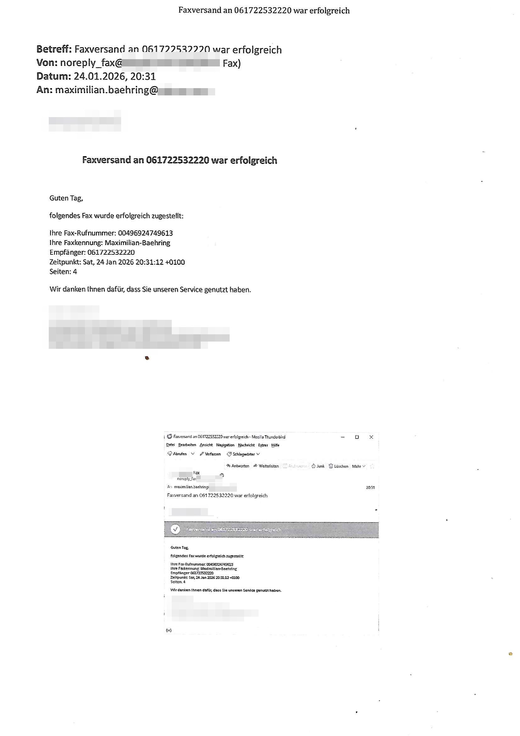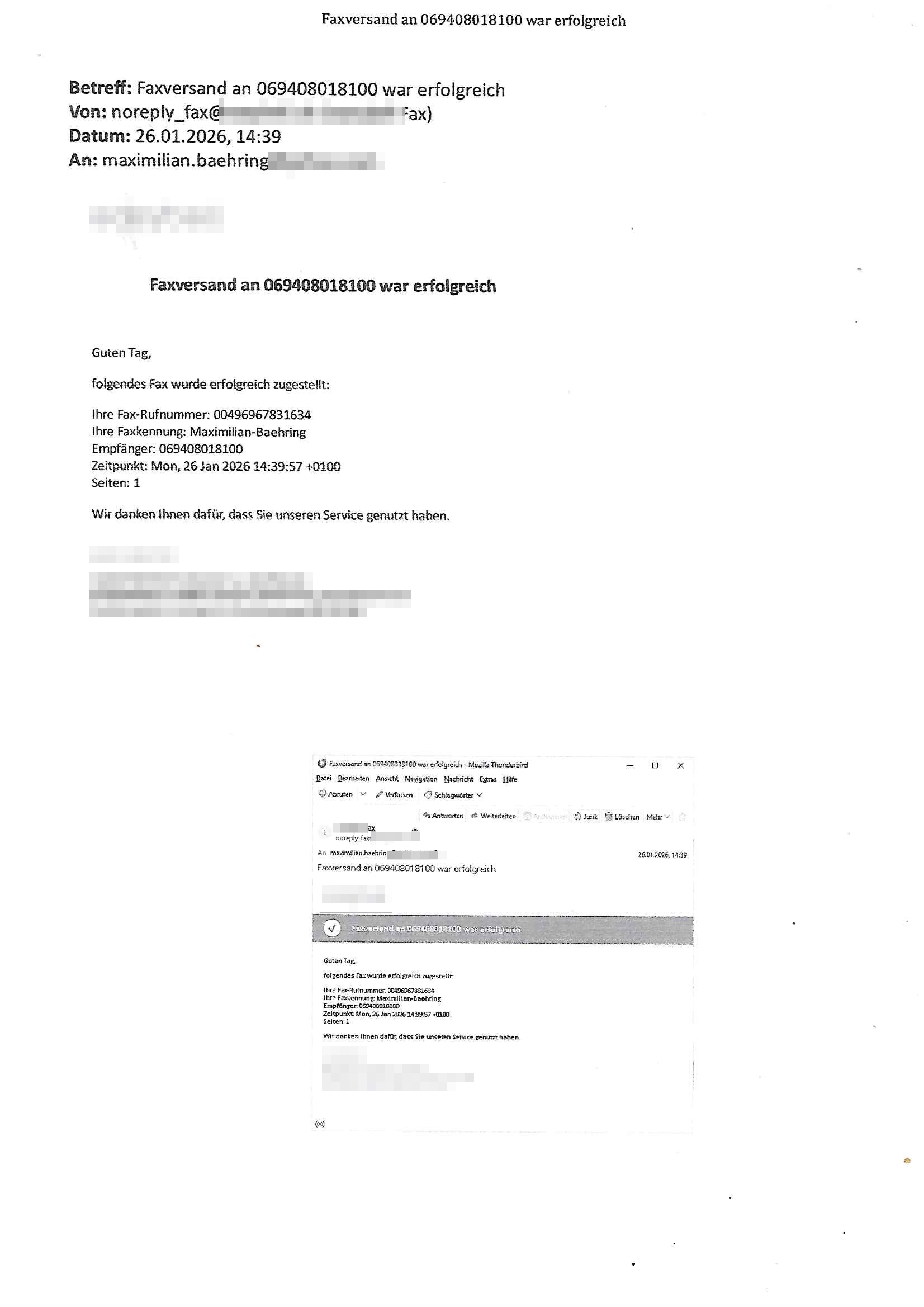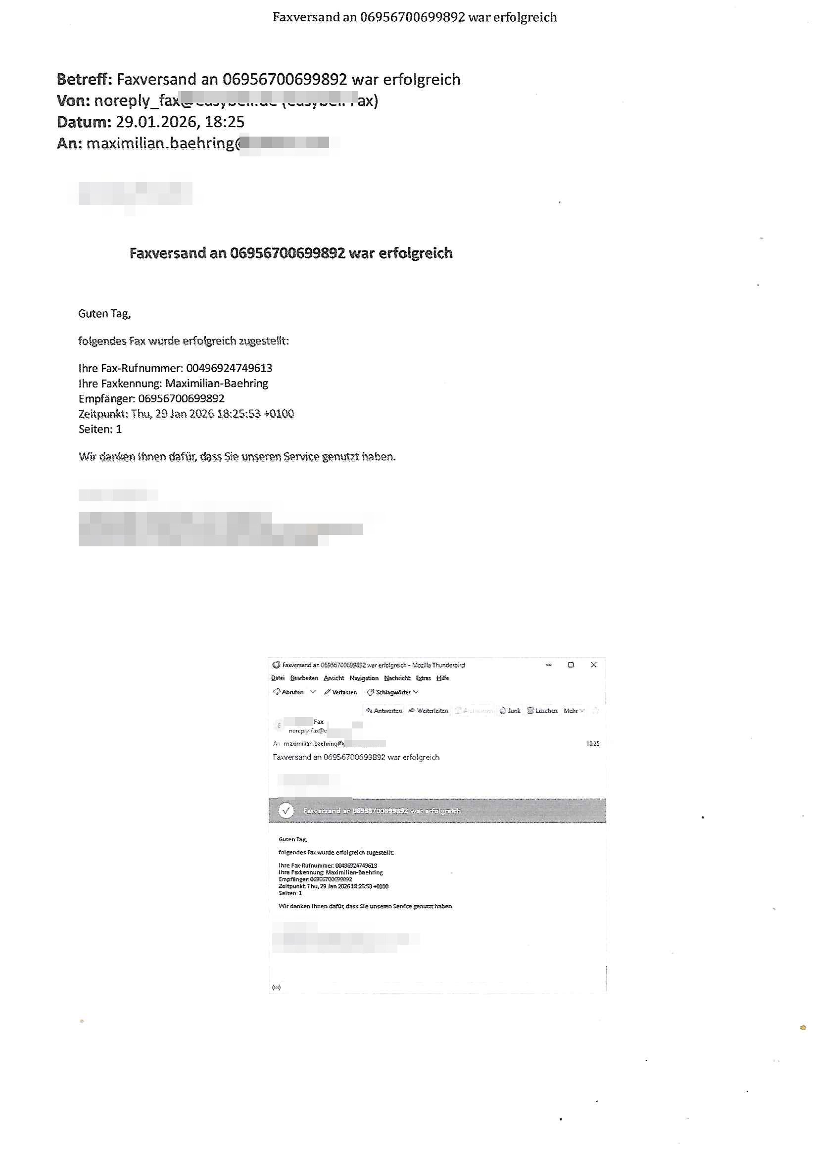 Betreff: Faxversand an 06956700699892 war erfolgreich Datum: Thu, 29 Jan 2026 17:25:53 +0000 (UTC) Von: Fax <noreply_fax@> An: maximilian.baehring@ Web2Fax Faxversand an 06956700699892 war erfolgreich Guten Tag, folgendes Fax wurde erfolgreich zugestellt: Ihre Fax-Rufnummer: 00496924749613 Ihre Faxkennung: Maximilian-Baehring Empfänger: 06956700699892 Zeitpunkt: Thu, 29 Jan 2026 18:25:53 +0100 Seiten: 1 Wir danken Ihnen dafür, dass Sie unseren Service genutzt haben. | |