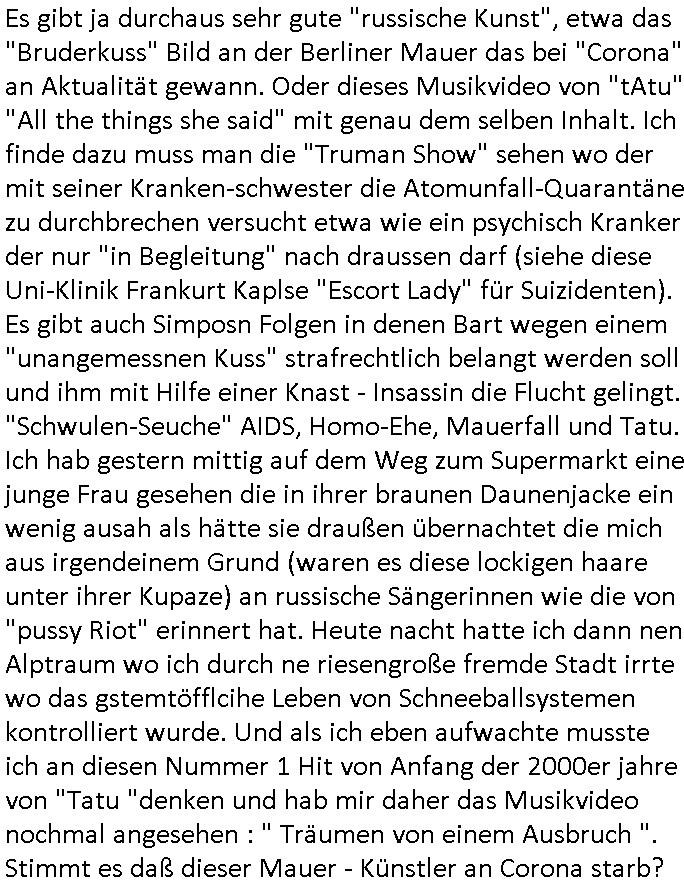 | Nachtrag zu "#tAtu - all the things said / #eastSideGallery / "Mein Gott hilf mir diese tödliche Liebe zu überleben" in Verbindung mit dem unerwünschten Kuss (aber auch #Würgegriff) der #Simpsons (Vater und Sohn) (, oder Schwester Ratchett aus #einerFlohÜbersKuckuksnest). Es gibt da diese Stelle "I'm in serious shit, I feel totally LOST, If I'm asking for help it's only because" ... und an der ist irgendne tiefbreite Synapsen-Furche in meiner Hirnrinde, ich muß an dieser Stelle mit "LOST" immer an "to #LOST in you" denken "Patricia Kaas" "quand j'ai peur du tout", in der "#sugababes" Version aus diesem Weihnachtsfilm. so wie wenn bei einer zerkratzten Schallplatte die Nadel mitten im einen Song hoch und auf einen anderen Song umspringt. Und dann musste ich an "Shopping Queen" - Vera denken und Krankenschwester Aleks und das Cento. An 9/11 und den Tag wo ich sie vom Arzt abholen sollte und etwa in Höhe der Kindearztpraxis an der "schönen aussicht" Ecke "Ferdinandstraße" das Cabrio in Richtung "MarienbaderPlatz" lenkte wohl vom Büro her kommend. "Das Bein war noch drann" stellte ich nach ihrer OP fest. Und ich erinenr mich an ne Debatte übers Thema "(Heli) Flugangst" bei der "Bell UH" Landung auf dem Botschafts Gelände beim Bangkok Staatsbsuch. Daß man Menschen nicht betäubt / gefesslt abschieben könne im Flugzeug so "das Schweigen der Lämmer"/ "Con air" artig. Und dann ans Gespräch im Hexenkessel über Luftfahrtbundesamt Statistiken zu Passagier - Todesfällen im Luftverkehr nach