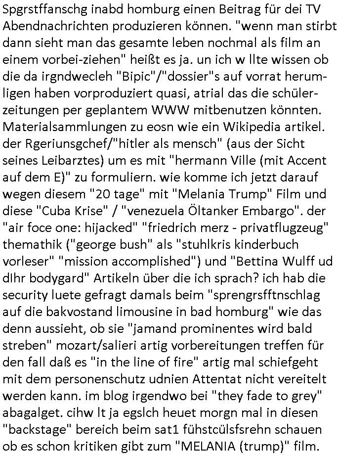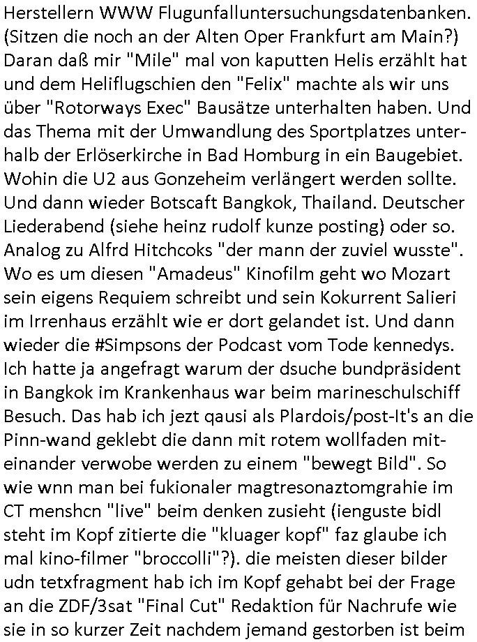 Herstellern WWW Flugunfalluntersuchungsdatenbanken. (Sitzen die noch an der Alten Oper Frankfurt am Main?) Daran daß mir "Mile" mal von kaputten Helis erzählt hat und dem Heliflugschien den "Felix" machte als wir uns über "Rotorways Exec" Bausätze unterhalten haben. Und das Thema mit der Umwandlung des Sportplatzes unter-halb der Erlöserkirche in Bad Homburg in ein Baugebiet. Wohin die U2 aus Gonzeheim verlängert werden sollte. Und dann wieder Botscaft Bangkok, Thailand. Deutscher Liederabend (siehe heinz rudolf kunze posting) oder so. Analog zu Alfrd Hitchcoks "der mann der zuviel wusste". Wo es um diesen "Amadeus" Kinofilm geht wo Mozart sein eigens Requiem schreibt und sein Kokurrent Salieri im Irrenhaus erzählt wie er dort gelandet ist. Und dann wieder die #Simpsons der Podcast vom Tode kennedys. Ich hatte ja angefragt warum der dsuche bundpräsident in Bangkok im Krankenhaus war beim marineschulschiff Besuch. Das hab ich jezt qausi als Plardois/post-It's an die Pinn-wand geklebt die dann mit rotem wollfaden mit-einander verwobe werden zu einem "bewegt Bild". So wie wnn man bei fukionaler magtresonaztomgrahie im CT menshcn "live" beim denken zusieht (ienguste bidl steht im Kopf zitierte die "kluager kopf" faz glaube ich mal kino-filmer "broccolli"?). die meisten dieser bilder udn tetxfragment hab ich im Kopf gehabt bei der Frage an die ZDF/3sat "Final Cut" Redaktion für Nachrufe wie sie in so kurzer Zeit nachdem jemand gestorben ist beim Spgrstffanschg inabd homburg einen Beitrag für dei TV Abendnachrichten produzieren können. "wenn man stirbt dann sieht man das gesamte leben nochmal als film an einem vorbei-ziehen" heißt es ja. un ich w llte wissen ob die da irgndwecleh "Bipic"/"dossier"s auf vorrat herum-ligen haben vorproduziert quasi, atrial das die schüler-zeitungen per geplantem WWW mitbenutzen könnten. Materialsammlungen zu eosn wie ein Wikipedia artikel. der Rgeriunsgchef/"hitler als mensch" (aus der Sicht seines Leibarztes) um es mit "hermann Ville (mit Accent auf dem E)" zu formuliern. wie komme ich jetzt darauf wegen diesem "20 tage" mit "Melania Trump" Film und diese "Cuba Krise" / "venezuela Öltanker Embargo". der "air foce one: hijacked" "friedrich merz - privatflugzeug" themathik ("george bush" als "stuhlkris kinderbuch vorleser" "mission accomplished") und "Bettina Wulff ud dIhr bodygard" Artikeln über die ich sprach? ich hab die security luete gefragt damals beim "sprengrsfftnschlag auf die bakvostand limousine in bad homburg" wie das denn aussieht, ob sie "jamand prominentes wird bald streben" mozart/salieri artig vorbereitungen treffen für den fall daß es "in the line of fire" artig mal schiefgeht mit dem personenschutz udnien Attentat nicht vereitelt werden kann. im blog irgendwo bei "they fade to grey" abagalget. cihw lt ja egslch heuet morgn mal in diesen "backstage" bereich beim sat1 fühstcülsfsrehn schauen ob es schon kritiken gibt zum "MELANIA (trump)" film. daher ging mir der "pet shop boys/minallei" "loosing my mind" song aus "follies" durch den kopf vorhin. und ich musste an die "30 jahr frühstücksfernsehen" denken. wo alle andern sender mit live schalten gratuliert haben. und ich hab mir noch so überlegt wie "die Gestalkte" "morning show" Moderatorin in dieser "backstage" kino Kritik über einen Film sprechen muß in dem ihr diese Rality "Aniston" (aus der happy meals packung) die show stiehlt. udn daß sich das ungefähr so anfühlen muss wie wenn man als "palmina merkel" sehr gute kinokritiken zu "#morningGlory" verkraften muss (das ist diese "fridget Jones" koch show , mit präsidntendarsteller "ford") die aus boulevardmagazinen und kuresndung kommen so ählöch wie be de rlive schate "30 jahre frühstücks-TV". Wenn Marlene eLufen die Kekse backt bei Böhmi im 2DF Neo migazin royals aber Kolegin karen heirichs dafür den ganzen Ruhm erntet. Und dann diese "Ketchupexpertin Stalkerin" von dieser "Sat1 Akte Sodnersedung" "Online Hate Oma (80)" getauft damals. Und die past überhaupt nicht in dieses Präsidentenbesuch / Weihanchtsbäckerei in der Kita Tham mit dem Heli und dem sicherheitshalber im frachtraum dermshcine mitfliegendem Sarg hinein. dieses "präsdient johnson" erdigung TV interview zu beginn des fatboy slim "bird of prey" videos vor diesem aufsteigen lassen der kampfjets währen der "cuba krise". diese sache mit dem "don't sop me now" "flugeuige einweisen" lichtschwert bei der afroamreikanerin mit #Simpsons Fatsby "diss rap" "rammstein" ritterrüstung. ich mienwiepackt mansowas um ien webrpause für den "mc donalds" chili-fastfoode das so scharf ist daß die (medizinisch begleiteten) testesser davon diese "es ist wirk-lich war" tränen in den augen haben? und jetzt ZDF TV Autorinnen bleistifte angespitzt: wie macht der Hund? https://www.mcdonalds.com/de/de-de/GermanyNewsroom/article/mcspicy.html https://decl-war.tumblr.com/post/143224309678/german-electronic-resist-ances-nuclear-football | |
