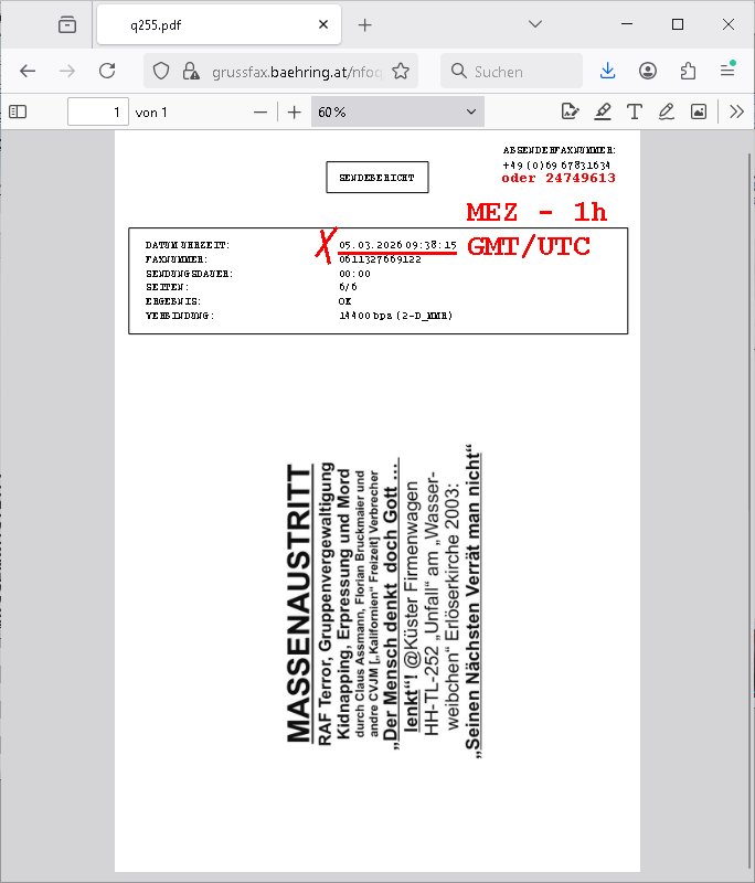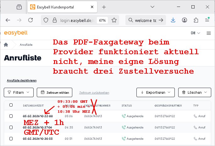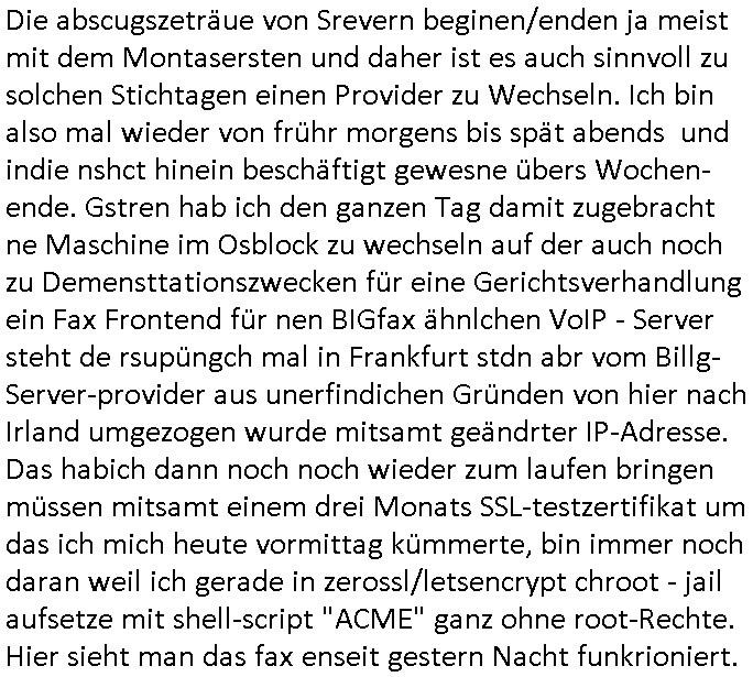 | Die abscugszeträue von Srevern beginen/enden ja meist mit dem Montasersten und daher ist es auch sinnvoll zu solchen Stichtagen einen Provider zu Wechseln. Ich bin also mal wieder von frühr morgens bis spät abends und indie nshct hinein beschäftigt gewesne übers Wochen- ende. Gstren hab ich den ganzen Tag damit zugebracht ne Maschine im Osblock zu wechseln auf der auch noch zu Demensttationszwecken für eine Gerichtsverhandlung ein Fax Frontend für nen BIGfax ähnlchen VoIP - Server steht de rsupüngch mal in Frankfurt stdn abr vom Billg-Server-provider aus unerfindichen Gründen von hier nach Irland umgezogen wurde mitsamt geändrter IP-Adresse. Das habich dann noch noch wieder zum laufen bringen müssen mitsamt einem drei Monats SSL-testzertifikat um das ich mich heute vormittag kümmerte, bin immer noch daran weil ich gerade in zerossl/letsencrypt chroot - jail aufsetze mit shell-script "ACME" ganz ohne root-Rechte. Hier sieht man das fax enseit gestern Nacht funkrioniert.