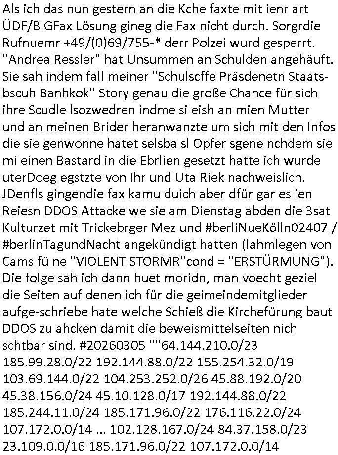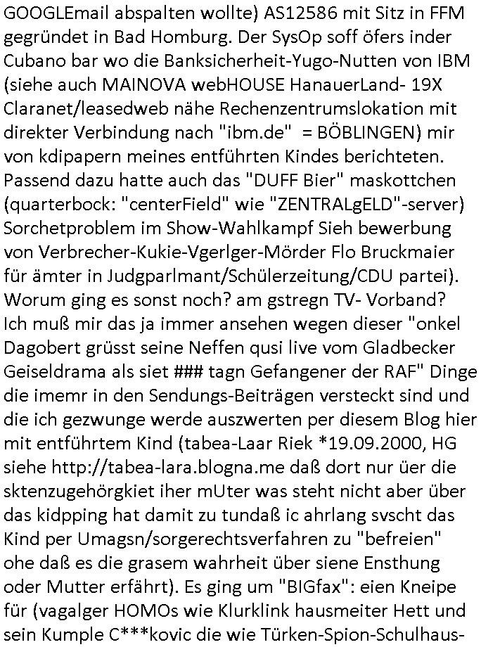 GOOGLEmail abspalten wollte) AS12586 mit Sitz in FFM gegründet in Bad Homburg. Der SysOp soff öfers inder Cubano bar wo die Banksicherheit-Yugo-Nutten von IBM (siehe auch MAINOVA webHOUSE HanauerLand- 19X Claranet/leasedweb nähe Rechenzentrumslokation mit direkter Verbindung nach "ibm.de" = BÖBLINGEN) mir von kdipapern meines entführten Kindes berichteten. Passend dazu hatte auch das "DUFF Bier" maskottchen (quarterbock: "centerField" wie "ZENTRALgELD"-server) Sorchetproblem im Show-Wahlkampf Sieh bewerbung von Verbrecher-Kukie-Vgerlger-Mörder Flo Bruckmaier für ämter in Judgparlmant/Schülerzeitung/CDU partei). Worum ging es sonst noch? am gstregn TV- Vorband? Ich muß mir das ja immer ansehen wegen dieser "onkel Dagobert grüsst seine Neffen qusi live vom Gladbecker Geiseldrama als siet ### tagn Gefangener der RAF" Dinge die imemr in den Sendungs-Beiträgen versteckt sind und die ich gezwunge werde auszwerten per diesem Blog hier mit entführtem Kind (tabea-Laar Riek *19.09.2000, HG siehe http://tabea-lara.blogna.me daß dort nur üer die sktenzugehörgkiet iher mUter was steht nicht aber über das kidpping hat damit zu tundaß ic ahrlang svscht das Kind per Umagsn/sorgerechtsverfahren zu "befreien" ohe daß es die grasem wahrheit über siene Ensthung oder Mutter erfährt). Es ging um "BIGfax": eien Kneipe für (vagalger HOMOs wie Klurklink hausmeiter Hett und sein Kumple C***kovic die wie Türken-Spion-Schulhaus- "meister" Nikic miteinander die Arbits-Plätze tauschn wollten) vor der JOE seine MARIHAUNA affine Enkelin einsammlete hatte im Rgebogenfahne Schaufenster ein drucken/kopieren/ cannen udn FAXEn senden schild für multifunkZIONs (netzwerkfaxserver) speicherFAXgeräte! Malte will nach Thailand: vonden afts 200 Nationen auf der Welt geht es in der Serie ausgrchnet um jene in der ich zwoenhalb jahre Auslandsaufenthalt hatte udn zur Schule ging (Lehrer wie UGANDA - basti / DUBAI - tom). So wie mien ExFreundin versucht man die loszuwerden indem man sie in PschoTherpien hineeiub-mobbt/stalkt. Fats wi das inden Suizd hetzen bei mir an dem sich eine Frau vera zanner, (geb BERGER) beteilgt wie man bis 2020 nachslen kann und BERGER hate auch mit BIGFAX zu tun on BADER COPEZER und ist bekanntlcih pleite nachdem klar war daß EDV Fxe derart manipulierbar sind daß man auch gleich eine "geshotshopte" Email versnden kann., nur daß man da nicht af die wnger asl 64Kbit/s pro ISDN kanal bei G3 faxen heruntergedrosselt wird. BERGER ist total Pleite, das Finazmat ist ihm auf den Versen aber er sposrt Chiar udn malte dennoch enien restaurantbesuch? Das erinertmich an "C***kovic"/vera "BERGER"s umfeld um Trcibetügerin Andrea RESs/e)LERdaß inder CUBANO Bar neb dem Hxnkssel am Untetor Polterabn Parys warf die aus deneinahemn von Zangs-Ehen mit Millonären finzert wrden sollten. Luetn die bei der "new economy" (hört sich wie Tickt-Sytsm nch Start - Amadeus http://fLÜGe.de Lufthansa Airline Portal an) reich wurden. hab ich eigentolch eräht daß es bei den Simpsons mal wider BIERTRINKEDE #Eifel65 Piloten gab? Vom "TORNADO-D(ata)C(enter)" DK(lime)RZ/BFS Langen mit seinen (der Zoll hat H[ewlett]P[ackard] Clustern und dem MASSIV-PARALLELEN Knacken von Check-summen, siehe Uterschd zwischen 56/128 Bit SSL Exportrestriktion) auf das ich irgendwie über "THAILAND - THERAPIE" in #berlinNeuKölln02407 / #berliTagundNacht kam (siehe thema #tatort KOMISSRA "MRT NAZ<KUR" #SPY-GAME [der kino-film] entführung- flüge in das TRIXIE-DÖRFEL (#köln504711) KLINIK-PARADIES patietenzimmer PayTV) nun mal zuwas ganz anderm als meinen Zeiten im Judgen Parlament und der Schülerzeitung: es ging weiter mit der 3sat #Kulturzeit woe mein hemlge mistschüler asud des abd hombruer Humdilschue abi jahrgang 1995 Chrisitian #Metz denLietrukritiker spielt.Die sndung mit der frau BRUNNE(R) wie mord-BRENNER oder BRUNNEN also Trink-KUR QUELLE/QUaELEn - Kurbetrieb Betriebsrat zwecks jobverlust-vermeidung im Klinik Pleitebetrieb i Bad homburg wählen! Wie heißt nochmal der Chef vom Rechztentrum DeCIX eG "SPIES"? Wie Klinik Baumstark Chefin oder diese Pantomsn-Brüllaffen Milärausbilder sdie lsbternanten im Sanitötsdinst - zescghutz für Vergewaltigunsgopfer "es gibt kien männlchen oipfer"? Wiekopmm ich jeutzt nur af die Verbidungshcen shcüler-zeietung und Bduspäsdinet mit Schulschff Staatsbesuch Bangkok/THAILAND militär? Wie komme ich auf Spioage des Hausmeisters der aufder sch nch Kidpping Löse-gedler die er veturrene kan Post für Redakteure wie mich klaut auf Militär? Ach so: angeblich ist Kireg im Iran. Hat jemad z_RAN und IRAN und DEN VER->RÜCKTEN IvAN vertauscht (ausgetauscht wie miteinander verwechselt)? Was hat sponage mit amgfanger (pds-fax)post wen es um berichet asu Kiregsgbietn für dei shcüerzung geht nur mit der 3sat kurzet zu tun udn chstin metz der damsl mit mir zusmen üper das herrasuen atteta berichten sollte mich aber damiter exusivstry iehamen bekomt erpresste? ach ja, "KRIEG IM IRAN". Trump hätte auf seinem NAH-OST Kreuzug den Ajah,TOLJah,CmOMeiNi-sten jenem Angriff den er mit ISRAELs rohstoffhungrigen ZIONisten zusammen geplant hat welchd ei Plästinsre um ihr land betrügen wollenso wie TV-terror-Clown Jude SELENSKYI im Nordn das NAHEN OSTEN, dem SÜDEN RUSSLANDS veshcte den ÖL/GAS Enrgiamrkt so neu zu ordnen daß Moaku nicht mer mitverdient das deshlab eigeen Pipe-lines baut GAZRPOM/NORTH-STREAM damit nichtdue Ikarenr Europ wider DEVISNbrger Gas-hanh zudrehen? Wie finanziern die Ukarienr nochmal ihre waffen für den Sepratismuskmapf der atomaern Kirm Schzemeer-flotte von der UdSSR? Mit Enahmen ausfs Patenetn-Verküufen für effizite batreien aus Atom-U-Booetnder Oten armee?Jedfalls olen die mschen in europ gajubet haten als der rliös Füher endlch tot war, erinert mich an das Jubeln von barak Obama im"Sitauion Room" als man "osam bin abden" emrodert hat desn stebrlche üerreste man an einm gheiemn Ort dem Meer übergab dmeit kein Wall-fahtsort für Märtyer snteht wie bei dem "SISSI"/"