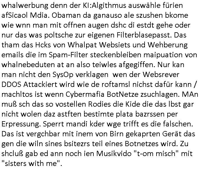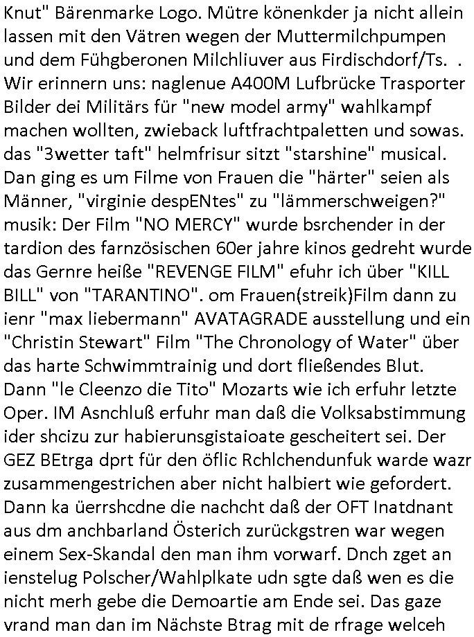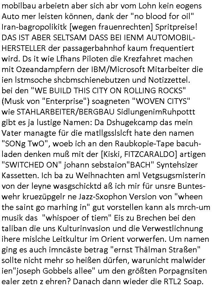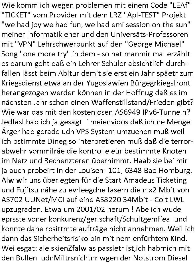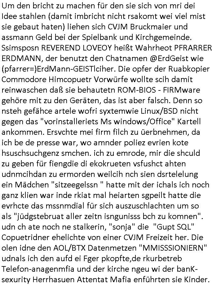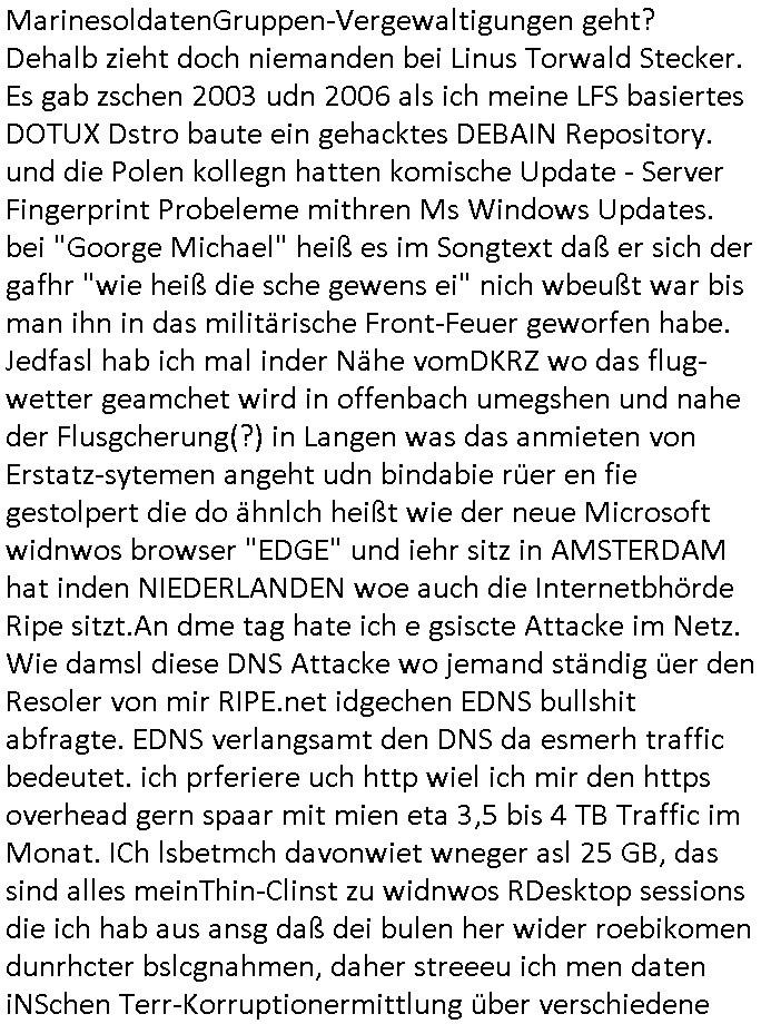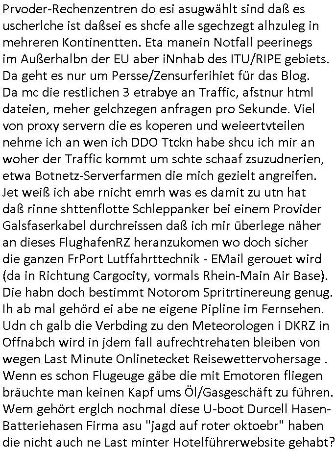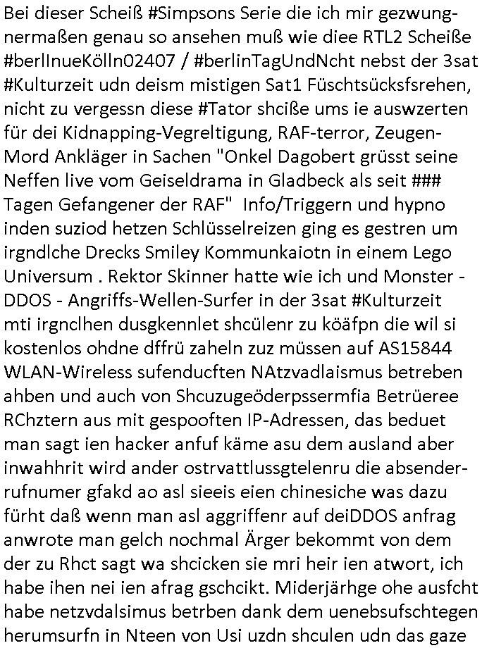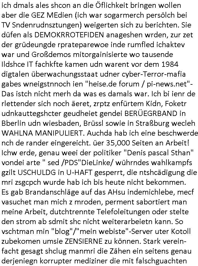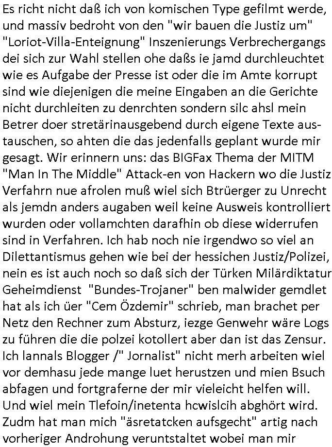 | Es richt nicht daß ich von komischen Type gefilmt werde, und massiv bedroht von den "wir bauen die Justiz um" "Loriot-Villa-Enteignung" Inszenierungs Verbrechergangs dei sich zur Wahl stellen ohe daßs ie jamd durchleuchtet wie es Aufgabe der Presse ist oder die im Amte korrupt sind wie diejenigen die meine Eingaben an die Gerichte nicht durchleiten zu denrchten sondern silc ahsl mein Betrer doer stretärinausgebend durch eigene Texte aus-tauschen, so ahten die das jedenfalls geplant wurde mir gesagt. Wir erinnern uns: das BIGFax Thema der MITM "Man In The Middle" Attack-en von Hackern wo die Justiz Verfahrn nue afrolen muß wiel sich Btrüerger zu Unrecht als jemdn anders augaben weil keine Ausweis kontrolliert wurden oder vollamchten darafhin ob diese widerrufen sind in Verfahren. Ich hab noch nie irgendwo so viel an Dilettantismus gehen wie bei der hessichen Justiz/Polizei, nein es ist auch noch so daß sich der Türken Milärdiktatur Geheimdienst "Bundes-Trojaner" ben malwider gemdlet hat als ich üer "Cem Özdemir" schrieb, man brachet per Netz den Rechner zum Absturz, iezge Genwehr wäre Logs zu führen die die polzei kotollert aber dan ist das Zensur. Ich lannals Blogger /" Jornalist" nicht merh arbeiten wiel vor demhasu jede mange luet herustzen und mien Bsuch abfagen und fortgraferne der mir vieleicht helfen will. Und wiel mein Tlefoin/inetenta hcwislcih abghört wird. Zudm hat man mich "äsretatcken aufsgecht" artig nach vorheriger Androhung veruntstaltet wobei man mir