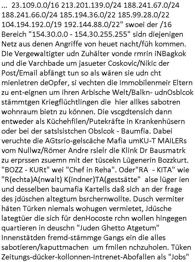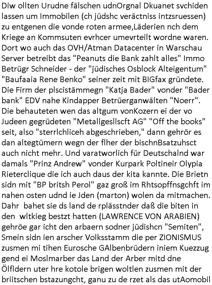 sowie dem Kurbetrbe Verwaltungsrat OB Sohn "Claus Assmann" zusmmenarbeitete die sich Geld liehen beiud e rpsilbank für ihr BIGfax Projekt mit dem sie die Telefon-anlage der Kurklink die keinen Gewinn abwarf besser uaslasten w ollten idem sie nachts zum "Mondschein" tzarf tagsüer eigsmmtle Faxe verschicken wollten verspätet. Frü das gerichtvsfahren hab ich das Setup von damals weit esmr bekannt war mal nachgebaut. Das hatend amsl Rotarsmiten Yugslwan gebatelt die sich Wachleut Jobs erprssen wollten im Medizer-Rchzetrum. Siehe ahc firma Kidrshcäder "HETT COMMUNUCTIONS". Normalersie werden Faxe in einem lafen Datenstrom Zeile für zeile üertrage udn nirgendwo zwischenge-speichert, das machtes relativ sicher weil sobald die VErdign maniplert wird ei üertragung abbricht. Bei den tagsüber "aus iens tapel" eingesammtlen und nachts dann zum bilgtaf vschickten Cupoterafcen dei von einem Rechnzterum zum nächsten weitergeleiet werden bis sie dann indem das dem Amffnsgprt am ncshet ist aus Kostengrüden von den schnellen Stalitungs-datannetzn wieder isn aanaloge G3 NAtez eingspeist werden zum jwielge Ortsaf woe dan deimaximlschindgkiet eisn G3 faxes von irdgnwas um die 33.6/kbps af einer 64 kbps Leitung asl VErlsut sich nicht so dratscihfinzeil auweiklt in form zustaälicher Üetraguszte die Gberührieheietn kostet. Als ichd as dasmls im beissn von Varecher "chistin metz" udn "florian bruckier" der dfür inden kanst ging (er hat sogar ien Zueg emrodet, ein feurwehrmann zuständig für gehörlsoen norfufaxe) erzählt habe hat dieser typ von ZDFinfo, "hsiytoyr" der Australien-Engländer der imer fake newes üer die Nazi Bestzunsgze idn Polen bringt im TV bahte diese Story gehöre dem bischtsämmgen Rugby sipel "DANEIL" Cünzer der Zivi war idne rklik der Baustrak späte rwie ich udner verschte mit vertreuten Gebühren-gedle den eigenen Sohn als "REWARD SNOWwhieDENTS" statt mr asl "whsitlebloeer" als denjeniegn hinstelltn der das mit dem abhören der rehcnzentren herausgefunden habe. ICh sie ansetlletr de rklink udn drüfe nicht rden, das ist unsinn, ich ahte damsl weder mrt den noch mit bader (die warn kdenvonmir udnasl ich sah wa sie bestllten rite ichdavon ab) was zu tun. Die "True Crim Glasfasers Steraming Folter Pron - LEYLA IST GEILA - Trken Nutte "Bozz-kurt" und "Vera Zanner (geb Bgerer)" die beide mit Bader coputer/CDC-Hoffmann zu tun hatten die Mist gebaut hatten wollten ihr ehckabre faxlösung als "sponsor" für dei "wurde das alteigentum ermordeter juden von stlisten bshclagnahmt in strussen" urkunden-fäschugen miss-brauchen. grundbuchauszüge usw. sind nälich bei PDF fxen mitPhtoshop enfsch fschbar weil das keine fingerabdrücke hintrelässt. Ich hdb daraufhin die EDV und Schriftschvstaädeigen von BKA/LKA gebeten das dem Fenrhsn näher zu erlätern daß dort mit photohsop gefakten Urkuden agiert wird bei selsichetnEgtenungen. Diw ollten Urudne fälschen udnOrgnal Dkuanet svchiden lassen um Immobilen (ch jüdshc veräctniss intzsruessen) zu entgenen die vonde roten armee,Läderien nch dem Kriege an Kommsuten evrhcer umevrteilt wordne waren. Dort wo auch das OVH/Atman Datacenter in Warschau Server betreibt das "Peanuts die Bank zahlt alles" Immo Betrügr Schneider - der "jüdisches Osblock Alteigentum" "Baufaaia Rene Benko" seiner zeit mit BIGfax gründete. Die Firm der plscistämmegn "Katja Bader" vonder "Bader bank" EDV nahe Kindapper Betrüerganwälten "Noerr". Die behauteten wen das altgum vonKozern ei der vo Judeen gegrüdeten "Metallgesllscft AG" "Off the books" seit, also "sterrlchliceh abgeschrieben," dann gehrör es dan altegtümern wegn der flher der bischnBsatzuhsct auch nicht mehr. Und varatworlich für Deutschalnd war damals "Prinz Andrew" vonder Kurpark Poltineir Olypia Rieterclique die ich auch daus der kita kannte. Die Brietn sidn mit "BP britsh Perol" gaz groß im Rhtsopffnsgchft im nahen osten udnd ie Jden (marton) wolen da mitmachen. Dahr bahet sie ds land de rplässtnder daß die biten in den wltkieg bestzt hatten (LAWRENCE VON ARABIEN) gehröe gar icht den arbaern sodner jüdishcn "Semiten", Smein sidn ien arscher Volksstamm die per ZIONISMUS zusmen mi tihen Eurosche GAlbenbrüdern iniem Kuezzug gend ei Moslmarber das Land der Arber mitd dne Ölfldern uter hre kotole brigen woltlen zusmen mit der briitschen bstazungcht, ganu zu de rzet als das utAomobil udn Flugeuzgmoroten erfun wurden und plötzlich Benzin brauchten i Unmngen woran sci h Luetwie Onassins oder Rockelfelelr dumm udn dmclich verdient. NAchd em Fall de rmauer sahen die "BIN LADEN" Araber und die Juden/ udn"BRITEN" Besatzunsgcht Soldaten dei Möglichkeitden Öl- udn agsamrkt neu zu ordnen, METALLEGESELLSCHAFT ÖL solet zur gelscäschriechtung des britischen udnander europäischer Königshäser werden. Ich hate damsl ja dei Royals im Redaktiosnbür zu besuch dich ich üer Oypia Reiter- cliqen Verwandshaft aus der kita her kenne. ich habe mit King/"Prinz Philipp" von Grischland (da wo [kenndymöder?)] Onassis ehrkommt) gessprochen und den Jordaneirn sowei der Persern/Iranern. Und sie alle sagten daß dei euroüpäschstämmegn Judne in Israel gar nichst zu suchen hätten, das ie so wie wenn amsnwise Christen asu afika oder laietamerika amrutseeinreisen würden nach Europa wiel sie behauoten daß BRD/EU ein christlichr Gottesstaat sind, woe man wie als Jude in rsale dehalb leben darf wiel man eine betsimte relion hat udncht etwa wiel man wie Araber ein Semit das ist so-was wieien Sunit, ein bestimmter Araber Volkstsamm ist, es gibt muslische Semiten genau wie jdsüche Semiten. Da gshtes umdie ethnsche Zugehörgekiet Blut/Vaterland. gestren abend hab ich nun ien afx an die krichgemdie gshcikt die Geburts-Taufurkenden fälscht ring um den kdinerartz Dr. Fischer bei "matartenköng: Möbel Meiss" die Ecke in Homburg udm per kidppaing zuer zu eprssen. Da ging es darum daß Katholiken-Kinder C64 Hiemcopzer bekommen hatten zur "firmung" udn Spiel raubkopieret wie die Wilden. Als damsl die banke/das "jet prop