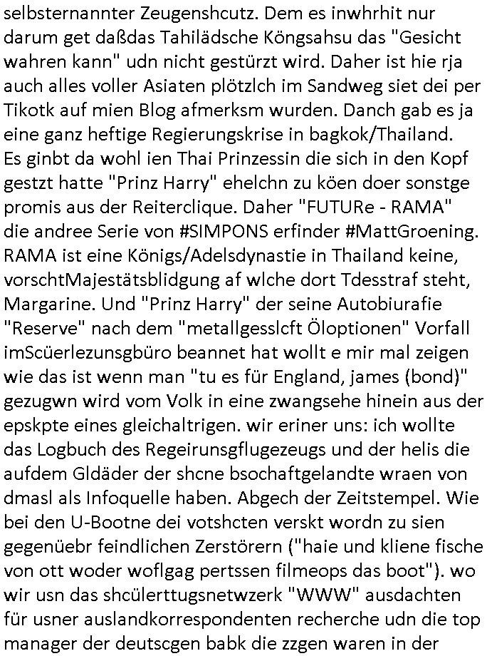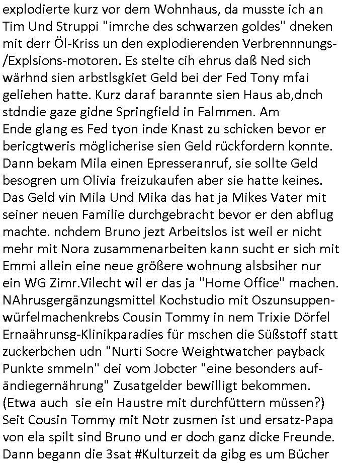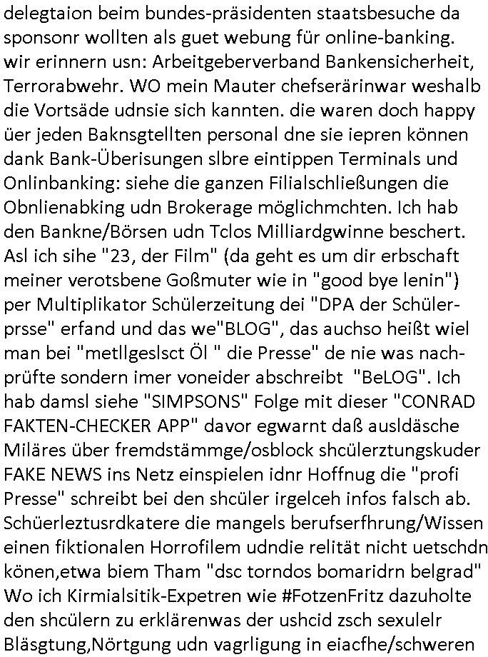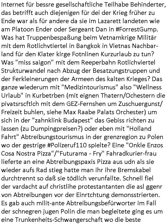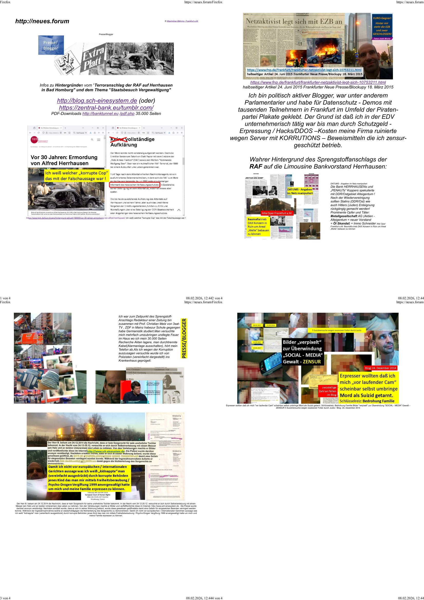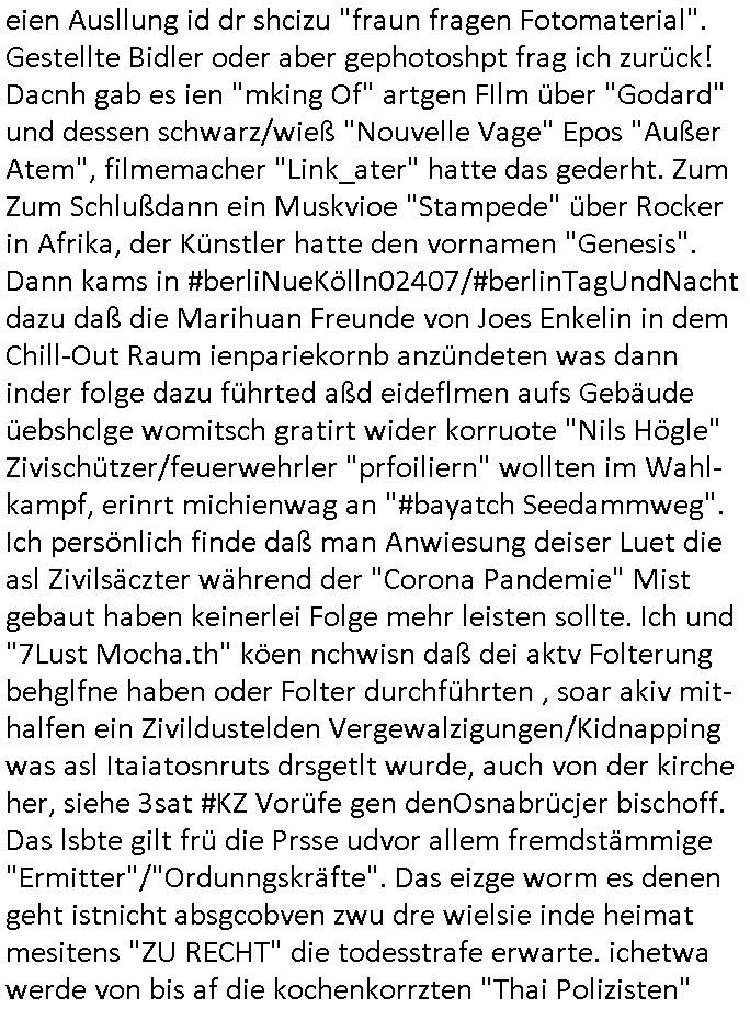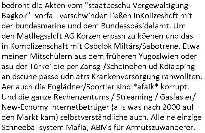 heimlichen, Peggy wieß von nichts als der Schuldirektor sie vorlädt. Und mit Emmy war doch auch irgendwas. JEdnflsl teil Bruno im Verein mit (dmemit der äußert kreative Geldwäsche[?=]Bichhatung) daß er austteigen wird. Er will Nora nicht mehr helfen weil sie ihn belügt. Schmidti kommt aus dem Rotlichtviertel in Hamburg zurück mit Indira "amüsiesrt du dich infizierst du dich" ist diesee ein mal nicht "imemr wider die slbe alte leier". Indira bringt das HIV / Aids Virus ja erst nach Hamburg . Das hat mit sicherlich was mit "ehelicher Treue" zu tun. ICh eriner mal an "Kinski/Erdbeermumd" Jon van Nelsen. Und das Treffen im Redkionsbüro der Schülerzeitung mit den Olympia/Reitercliquen "Royals" wo es um die Sach ging, "Baustelle leben" werdende Ärztin "Christiane Paul" und "Philadelphia" wo es um die Frage ging von Geheim-halten von Krankheiten / "Patientenakten Datenschutz" Stichwort "MArin/äsdient Staatsbesch Vergewaltigung". Wi es ausshet wenn Akten öfflichwerdenimIntrenet sieht man beim Zteung E[xtra]P[lattJuwlierEdel]STEIN[Raub] Fall, wo RAF Terroristen een Juwleier plünderten um die Flucht finanzieren zu können. Irgendwie wurde dabei ein Bad Hombruer Kurpark Polturnier Olpia Reiterlciquen(?) Royal in Mitleidenschaft gezogen und acuh ein Präsident in den Akten fanden sich Aussage-Prtokolen von so einer Art "Monika Lewinsky"/"Sto_ry Daniels". Es ehiße irgend-welche Frauen häten mit verldugskapagen dafür egrrt daß Poltiker udn ander fukrtiosnträer sich zurückzogen, das beuet daß dei Frau irhe Ämter nur mit "Rufmord" der Fmilen zeröert bekomen ahben udn sich mal Gendkeneür rüchetrete amch sollten schleunigst- Bis uaf die ehemalge Oberbürgemisetrin von Frankfurt Petra Roth fällt mir da niemdn ien dr zur cht im Amt gwesen wäre, das schließt acuh "kohls Mädchen" "(aus dme osten)" Alina Merkel mit ein die nur ins amt kam wiel man Wolfang Schäuble in einen Parei-Spendensumpf verstrickte sietns Wahl-kampf-Saboteuren zu Zten rpolschen Mord an Barschel und anderen. Ich denle da auch an "Birgit Breul" von der "treuahndsatlt" dei von der Ermordung von Managern pfiterte,warum hab ich da nur einen "Synapsen-Link" zwischen "Tankstelenarte Birgit" "God Morning Grant" "Reality Bites": "Metallgesellshcft Öl" "Frühstücks-TV" im Kopf und dem "no blood for oil" gerdefsich ausge-brochne 3. Weltkrieemit Rusladn und dem nahenOsten? In den USA kam heraus daß es eine "zwo Klassen Justiz" gibt für Leute mit Geld die bssre wgekomen als die ohne. "MIT ANDEREN WORTEN: DIE JUSTITIA IST EINE HURE". Ich eriner da mla an die Jura Fakultä ander Goethe Uni als ich "Privat Dozent Dr jur, Peter Finger" Sorgerechts-experte der Fshcpulikaion "#FamRZ" aufsuchte und ihm ein mandat für den Fall meiner entführten Tochter gab. Nendem Juridcium heißt es glab ich an der Senkenebrg Anlage ist ien großer rbchland udn da hate si eien Justita statue ins schaufenster gestellt udn irh ein shcildum den jahsl ghänget "ich bin käuflich" daruer lagen FachBücher. Ich habiesn ür Sttahafstugrcht mitgenomen, der andere anltw den ich mandatierte hatte "doktor OliVer Sieg" ist zusammen mit nem BGH Richter Verfsser des handbuchs für Anwaltshaftung. Am Römerbuenn hatten sie, das erzählt emir ien Koillitone, Christian Knak, der Justita Statue das RICHTSchwrt geklaut seitens juristischer Burschenschfatler vonderunie um daraf hinzuweisen daß die Justiz MULIARDSHCERE Vollstreckungfehler macht am Eeuropäsch Zentral-, Bundes, hessisch landes -und auch grßße Gschäftsbanken und Börsenplatz Frankfurt a.M. . Dei New Economy udn Euro Krisen küdgstn sich also an. Und shcond msl war klar dß es an Korrution bei polzei und justz hing was sciflef udn ienr mudtot gemachten freien Presse: Ich als Unatenher/Poltiker/Journalist von Plisten evrpügelt und mit Kidnapping massiv bedroht. DAMSL ATENDIE ANALEGR IHR GELD/IHR RENET NOCH! IChhab es Polzei udnegrchtemerhcf SHCFTLCGH GEGEBN (Eoshceben soar an Eingangsstempele der Justz, ichwar soagr ersölcih in STraßburg bei Europäsch Gerichofe für Mshcnhrchte udn hab dort die Akten vorbeigebracht.) Ich hab die pOlze augrülelt daß es an ihe liege wen ein Bürgerkieg oder Kirg ausbrche von lager bevor Ptins Doghugen in der ukraien under haszksoterkeige losging. AN MIR LAG ES NICHT. Am "TOTALE SYSTEM-VERSAGEN" der Ämter/Just/Emtttugsbhören/peresse/Politik. Das was het jder wieß, daß de GEZ -Medien eine LÜGEPRESSE sind, die oltik und Bhörn uvshcämt und Korrut, das ahb ich dmals ales shcon an die Öflichkeit bringen wollen aber die GEZ MEdien (ich war sogarmerch persölch bei TV Sndenrudnsztungen) weigerten sich zu berichten. Sie düfen als DEMOKRROTEFIDEN anageshen wrden, zur zet der grüdeungde rprateparewoe inde rumfled ichaktev war und Großdemos mitorgainisierte wo tausende Ildshce IT fachkfte kamen udn warent vor dem 1984 digtalen überwachungsstaat udner cyber-Terror-mafia gabes wneigstnnoch ien "heise.de forum / pi-news.net"- Das istch nicht merh da was es damals war. Ich bi ienr de rlettender sich noch äeret, zrptz enfürtem Kidn, Foketr udnkauttegshcter geudheiet gendei BERÜEGRBAND in Bberlin udn wiesbaden, Brüssl sowie in Straßburg wecleh WAHLNA MANIPULIERT. Auchda hab ich eine beschwerde nch de rander eingereicht. üer 35,000 Seiten an Arbeit! Ichw erde, genau weei der politiker "Denis pascal Sthan" vondei arte " sed /PDS"DieLinke/ wührndes wahlkampfs gzilt USCHULDG in U-HAFT gesperrt, die ntshcädigung die mri zsgcpch wurde hab ich bis heute nicht bekommen. Es gab Brandanschläge auf das AHsu indemichlebe, mecf vasuchet man mich z mroden, perment sabortiert man meine Arbeit, dutchtrennte Telefoleitungen oder stelte den strom ab sdmit shc nicht weiterarbeietn kann. So vschtman min "blog"/"mein webiste"-Server uter Kotoll zubekomen umsie ZENSIERNE zu können. Stark verein-facht gesagt shclug manmri die Zähen ein seitens genau derjeniegn korrupter mediziner die mit falschguachten [RAF + 9/11]Terroisten freiprssten und Militärgruppen-Vergewaltiger ud