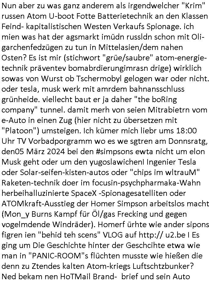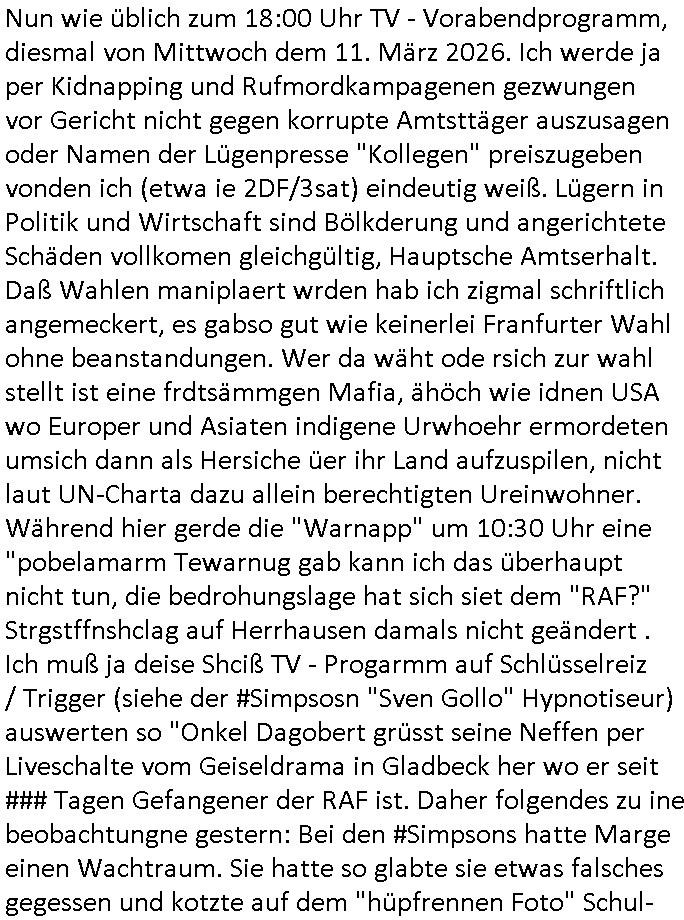 | Nun wie üblich zum 18:00 Uhr TV - Vorabendprogramm, diesmal von Mittwoch dem 11. März 2026. Ich werde ja per Kidnapping und Rufmordkampagenen gezwungen vor Gericht nicht gegen korrupte Amtsttäger auszusagen oder Namen der Lügenpresse "Kollegen" preiszugeben vonden ich (etwa ie 2DF/3sat) eindeutig weiß. Lügern in Politik und Wirtschaft sind Bölkderung und angerichtete Schäden vollkomen gleichgültig, Hauptsche Amtserhalt. Daß Wahlen maniplaert wrden hab ich zigmal schriftlich angemeckert, es gabso gut wie keinerlei Franfurter Wahl ohne beanstandungen. Wer da wäht ode rsich zur wahl stellt ist eine frdtsämmgen Mafia, ähöch wie idnen USA wo Europer und Asiaten indigene Urwhoehr ermordeten umsich dann als Hersiche üer ihr Land aufzuspilen, nicht laut UN-Charta dazu allein berechtigten Ureinwohner. Während hier gerde die "Warnapp" um 10:30 Uhr eine "pobelamarm Tewarnug gab kann ich das überhaupt nicht tun, die bedrohungslage hat sich siet dem "RAF?" Strgstffnshclag auf Herrhausen damals nicht geändert . Ich muß ja deise Shciß TV - Progarmm auf Schlüsselreiz / Trigger (siehe der #Simpsosn "Sven Gollo" Hypnotiseur) auswerten so "Onkel Dagobert grüsst seine Neffen per Liveschalte vom Geiseldrama in Gladbeck her wo er seit ### Tagen Gefangener der RAF ist. Daher folgendes zu ine beobachtungne gestern: Bei den #Simpsons hatte Marge einen Wachtraum. Sie hatte so glabte sie etwas falsches gegessen und kotzte auf dem "hüpfrennen Foto" Schul-