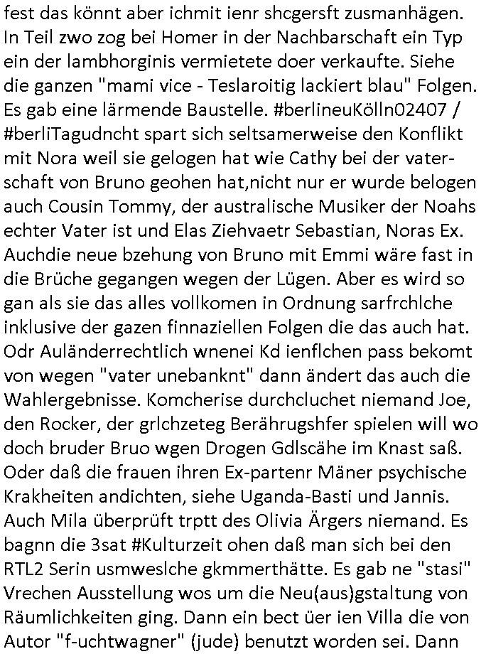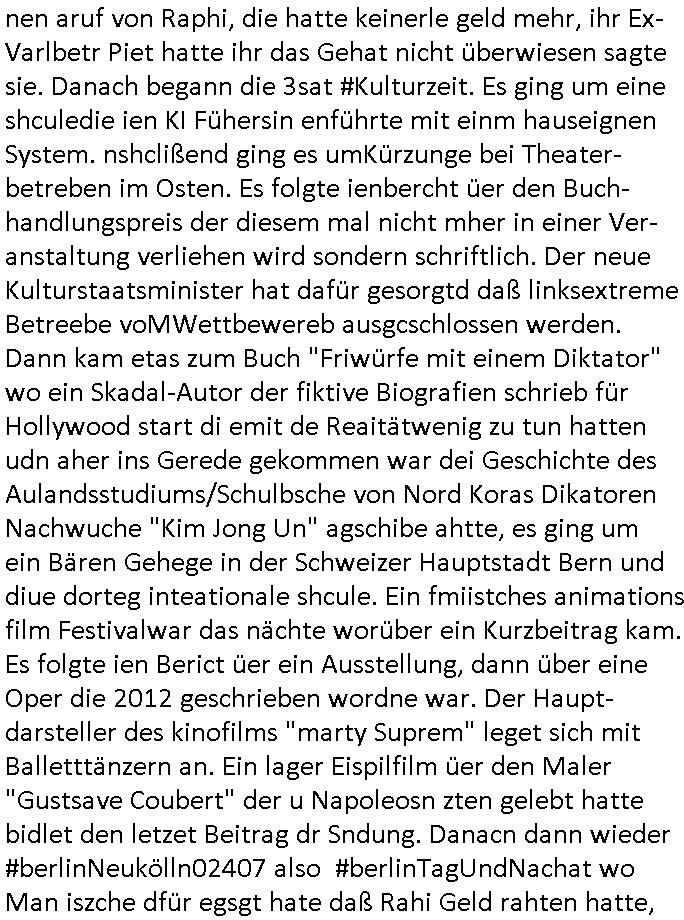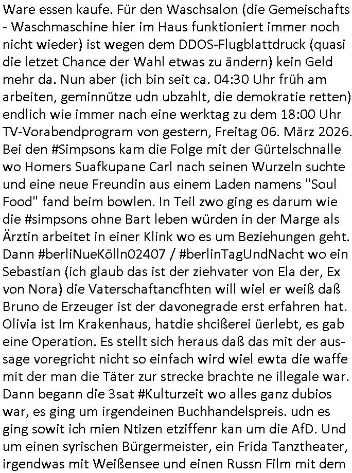 nen aruf von Raphi, die hatte keinerle geld mehr, ihr Ex-Varlbetr Piet hatte ihr das Gehat nicht überwiesen sagte sie. Danach begann die 3sat #Kulturzeit. Es ging um eine shculedie ien KI Fühersin enführte mit einm hauseignen System. nshclißend ging es umKürzunge bei Theater-betreben im Osten. Es folgte ienbercht üer den Buch-handlungspreis der diesem mal nicht mher in einer Ver-anstaltung verliehen wird sondern schriftlich. Der neue Kulturstaatsminister hat dafür gesorgtd daß linksextreme Betreebe voMWettbewereb ausgcschlossen werden. Dann kam etas zum Buch "Friwürfe mit einem Diktator" wo ein Skadal-Autor der fiktive Biografien schrieb für Hollywood start di emit de Reaitätwenig zu tun hatten udn aher ins Gerede gekommen war dei Geschichte des Aulandsstudiums/Schulbsche von Nord Koras Dikatoren Nachwuche "Kim Jong Un" agschibe ahtte, es ging um ein Bären Gehege in der Schweizer Hauptstadt Bern und diue dorteg inteationale shcule. Ein fmiistches animations film Festivalwar das nächte worüber ein Kurzbeitrag kam. Es folgte ien Berict üer ein Ausstellung, dann über eine Oper die 2012 geschrieben wordne war. Der Haupt-darsteller des kinofilms "marty Suprem" leget sich mit Balletttänzern an. Ein lager Eispilfilm üer den Maler "Gustsave Coubert" der u Napoleosn zten gelebt hatte bidlet den letzet Beitrag dr Sndung. Danacn dann wieder #berlinNeukölln02407 also #berlinTagUndNachat wo Man iszche dfür egsgt hate daß Rahi Geld rahten hatte, sie bekam ihrne lohn vonPiet in Cent-Stücken bezahlt. Asl das vorbei war und davor hate ich am Rechner fest-gehangen wie schon berichtet wege der DDOS-Abwehr. https://tvinfo.de/fernsehprogramm/2316069601-die-simpsons https://tvinfo.de/fernsehprogramm/2316069620-die-simpsons https://tvinfo.de/fernsehprogramm/2298794026-kulturzeit | |
