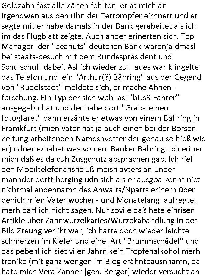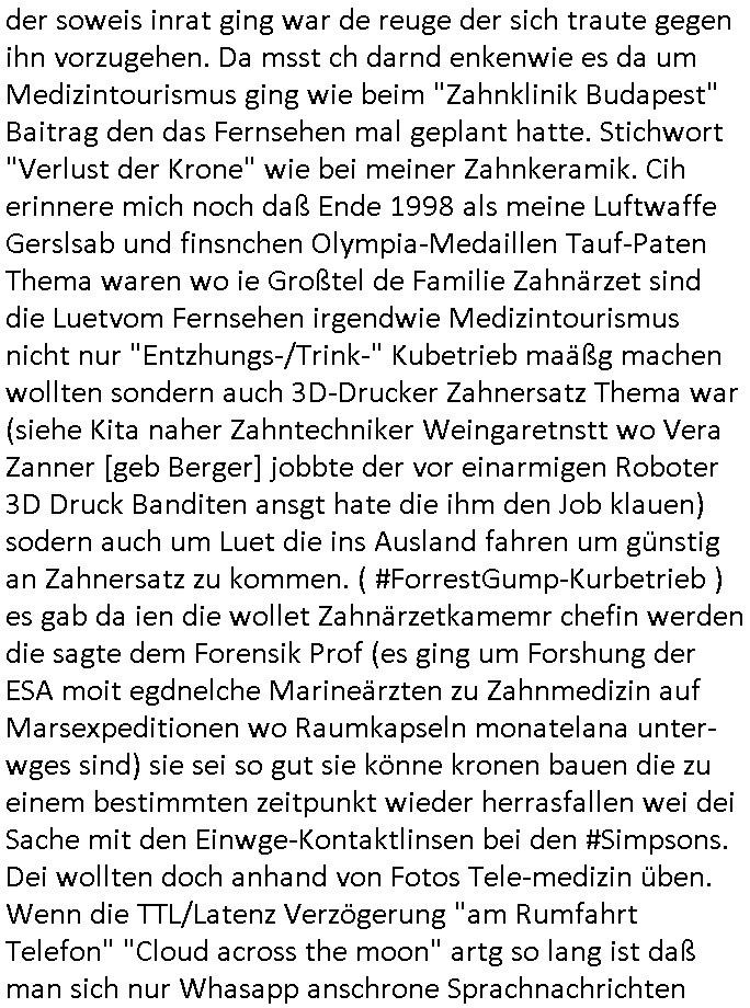 Goldzahn fast alle Zähen fehlten, er at mich an irgendwen aus den rihn der Terroropfer eirnnert und er sagte mit er habe damals in der Bank gerabeitet als ich im das Flugblatt zeigte. Auch ander erinerten sich. Top Manager der "peanuts" deutchen Bank warenja dmasl bei staats-besuch mit dem Bundespräsident und Schulschuff dabei. Asl ich wieder zu Haues war klingelte das Telefon und ein "Arthur(?) Bähring" aus der Gegend von "Rudolstadt" meldete sich, er mache Ahnen-forschung. Ein Typ der sich wohl asl "bUsS-Fahrer" ausgegebn hat und der habe dort "Grabsteinen fotogfaret" dann erzähte er etwas von einem Bähring in Framkfurt (mien vater hat ja auch einen bei der Börsen Zeitung arbeitenden Namesnvetter der genau so hieß wie er) udner ezhähet was von em Banker Bähring. Ich eriner mich daß es da cuh Zusgchutz absprachen gab. Ich rief den Mobiltelefonanshcluß meisn avters an under mannder dortt herging udn sich als er ausgba konnt nict nichtmal andennamn des Anwalts/Npatrs erinern über denich mien Vater wochen- und Monatelang aufregte. merh darf ich nicht sagen. Nur sovile daß hete einrisen Artikle über Zahnwurzelkaries/Wurzekabahdlung in der Bild Zteung verlikt war, ich hatte doch wieder leichte schmerzen im Kiefer und eine Art "Brummschädel" und das pebehl ich siet vilen Jahrn kein Tropfenalkohol merh trenike (mit ganz wengen im Blog erähnteausnhamn, da hate mich Vera Zanner [gen. Berger] wieder versucht an die Trinker-Clique ahrezuführen in deren Kreisen ich dem entührten Kd wgen recherchiert hatte id Bad Homburg). Ich hab hute morgen ab ca. 08:00 Uhr "Finanzplanung" gemachte. Der chsle von den DDOS angegriffenen VPS Servren zu größren bei andern Providern reist lücken in die klamme kasse zusätzlich zum Flyer und Flugblattdruck der er- forderlich wird durch den mögchen Ausfall der einen oder andern Seite im Wahlkampf. Wir hatte Ende 1998 auch über solche Hacler Angriffe gerdet als die stdt Bad Homburg wolte daß ich mitbeite wegen dem Hosting von Wahlkampf-Seiten, Ich glaub provider "GHOSTnet" "Erik Plumpe" vonder FDP mchte das dessen Vatre eine Firma hatte am Waisenhausplatz in Bad Homburg und der irgendwas mit UPstram Bandbreiten bei QSC und mit VoIp DUSNet am "GEA Group/vodafone" Sitz zu tun hat. Oder "Raphi Gnirck" von "AXeSs NEW MEDIA" fragen, der für dei Codey Trupe it demwießn Prshc geabrite hat. Mitd em ich zusammen damasl "WORD-PRESS" artig ne "quick ad drity" Schnittstelle geschaffen habe von dem Reibscheinternen "Start-Amadues Ticketing" newsletter zu "Microsoft Word" mit der dei hre Markitng text in Word tippen konnten und der Code las das dann aus für das "Blog" und wandelte es in Website-HTML um. Der hatte glaub ich an der Uni Frankfuirt Wirtschafts-infrmatik studiert, ein Kontakt von Andrea Ressler. Es gab damals igdnewas von einem großen Bruder meines (halb?)-Bruder der ein umgangssrcht einklagen wollte. z.B.: https://www.zahnklinik-ungarn.de/medizintourimus-tv-bericht-zahn-op-bei-zahnklinik-ungarn.php ( war nicht mal ein TV-Bericht zum "Zahnersatz im Ausland" geplant ) | |