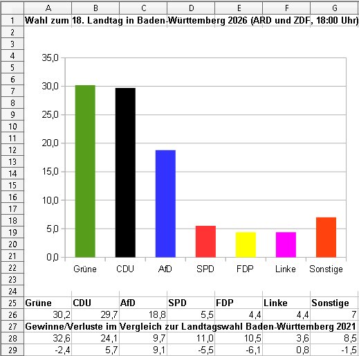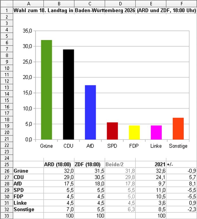 ARD (18:00) ZDF (18:00) Beide/2 2021 +/- Grüne 32,0 31,5 31,8 32,6 -0,9 CDU 29,0 30,5 29,8 24,1 5,7 AfD 17,5 18,0 17,8 9,7 8,1 SPD 5,5 5,5 5,5 11,0 -5,5 FDP 4,5 4,5 5,0 10,5 -5,5 Linke 4,5 4,5 4,5 3,6 0,9 Sonstige 7,0 5,5 6,3 8,5 -2,3 100 100 100 https://www.zdfheute.de/politik/deutschland/landtagswahl-baden-wuerttemberg-prognose-hochrechnung-ergebnisse-liveticker-100.html https://www.tagesschau.de/wahl/archiv/2026-03-08-LT-DE-BW/index.shtml https://de.wikipedia.org/wiki/Landtagswahl_in_Baden-W%C3%BCrttemberg_2026 | |