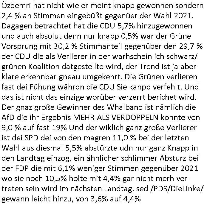 | Özdemri hat nicht wie er meint knapp gewonnen sondern 2,4 % an Stimmen eingebüßt gegenüer der Wahl 2021. Dagagen betrachtet hat die CDU 5,7% hinzugewonnen und auch absolut denn nur knapp 0,5% war der Grüne Vorsprung mit 30,2 % Stimmanteil gegenüber den 29,7 % der CDU die als Verlierer in der warhscheinlich schwarz/ grünen Koalition datgestellte wird, der Trend ist ja aber klare erkennbar gneau umgekehrt. Die Grünen verlieren fast dei Fühung währdn die CDU Sie kanpp verfehlt. Und das ist nicht das einzige worüber verzerrt berichet wird. Der gnaz große Gewinner des Whalband ist nämlich die AfD die ihr Ergebnis MEHR ALS VERDOPPELN konnte von 9,0 % auf fast 19% Und der wiklich ganz große Verlierer ist dei SPD dei von den magren 11,0 % bei der letzten Wahl aus diesmal 5,5% abstürzte udn nur ganz Knapp in den Landtag einzog, ein ähnlicher schlimmer Absturz bei der FDP die mit 6,1% weniger Stimmen gegenüber 2021 wo sie noch 10,5% holte mit 4,4% gar nicht merh ver-treten sein wird im nächsten Landtag. sed /PDS/DieLinke/ gewann leicht hinzu, von 3,6% auf 4,4%