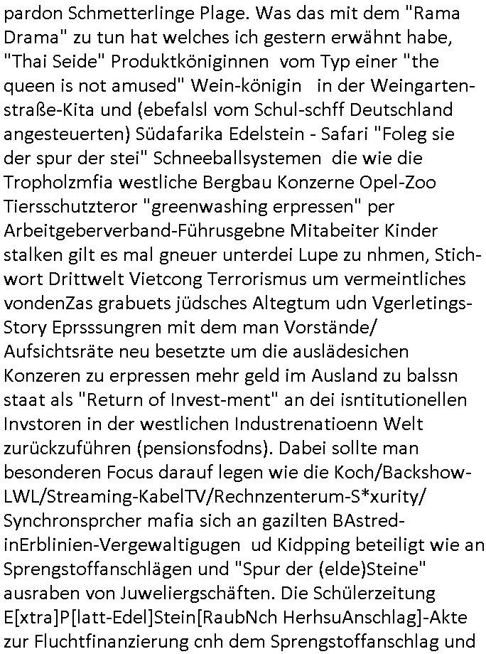 pardon Schmetterlinge Plage. Was das mit dem "Rama Drama" zu tun hat welches ich gestern erwähnt habe, "Thai Seide" Produktköniginnen vom Typ einer "the queen is not amused" Wein-königin in der Weingarten-straße-Kita und (ebefalsl vom Schul-schff Deutschland angesteuerten) Südafarika Edelstein - Safari "Foleg sie der spur der stei" Schneeballsystemen die wie die Tropholzmfia westliche Bergbau Konzerne Opel-Zoo Tiersschutzteror "greenwashing erpressen" per Arbeitgeberverband-Führusgebne Mitabeiter Kinder stalken gilt es mal gneuer unterdei Lupe zu nhmen, Stich-wort Drittwelt Vietcong Terrorismus um vermeintliches vondenZas grabuets jüdsches Altegtum udn Vgerletings-Story Eprsssungren mit dem man Vorstände/ Aufsichtsräte neu besetzte um die auslädesichen Konzeren zu erpressen mehr geld im Ausland zu balssn staat als "Return of Invest-ment" an dei isntitutionellen Invstoren in der westlichen Industrenatioenn Welt zurückzuführen (pensionsfodns). Dabei sollte man besonderen Focus darauf legen wie die Koch/Backshow-LWL/Streaming-KabelTV/Rechnzenterum-S*xurity/ Synchronsprcher mafia sich an gazilten BAstred-inErblinien-Vergewaltigugen ud Kidpping beteiligt wie an Sprengstoffanschlägen und "Spur der (elde)Steine" ausraben von Juweliergschäften. Die Schülerzeitung E[xtra]P[latt-Edel]Stein[RaubNch HerhsuAnschlag]-Akte zur Fluchtfinanzierung cnh dem Sprengstoffanschlag und die #babyloHnBerlin Lüge von jüdischem NS-Raubgold. In teil zwo kam herus daß Klauwn KrusteY kienerlei junge zsuchauer mehr hat. Siehe "chaplin Immobilien": "Jauch kauft FrühstscksTV Bülow-bogen Villa von Loriot" Schlagzeile in der bIld Zeitung. Hat das wasmit gekidnappten Kindern zu tun und jüdischer Alteigentums erpssung udn geTÜRKTen Greenwashing-Lüge Wahlen, Stichtwort Enteigung per "Dauerbenner" Heizkosten Hammr "penust die bnak zal elles makler" Inszeierung? Krsuyt hat Dagboert Dcu artge "Dollar Zeichen" Augen wie sich herausstellt nicht vom Kotaktlinsen Debakel sodenr von einer missglückten Laser-Augen-OP. Da es imCLown Gschäft nichstmerh zu evdien gibt gründet er eine Clown-shcule um TV-nachwuchs zur abeistlosgkiet heranzubilden. Während der Scheidubsgvater Milhouse dort Geld ausgibt (Ültjie Penauts un Cokes, die deutschce bank zahlt den angeristen Poltikern alles an Spesen beim Staatsbesuch aifder boschafts gelände Charity? wos um Satstagst Darmklinik Besuche nach Thai Essen geht) will Mafai-Boss Fed Tony per Schutzgeld-erpssungder shcule mitverdienen. siehe immobilietgeung Gedlwäschevowruf schweizer shcule bangkok. Washat dasnur mit Loriots/Krustys Vila zu tun wo inienr andern Folge die Gerichts-vollzieher anrücken um seinen "Shettland Delphin" zu pfänden (siehe hcohdelie Kita-Reiterclique Ponyhof)? Zum shcluß jedenfalls ist dank Klauwns die neue schule vollkommen abgebrannt. Was das wohl mit der Osblock RAF Teoristen Edlstien Mfai zu tun hat die Esienerz bergbau -Dschgecamsp welticehr kozren erpressn wollte? Der "Thai Silk weddingplaner Mafia"? hab ich gelch sochma waserzäht ovm giatsche Lohgefälle in Tailand? Wo der Adel im Luxus lebt wärnd die bölkerung arm ist? Das tahlässhc Köngshaus zählt zuden reichsten der Welt. "die da benw rdn imer richer" ist ienwishiat aus Asien dei ncht mit dsuchen managern z tun hat sodern Aisaten Aldigen die im ausland eigebvölkerung ausbeuter-lohn-dumping geld bunkern hab ich mal gehört. wo kommt eigentlch die Kohel für koch-und backshow-Tiktok her? Da zäht ajauchdie Serie #Simposn dazu wo Matt Groenig imemr iderdaraf hiwest daß in Südostasien gezeichnet wird des gloablen Lohngefälles wegen,Aisn ausbutung. genüer dem "Bürgeramt" "Zeil 1, 6031X frankfurt a.M." gibt es einen Nepal-Begwandern Shop, an der EZB den "deutche bank Seilschaften werbung" Kletterbedarf. Kanzlerin Merkauaging ja gerne in Tirol begwandern. Man schottet sich eben gerne ab vod en "neureichen" fredtsämmigen Aurtzsnderer-schneeball-sytem Ver-brechern die uMgene geld üer ienGration zuamstragen wofür oedtlich Fmilien hudrte jahre brauchen, si da Respkt angebrcht doe reher nicht, da Dorge/Zuhältrei Mafia? Wir eirnenr usn Thai-amssuesn Lohdumping Import. Dann was ganz anderes #berliNukölln02407 also #berliTagUndNacht. Die Chiara hatte Geburtstag auf dem hausboot und krätze macht "Pancakes" o mit Dressing/Sirup für den gerde der Zoll ehröht wurde von trump ist nicht bekannt. Bei Joe in der WG gabs Ärger.KArim aht desn Kelein im Bademantel mit verhüllten haaren gesehn und nun glaubt Joe daß sich karim da ein "sexy Dusch Video"-Kopfkino draus bastelt. Und as nachdem Indira gerde die sltylscihe asiatischen Pyiamas eingeführt hat dei ein wenig nach Satin-stickerei aus-sehen. (hasen Aus dem Simspons-playDude magazin). In der kneipe Crash tauchte ein Emmi Dopplgägrein Lookalike Double auf. Dan bagennd ie 3sat #Kulturzeit: Es ging um die "axis of evil". die Südflanke von UdSSR Russland zu nahen Osten hin. Woe die Araber und die Briten den Gas/Ölmarkt neu ordne wollten nach der wende. "misson accomplished" vidos under "arabosche frühling" nach dem Sturz Gaddhafis in "lybien". Und es ging um die Papst-dynastie-wahl im Iran. Nch dem attata auf "Johannes paul II"udn den agrff nicht etwas ufden avtikansodrn uaf das WTC/pentagon aus "riliösen motiven?" bei 9/11 hatman ja nun aus Rache mal nen Ober-Mullah weggebombt. Der was ggen unverhüllte Dsuchvidos hat. Der Ölpreis ist von 70 US$ auf 110 US$ gestiegen, die Tendenz geht wieter aufwärts. Ob das bis zur Klimakleber "Heizkosten Hammer Enteignung" im nächsten Winter so bleibt? Danach wurde "Als Mutter streikte" zum Thema, das war 1975 in Skandinavien. In meinem Geburtsjahr da war ich drei, vier Monate alt und ein Milumil - Flaschenkind wie auf diesem "Eisbär Knut" Bärenmarke Logo. Mütre könenkder ja nicht allein lassen mit den Vätren wegen der Muttermilchpumpen und dem Fühgberonen Milchliuver aus Firdischdorf/Ts. . Wir erinnern uns: naglenue A400M Lufbrücke Trasporter Bilder dei Militärs für "new model army" wah