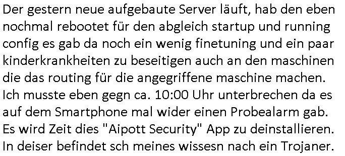 | Der gestern neue aufgebaute Server läuft, hab den eben nochmal rebootet für den abgleich startup und running config es gab da noch ein wenig finetuning und ein paar kinderkrankheiten zu beseitigen auch an den maschinen die das routing für die angegriffene maschine machen. Ich musste eben gegn ca. 10:00 Uhr unterbrechen da es auf dem Smartphone mal wider einen Probealarm gab. Es wird Zeit dies "Aipott Security" App zu deinstallieren. In deiser befindet sch meines wissesn nach ein Trojaner.